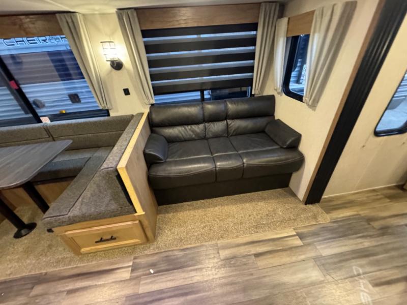 If the open road is calling your name, then answer it with one of these Forest River Cherokee travel trailers or toy haulers! A seamless roofing membrane with heat reflectivity covers these units and an armored underbelly tank enclosure protects it from road debris. The Power Gear frame technology holds them together and also comes with a space saver rail design. An outside shower with hot and cold water helps to keep the dirt outside where it belongs. With the Campfire package, you will get a beautiful entertainment center to watch your favorite movies, a sink cover for more prepping space, and a 6 gallon DSI gas/electric water heater for hot showers each morning. The Cherokee Total Control app and remote control system allows you to control your unit at the touch of a finger. A few other features you will appreciate include a super kitchen, USB charging station, and light filtering sheer shading premium blackout zebra shades for added privacy. Come find your favorite model today!