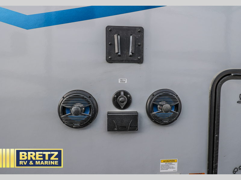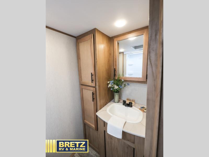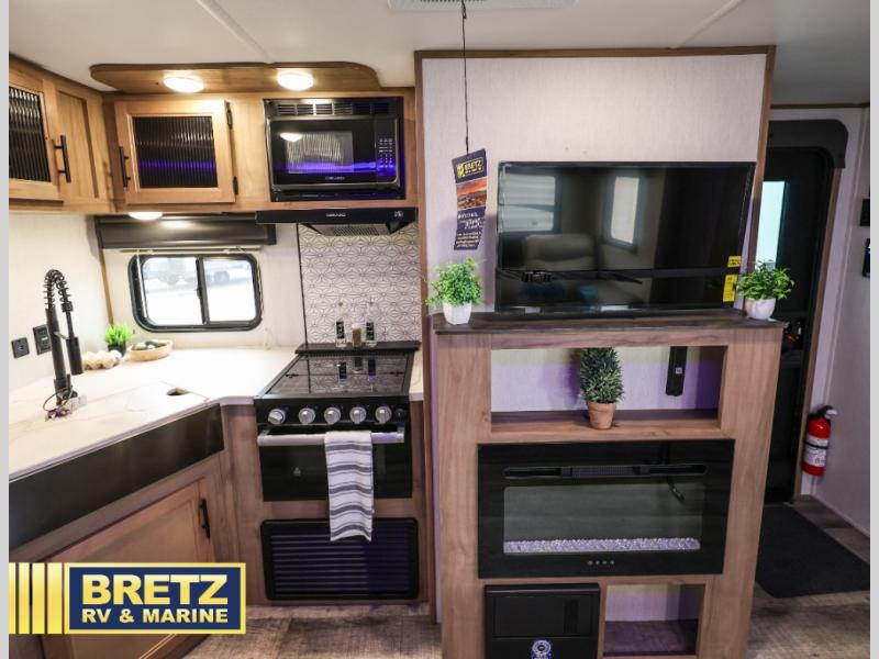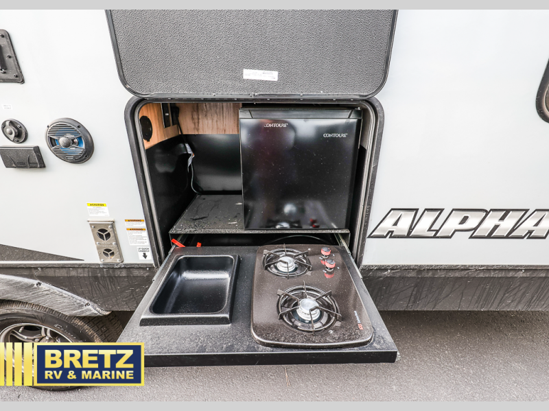 Looking for the perfect trailer for two with a spacious bathroom and bedroom? This Alpha Wolf provides a rear oversized bathroom complete with linen storage and a barn-style door that saves space and looks great. The front bedroom includes a walk-around queen bed, dual shirt closets and nightstands, a farm-style door plus windows for natural lighting and great views. The main living and kitchen area is spacious as well with a large slide out that includes a theatre seat with a removable table, a 12V residential refrigerator for lots of cold storage, and a pantry for your snacks and dry goods. You can decide to cook indoors on the three burner cooktop, or head outdoors to cook on the deluxe outside kitchen, complete with a two burner cooktop, a refrigerator, a sink, and ice!