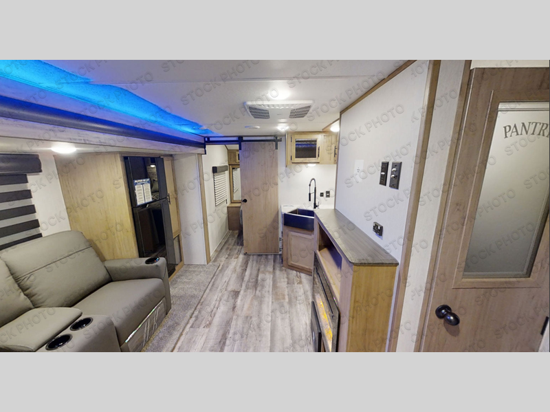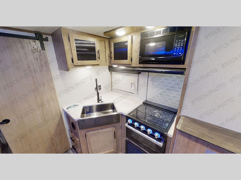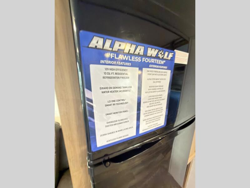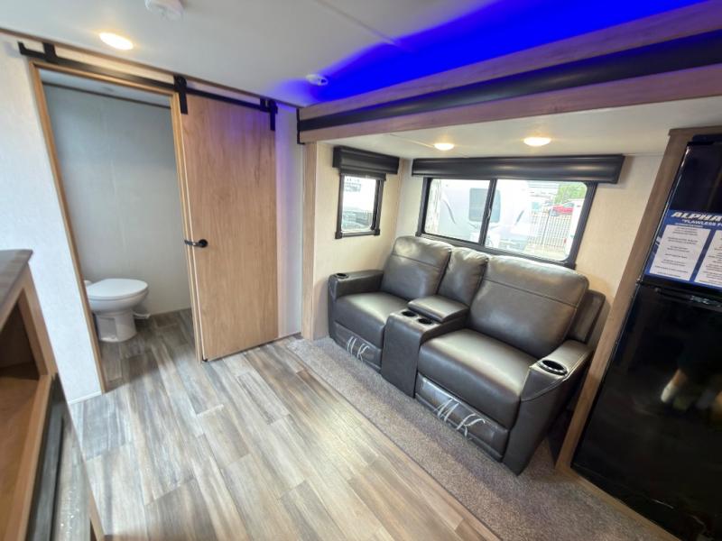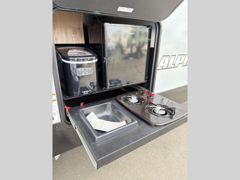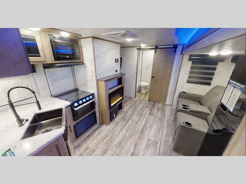 Looking for the perfect trailer for two with a spacious bathroom and bedroom? This Alpha Wolf provides a rear oversized bathroom complete with linen storage and a barn-style door that saves space and looks great. The front bedroom includes a walk-around queen bed, dual shirt closets and nightstands, a farm-style door plus windows for natural lighting and great views. The main living and kitchen area is spacious as well with a large slide out that includes a theatre seat with a removable table, a 12V residential refrigerator for lots of cold storage, and a pantry for your snacks and dry goods. You can decide to cook indoors on the three burner cooktop, or head outdoors to cook on the deluxe outside kitchen, complete with a two burner cooktop, a refrigerator, a sink, and ice!