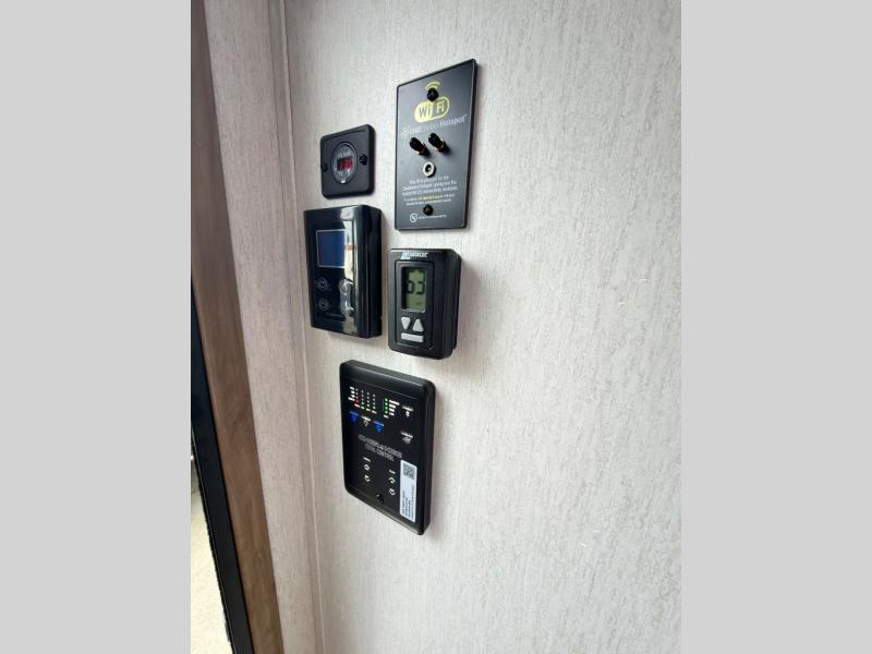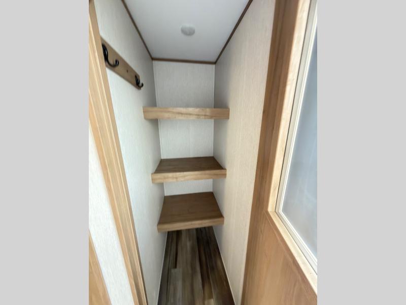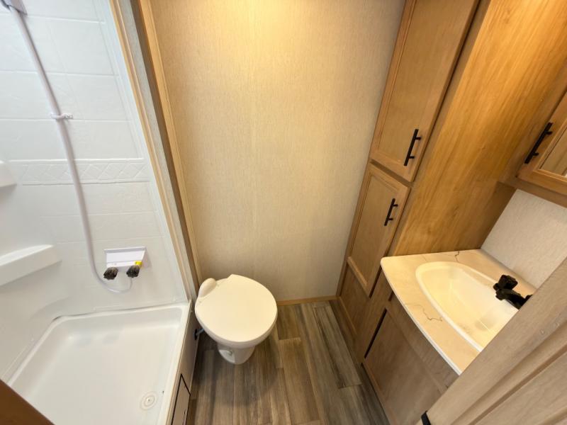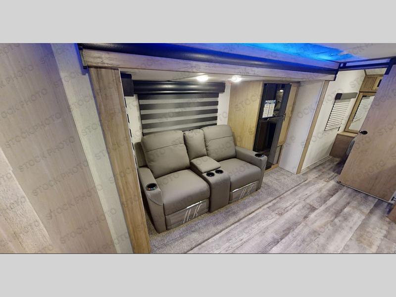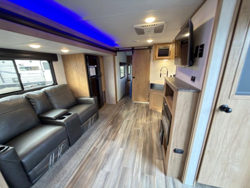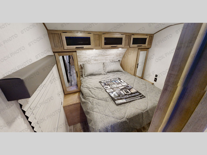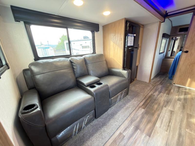 Looking for the perfect trailer for two with a spacious bathroom and bedroom? This Alpha Wolf provides a rear oversized bathroom complete with linen storage and a barn-style door that saves space and looks great. The front bedroom includes a walk-around queen bed, dual shirt closets and nightstands, a farm-style door plus windows for natural lighting and great views. The main living and kitchen area is spacious as well with a large slide out that includes a theatre seat with a removable table, a 12V residential refrigerator for lots of cold storage, and a pantry for your snacks and dry goods. You can decide to cook indoors on the three burner cooktop, or head outdoors to cook on the deluxe outside kitchen, complete with a two burner cooktop, a refrigerator, a sink, and ice!