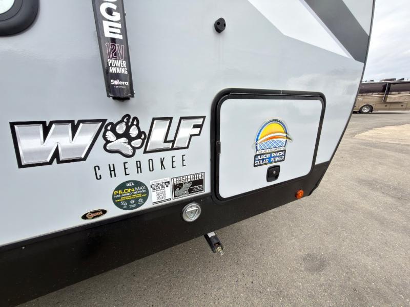 With any Cherokee Alpha Wolf travel trailer by Forest River you'll enjoy outstanding amenities, quality construction, and an affordable price. Each model features a "ToughBend" rigid skirt metal design, 5/8" tongue and groove plywood floor decking, and a "SuperTruss" roof structure that will hold up through years of camping memories. There is EZ-Clean deluxe kitchen backsplash indoors, along with an LED interior lighting package, a deluxe furniture pack, and many more comforts. These travel trailers include a utility center convenience light so you can easily check tank levels, and the outdoor TV prep means you can bring along your television for the big game. The Limited Package, Weather Guard Package, and Convenience Package include additional features found on select models, and there available options that can be added to further customize your Cherokee Alpha Wolf!
