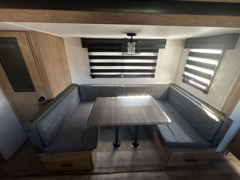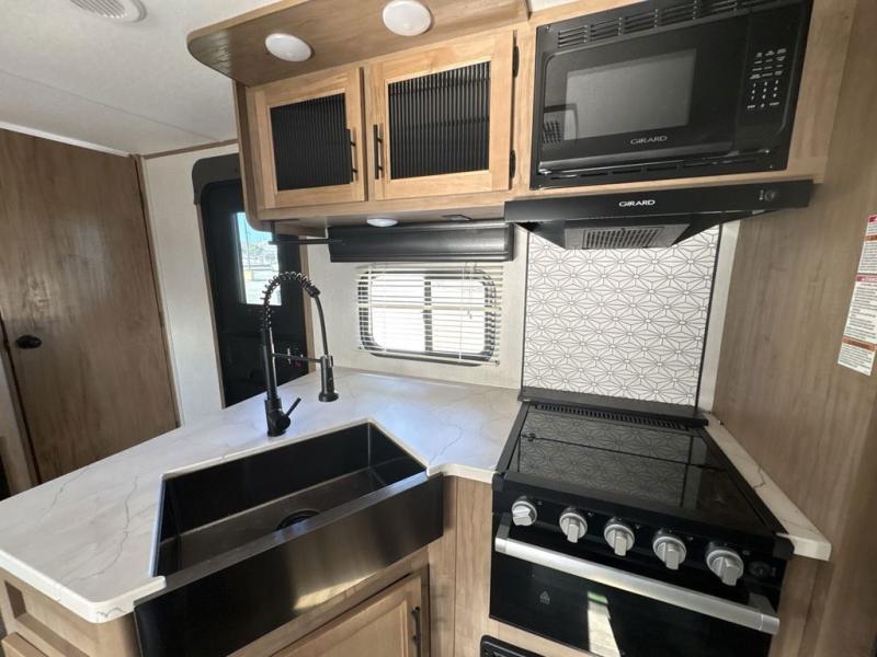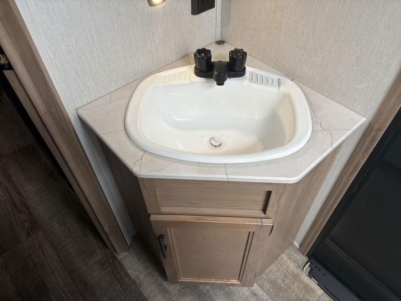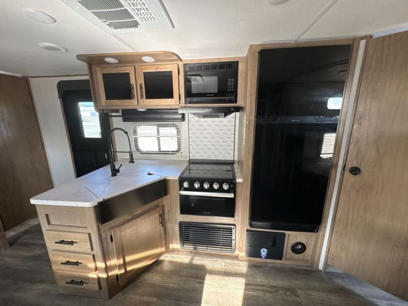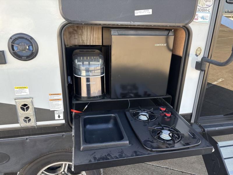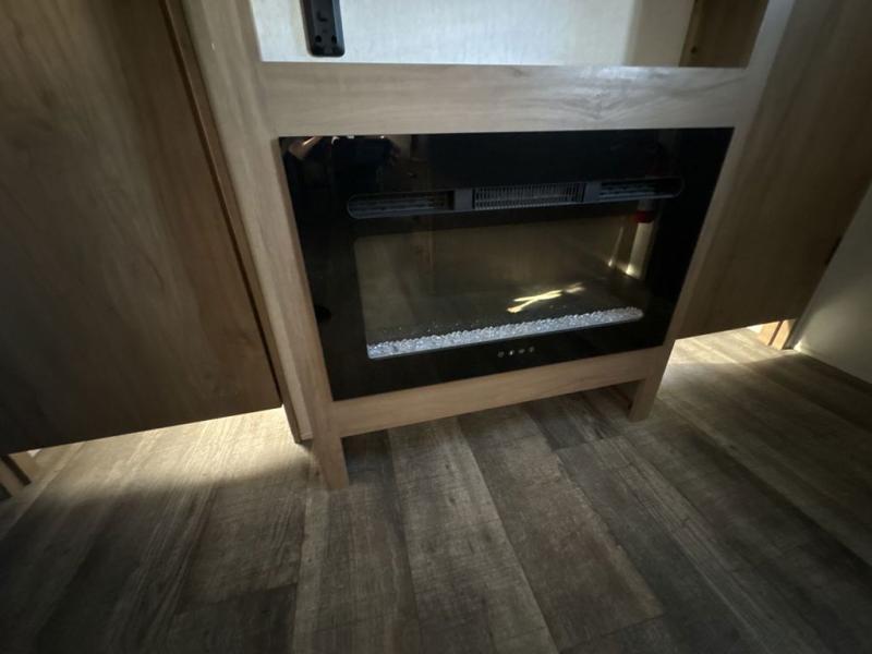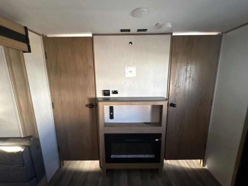 Get ready for fun with your group in this multi-sleeper trailer that offers double-size bunks with a ladder next to a full bathroom which features a second exterior entry door. The camp chef will appreciate a deluxe outside kitchen, and the full pass-through storage will make it easy to keep things neatly tucked away when not in use. Back inside, there is a U-shaped dinette for dining, playing games and additional sleeping space as well. You will also find a walk-in pantry and full kitchen amenities including a farm-style sink and a 12V residential refrigerator. The fireplace is another highlight in the main area, and the double entry bedroom means you won't have to climb over the bed to get to your side.