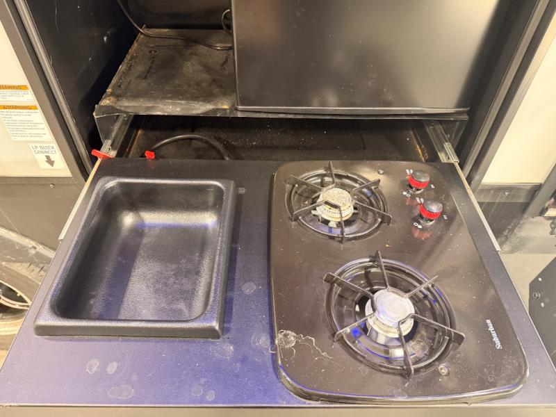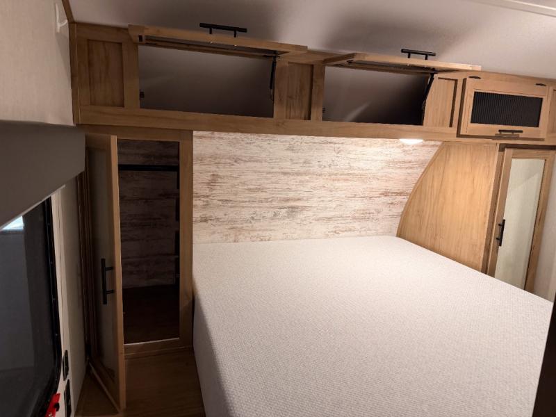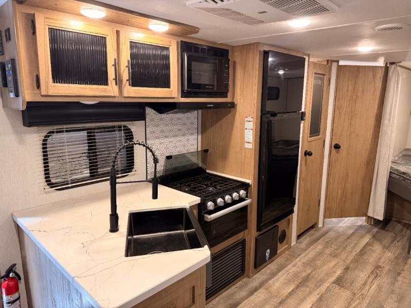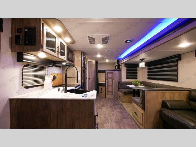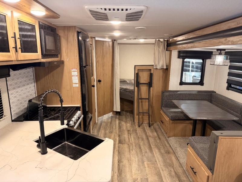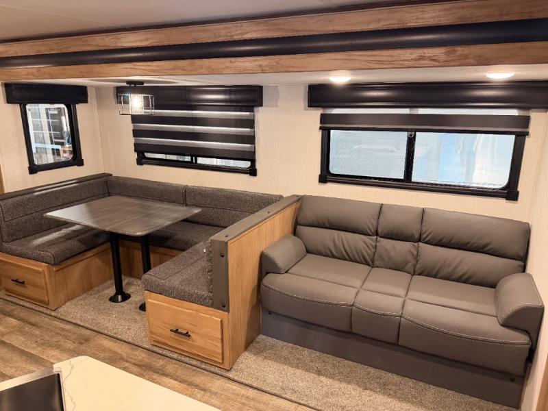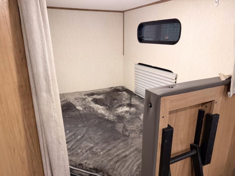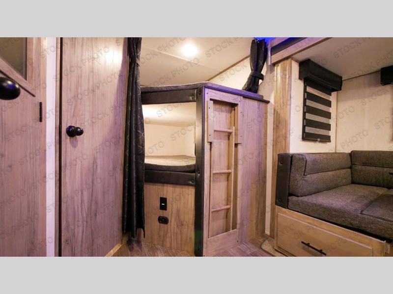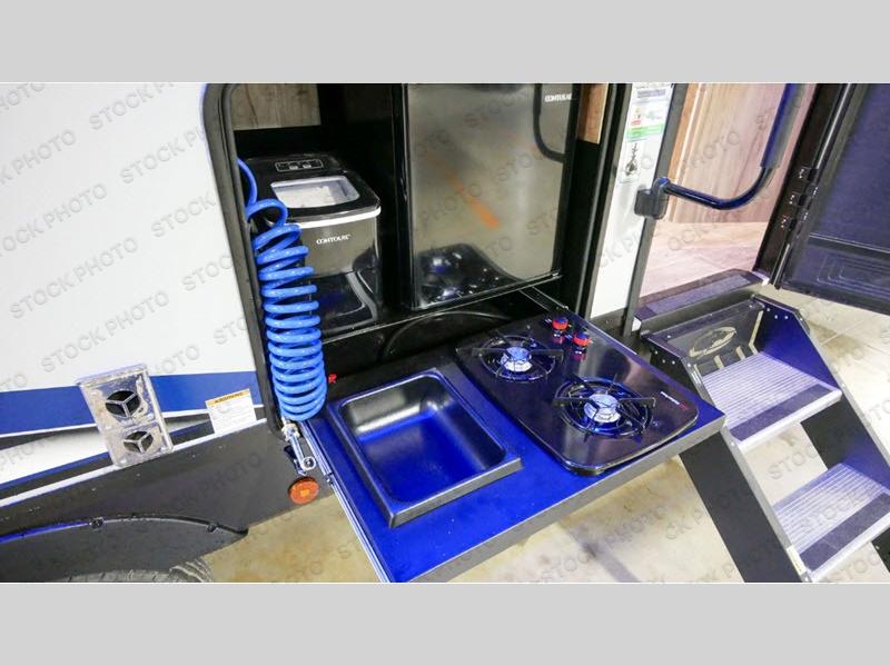 Looking for a multi-sleeper trailer to sleep nine to ten happy campers? You've found it in this dual entry model with a deluxe outside kitchen, double-size bunks, and a large slide out! The main living and kitchen area has a U-shaped dinette to utilize as a dining table, game table, work station, and/or an extra sleeping space. You will also find a walk-in pantry and full kitchen amenities including a farm-style sink, a residential refrigerator, and dual pots and pans drawers. The exterior provides a 20' awning for an outdoor living area, a pass-through storage, plus removable and adjustable steps for convenience. You will also appreciate the Juice Pack that comes with a 100W solar panel, a Series 27 battery, a 30 AMP solar charger, and more!