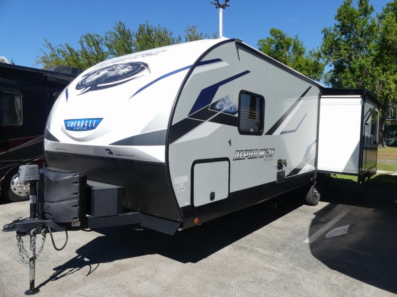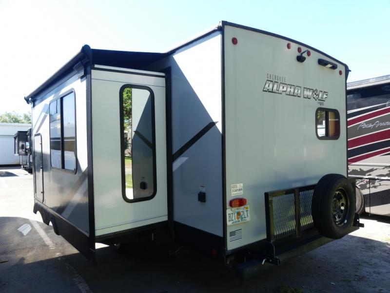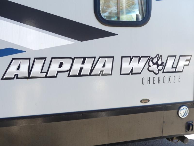 With any Cherokee Alpha Wolf travel trailer by Forest River you'll enjoy outstanding amenities, quality construction, and an affordable price. Each model features a "ToughBend" rigid skirt metal design, 5/8" tongue and groove plywood floor decking, and a "SuperTruss" roof structure that will hold up through years of camping memories. There is EZ-Clean deluxe kitchen backsplash indoors, along with an LED interior lighting package, a deluxe furniture pack, and many more comforts. These travel trailers include a utility center convenience light so you can easily check tank levels, and the outdoor TV prep means you can bring along your television for the big game. The Limited Package, Weather Guard Package, and Convenience Package include additional features found on select models.