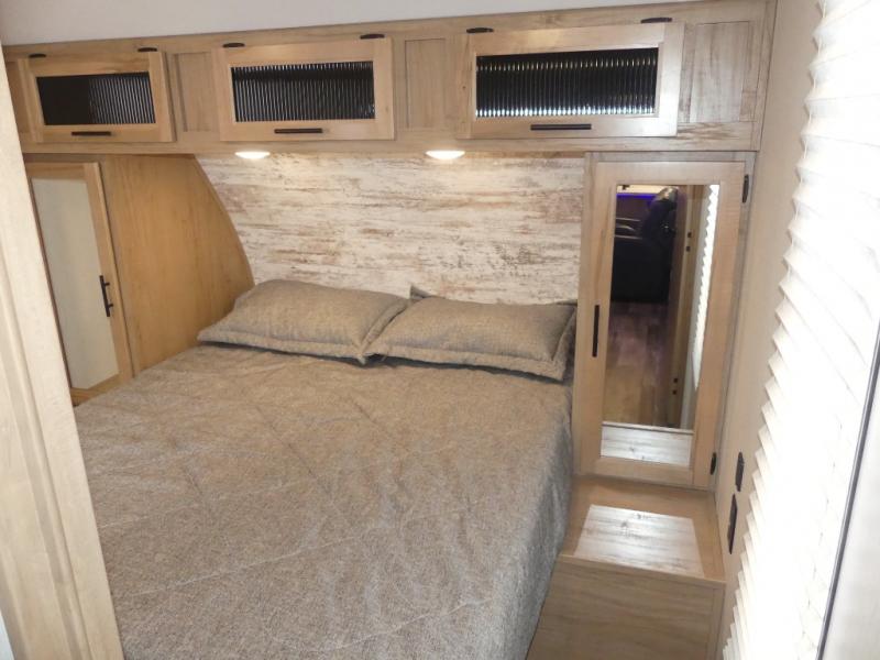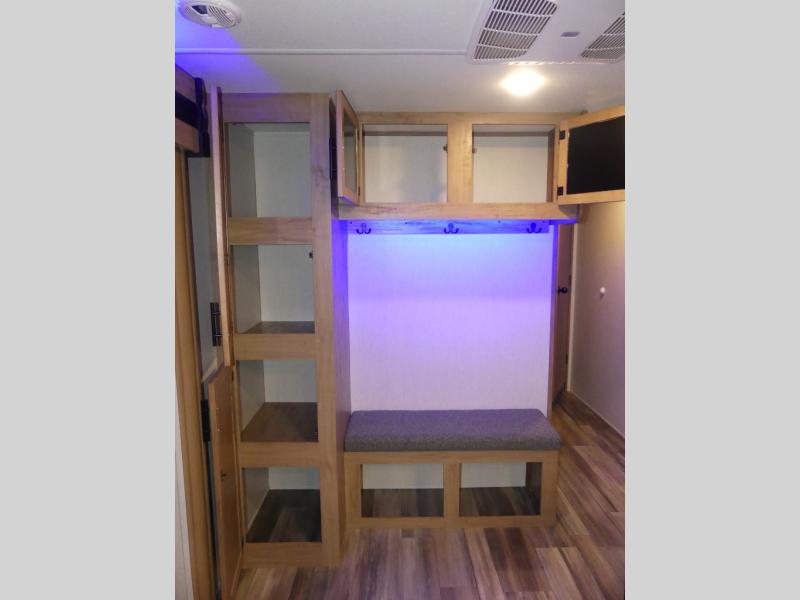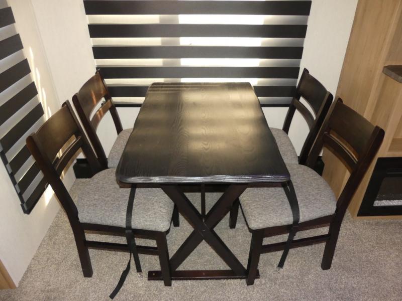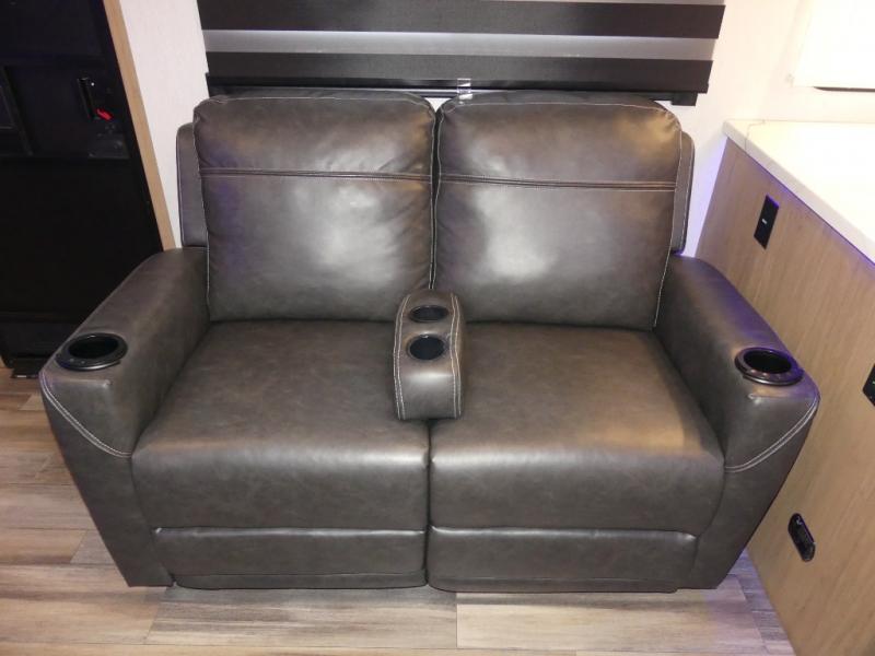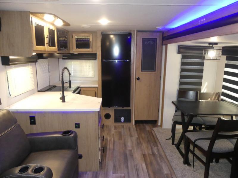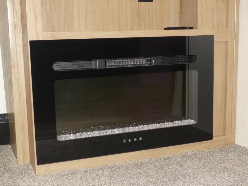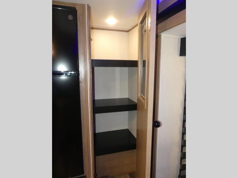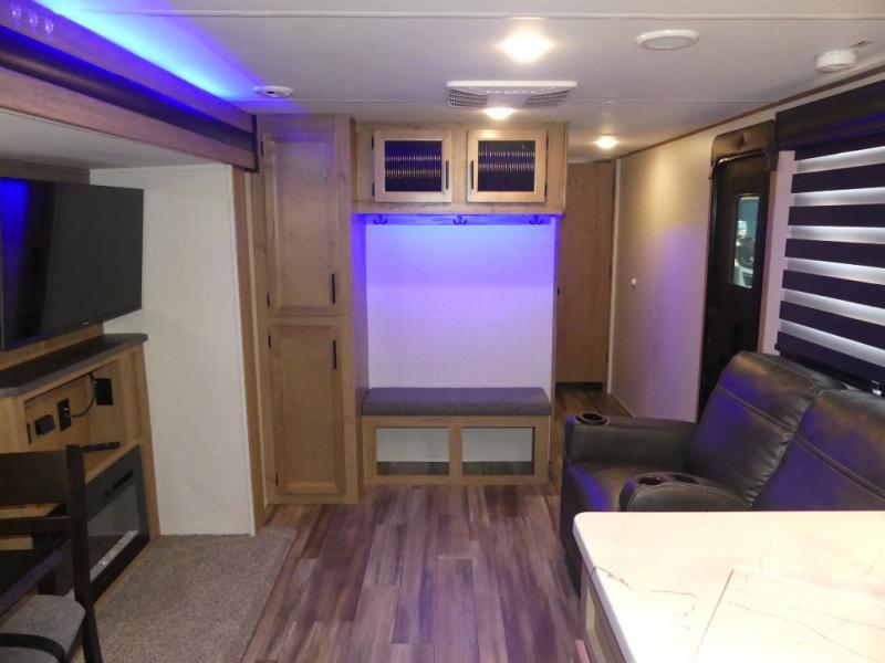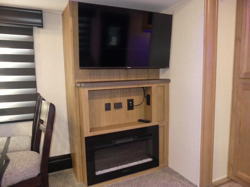 When you are looking for a couples trailer, you might want to stop your search after stepping inside this one! Some of highlights include theater seating to relax in while enjoying the fireplace, a walk-in pantry, and a large slide out. You can dine at the free-standing table with two fixed chairs and two folding chairs, and this space is great if you need a work area. There is bench seating with storage allowing you to sit down while taking off your shoes, plus overhead storage for belongings. The double entry bathroom is convenient, and the front bedroom offers a queen bed with two sides of storage, plus windows for cross-ventilation when you want some fresh air inside.