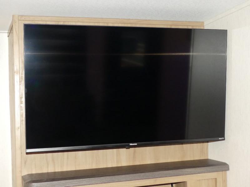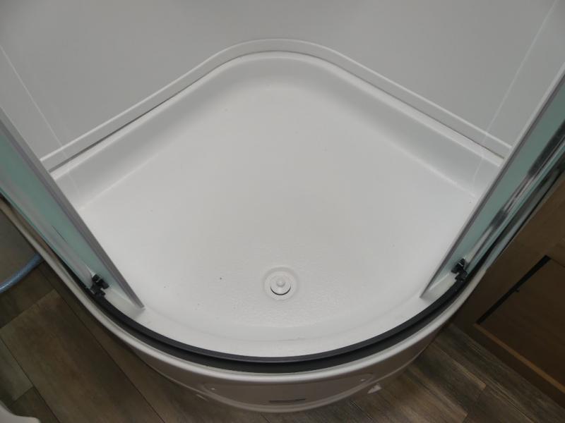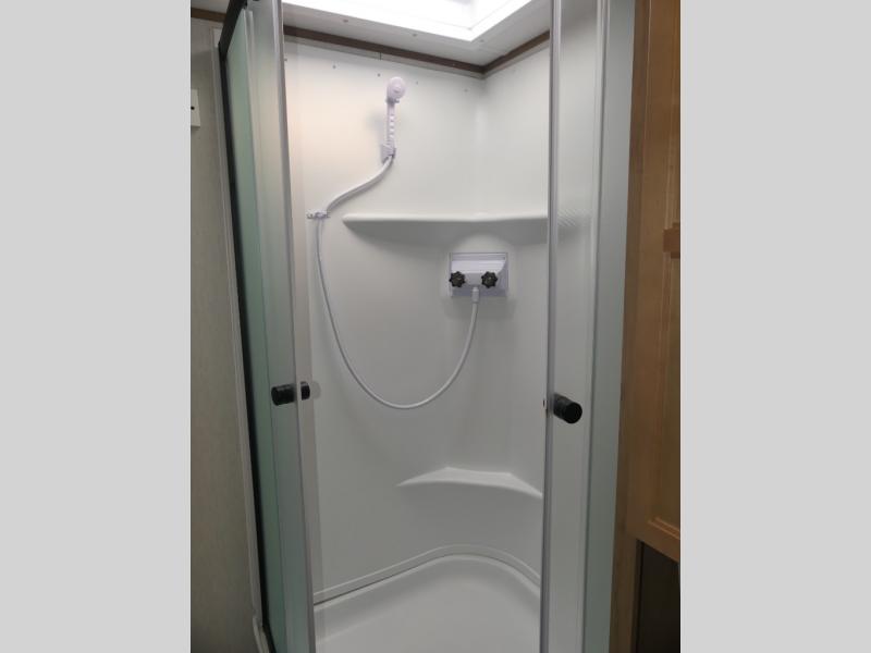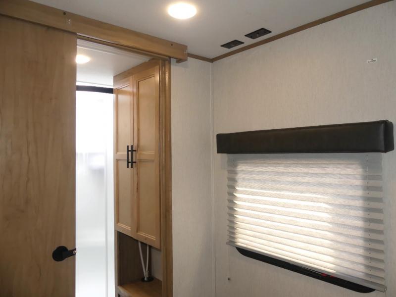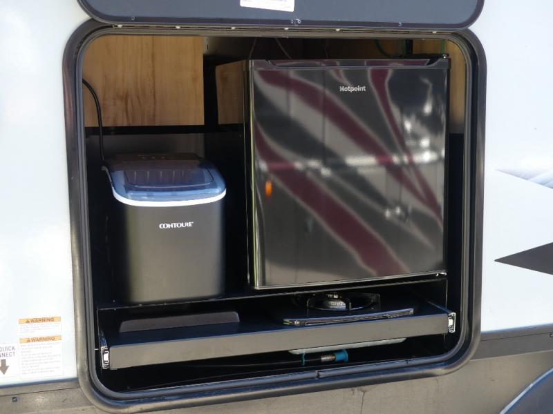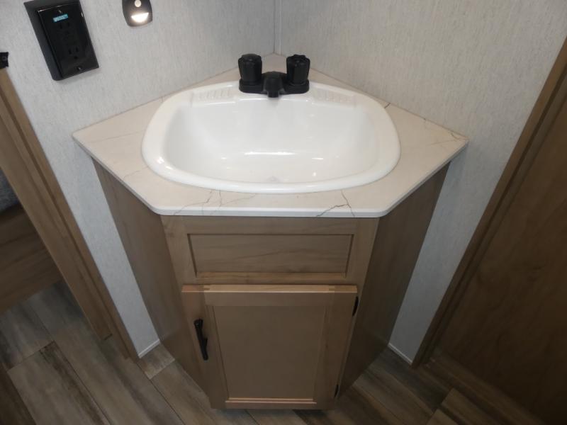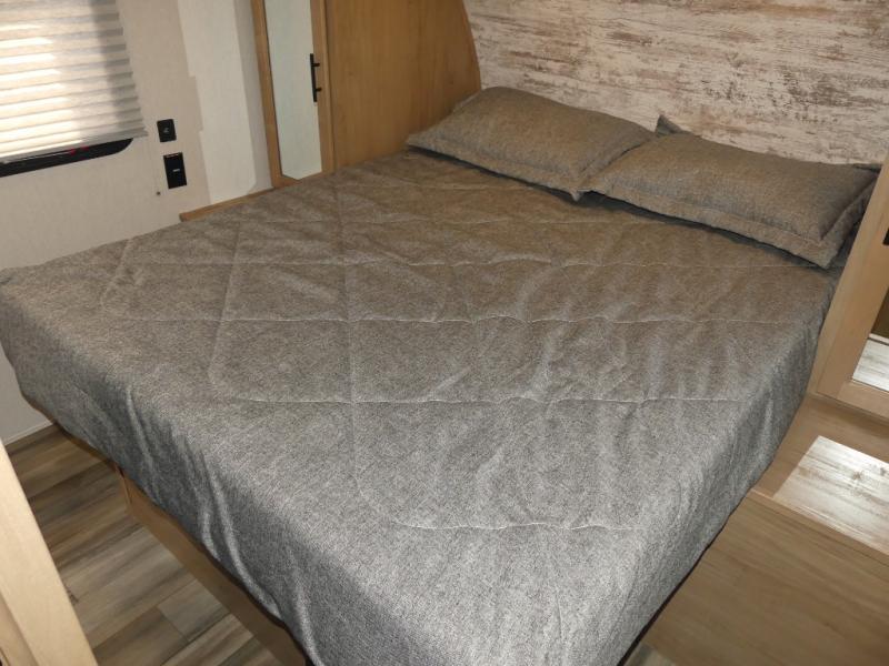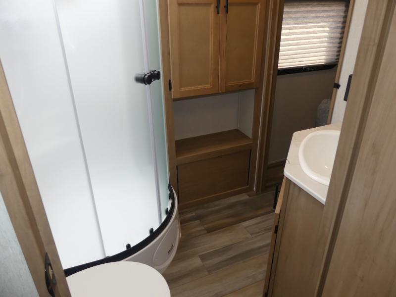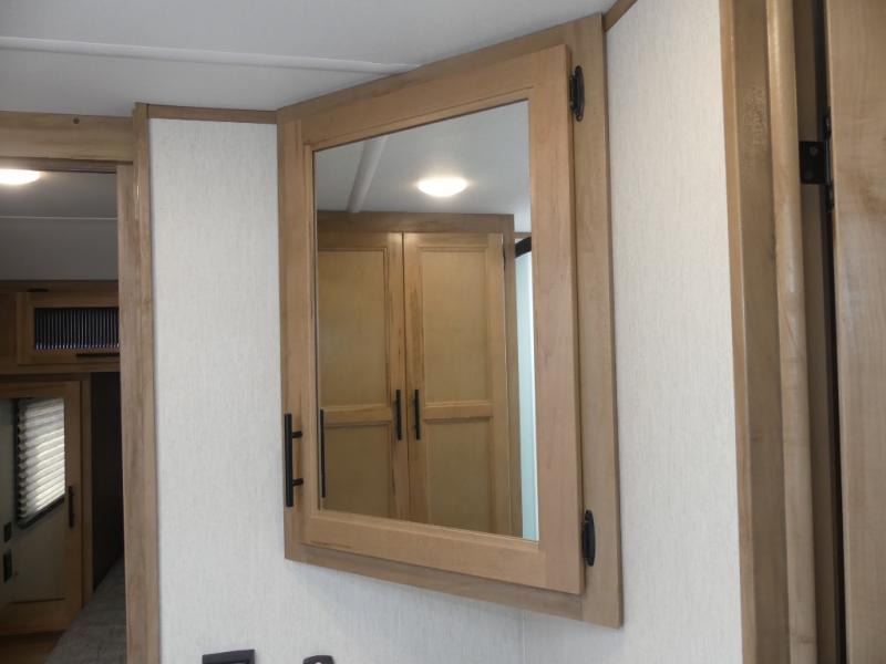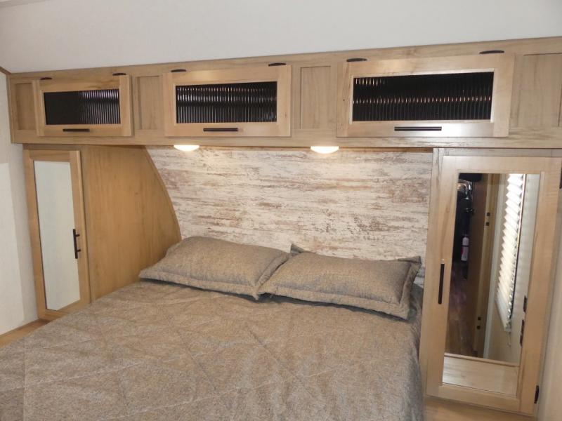 When you are looking for a couples trailer, you might want to stop your search after stepping inside this one! Some of highlights include theater seating to relax in while enjoying the fireplace, a walk-in pantry, and a large slide out. You can dine at the free-standing table with two fixed chairs and two folding chairs, and this space is great if you need a work area. There is bench seating with storage allowing you to sit down while taking off your shoes, plus overhead storage for belongings. The double entry bathroom is convenient, and the front bedroom offers a queen bed with two sides of storage, plus windows for cross-ventilation when you want some fresh air inside.