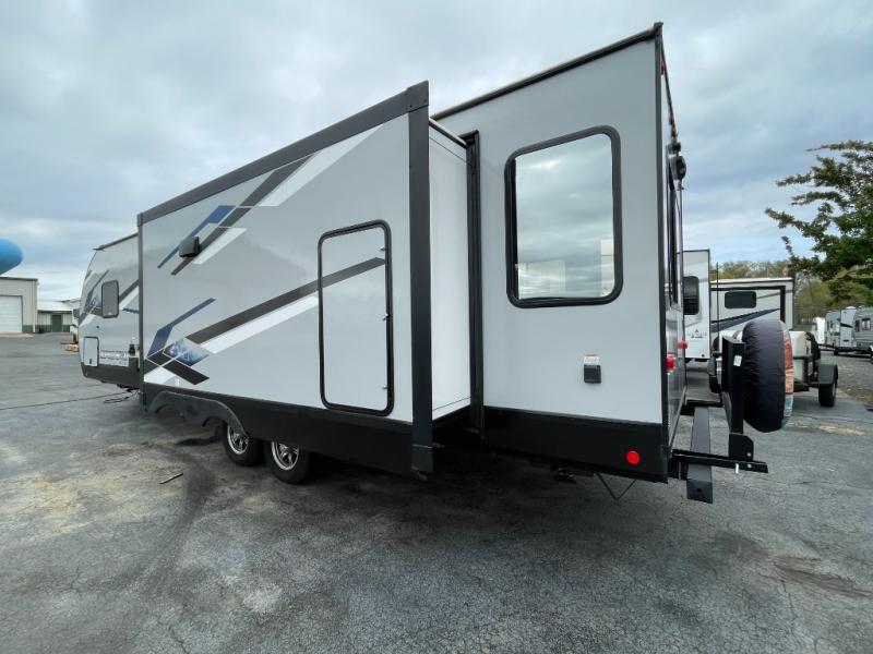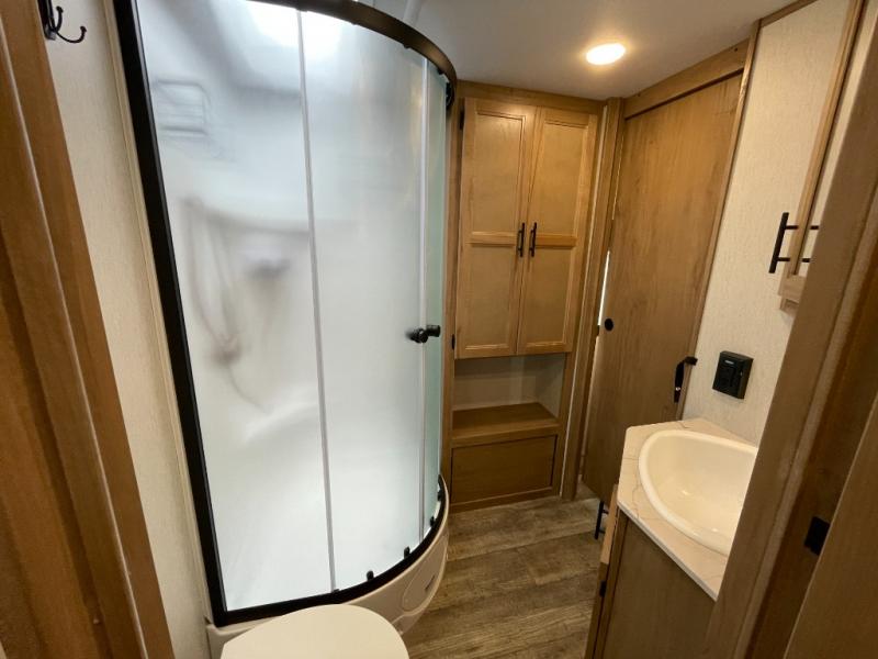 This trailer has it all for maximum comfort and convenience as well as entertainment! The rear living area includes a deluxe tri-fold hide-a-bed sofa with a rear window for great views of your campsite, and dual opposing slides widen this area so you can visit with friends. You'll also find theater seating with heat, light, and massage, plus a free-standing table with two fixed and two folding chairs. Enjoy the fireplace on a cool night or when you want a little ambiance while seated inside. The kitchen island will be handy for food prep and serving, and the unique coffee bar will be a favorite as well. Two patio awnings will provide an outdoor living area; just grab your camping chairs from the full pass-through storage. When you want to call it a night, fall quickly to sleep on the queen bed in the front bedroom with easy access to a dual entry bathroom which offers a radius shower with opaque glass doors.