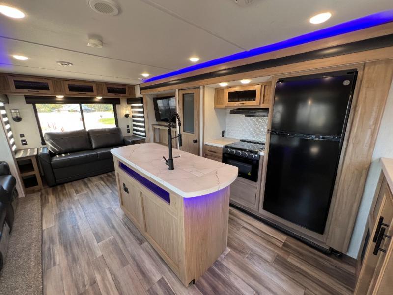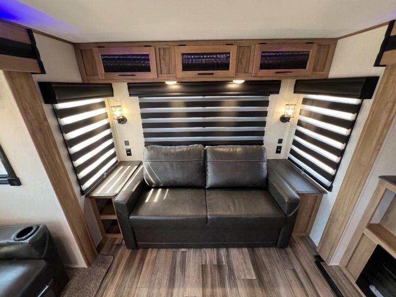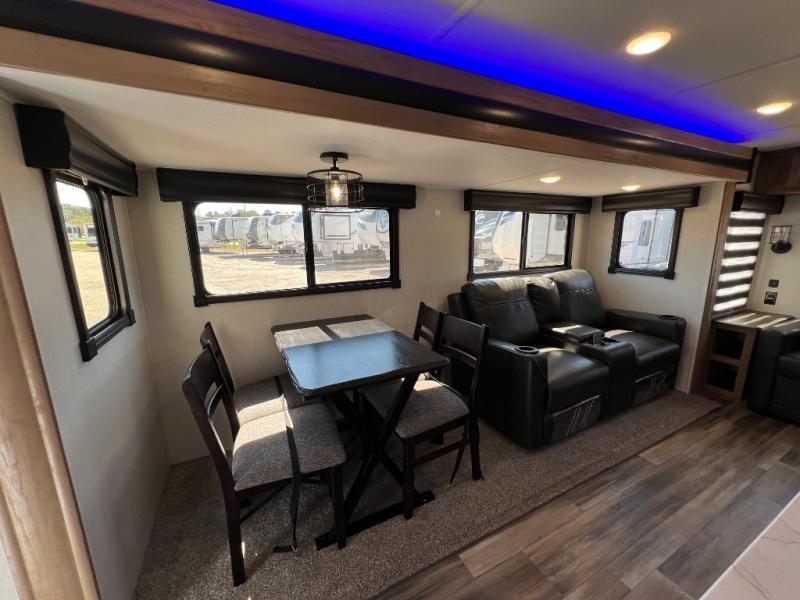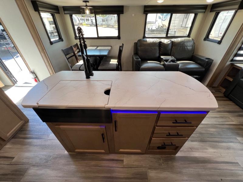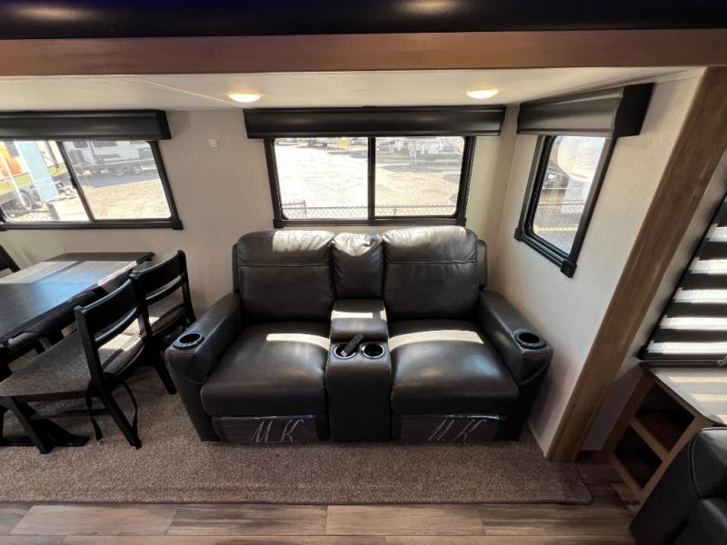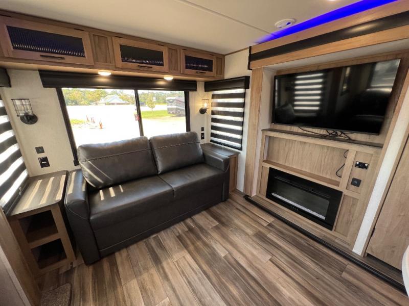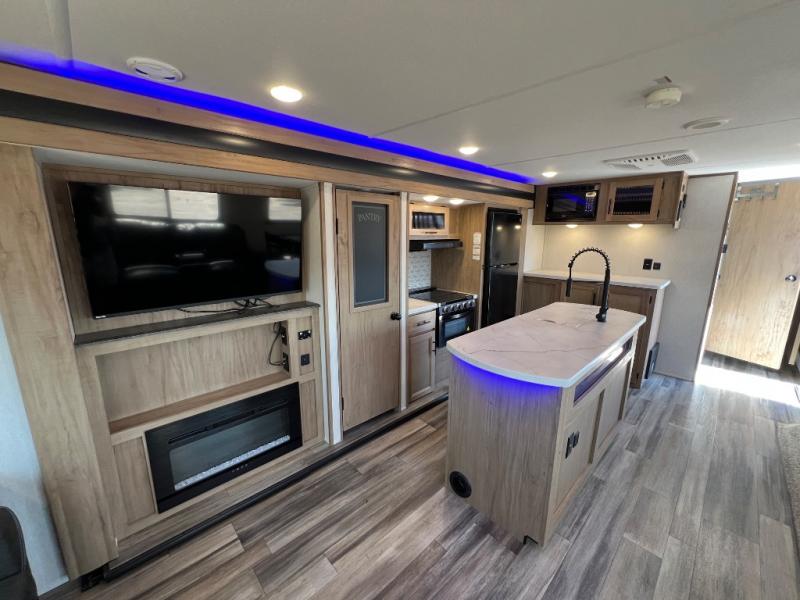 This trailer has it all for maximum comfort and convenience as well as entertainment! The rear living area includes a deluxe tri-fold hide-a-bed sofa with a rear window for great views of your campsite, and dual opposing slides widen this area so you can visit with friends. You'll also find theater seating with heat, light, and massage, plus a free-standing table with two fixed and two folding chairs. Enjoy the fireplace on a cool night or when you want a little ambiance while seated inside. The kitchen island will be handy for food prep and serving, and the unique coffee bar will be a favorite as well. Two patio awnings will provide an outdoor living area; just grab your camping chairs from the full pass-through storage. When you want to call it a night, fall quickly to sleep on the queen bed in the front bedroom with easy access to a dual entry bathroom which offers a radius shower with opaque glass doors.