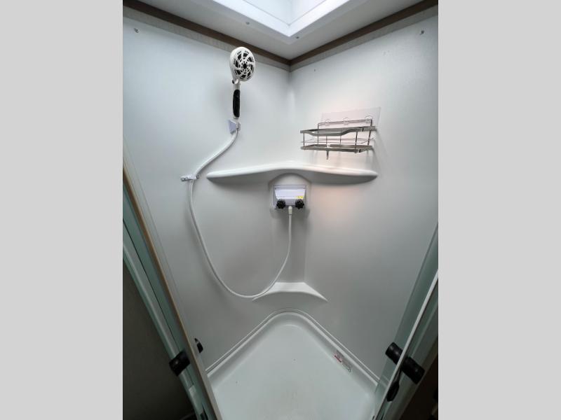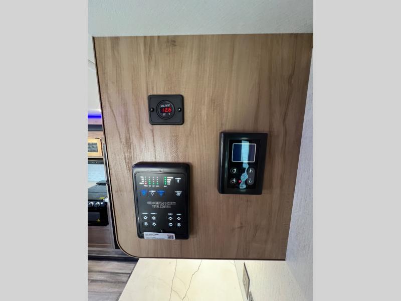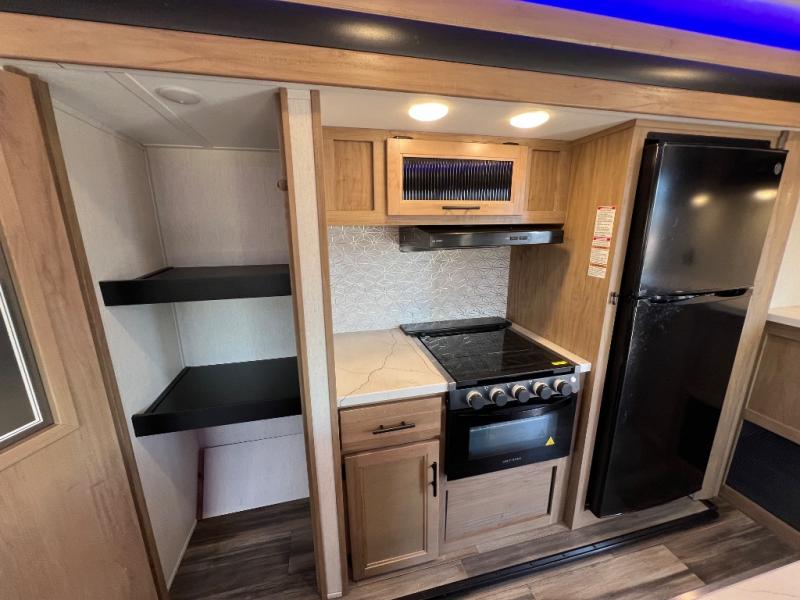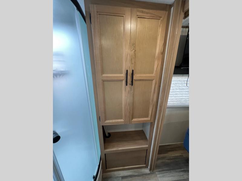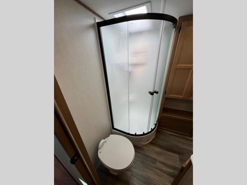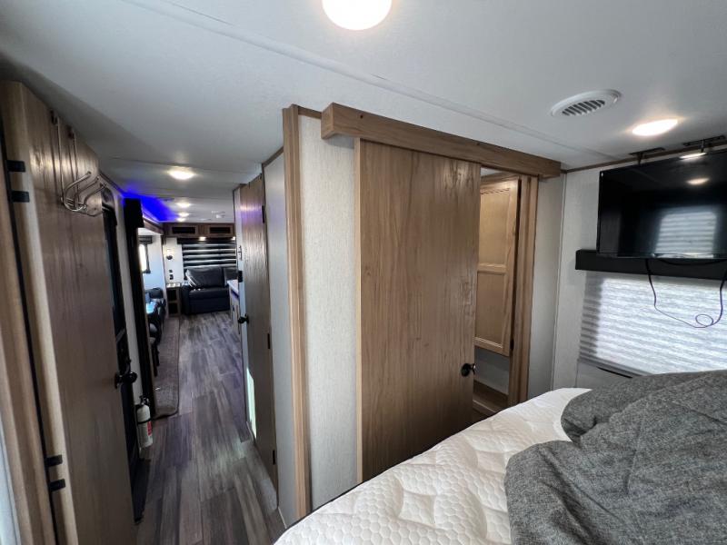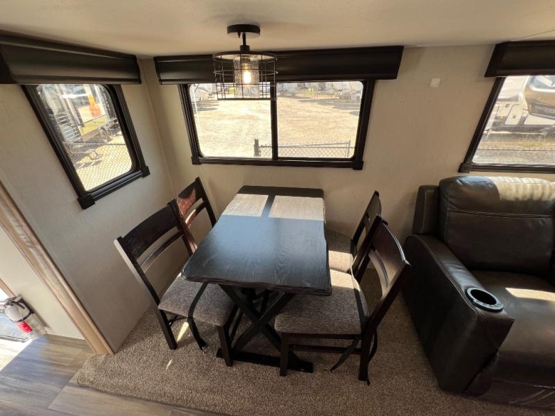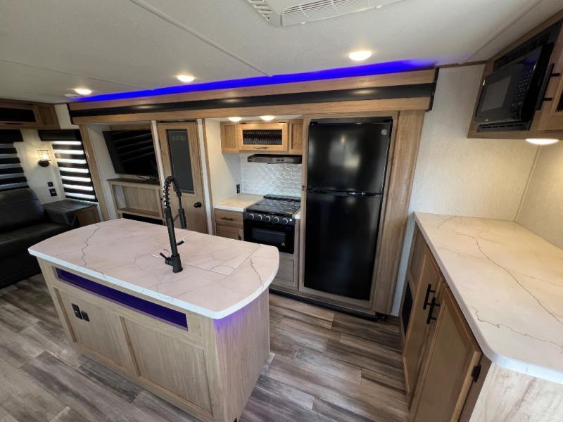 This trailer has it all for maximum comfort and convenience as well as entertainment! The rear living area includes a deluxe tri-fold hide-a-bed sofa with a rear window for great views of your campsite, and dual opposing slides widen this area so you can visit with friends. You'll also find theater seating with heat, light, and massage, plus a free-standing table with two fixed and two folding chairs. Enjoy the fireplace on a cool night or when you want a little ambiance while seated inside. The kitchen island will be handy for food prep and serving, and the unique coffee bar will be a favorite as well. Two patio awnings will provide an outdoor living area; just grab your camping chairs from the full pass-through storage. When you want to call it a night, fall quickly to sleep on the queen bed in the front bedroom with easy access to a dual entry bathroom which offers a radius shower with opaque glass doors.