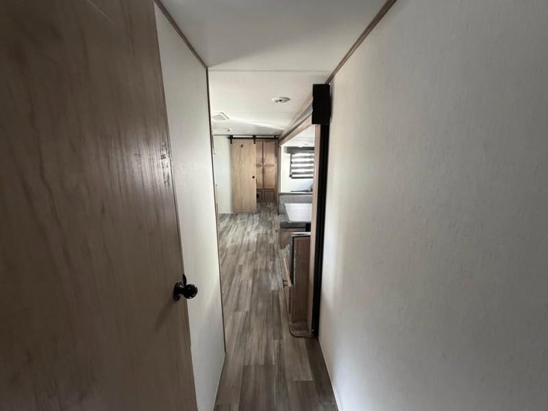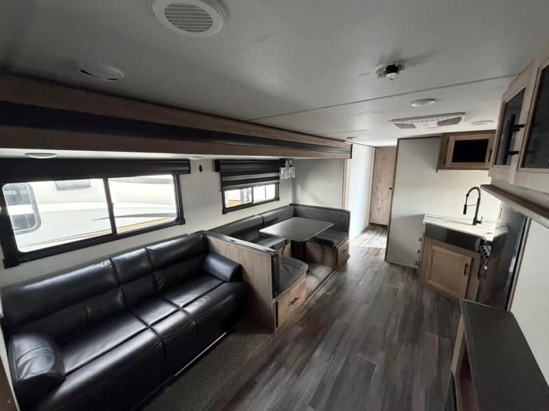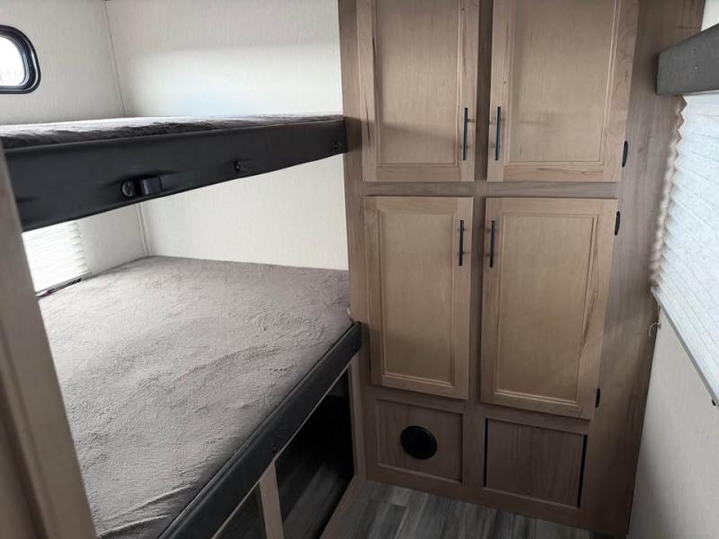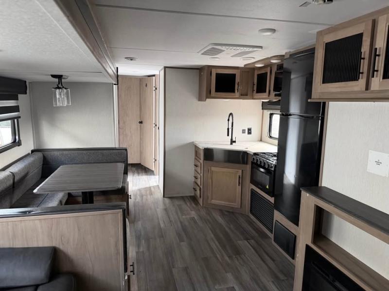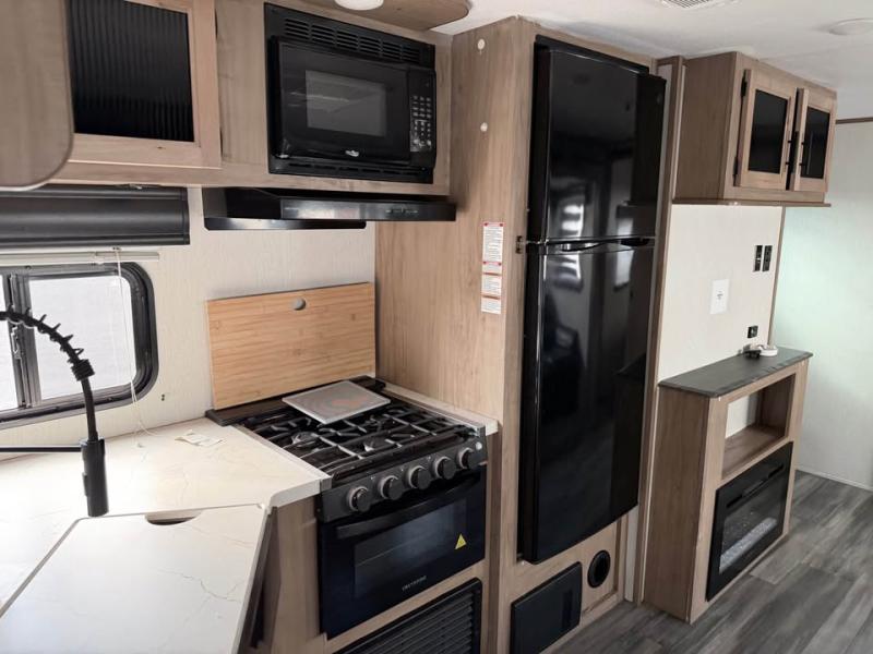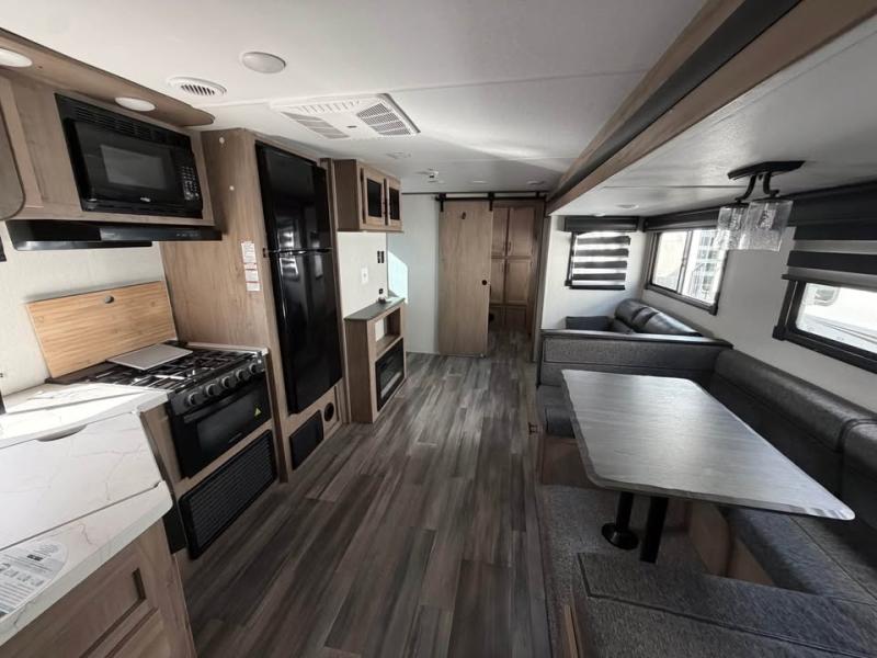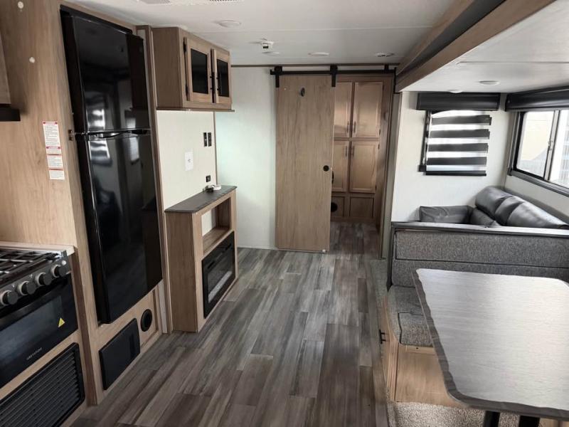 Privacy, convenience, comfort and a lot of space can be found in this travel trailer! The rear bunkhouse includes a barn-style door for easy entry, double-sized bunks with a ladder to sleep four, and a wardrobe for your clothes. You will have your own privacy in the front bedroom with a walk-around queen bed, dual shirt closets and nightstands, plus easy access to the dual-entry bath. The main living and kitchen area has an L-shaped kitchen area with everything nearby including a farm-style sink, a 12V residential refrigerator, and a walk-in pantry. You can relax at the jack knife sofa and U-shaped dinette within the slide out and enjoy the fireplace or the window views in the slide.
