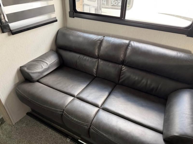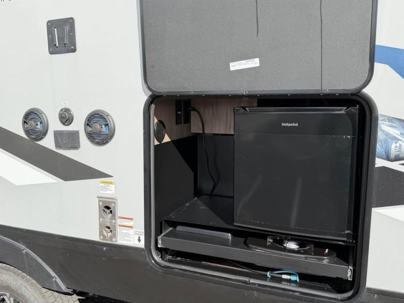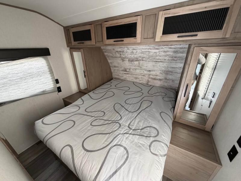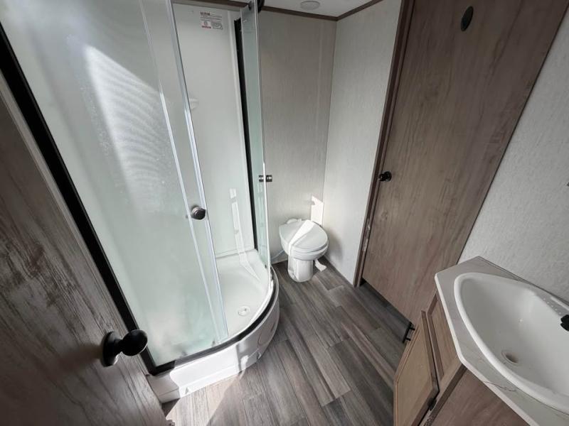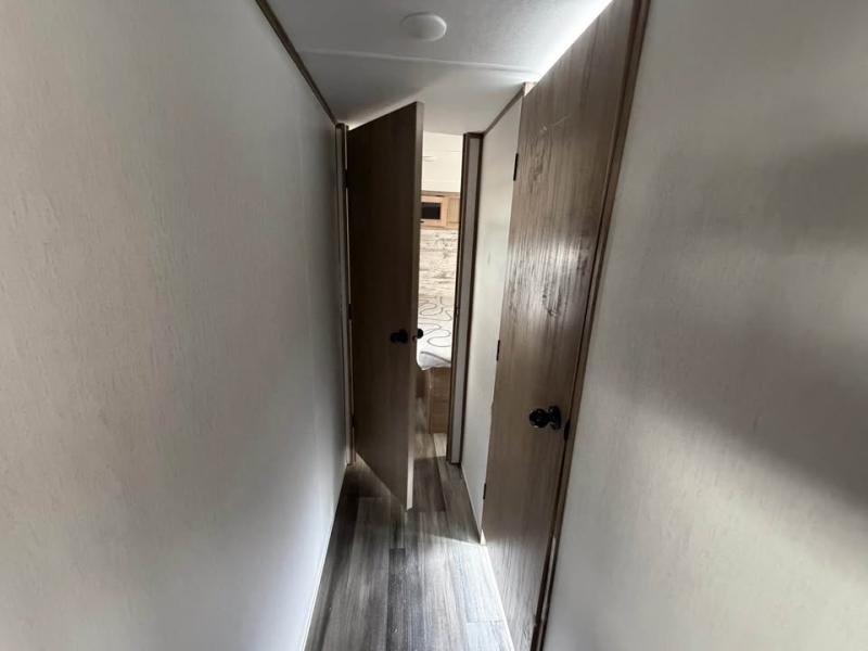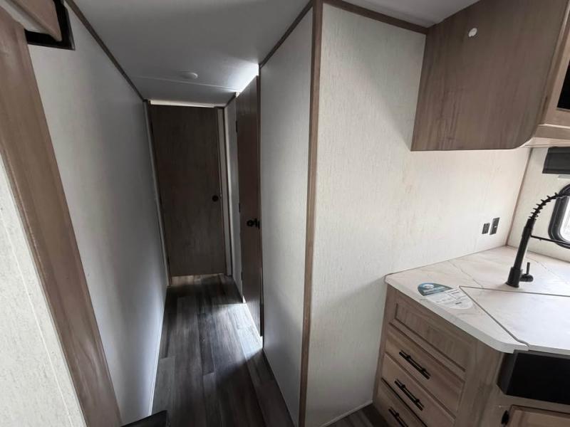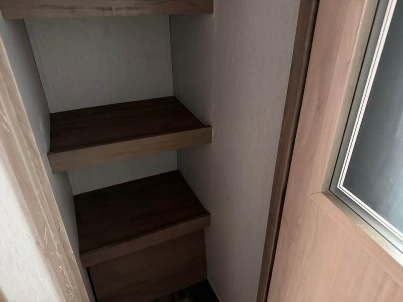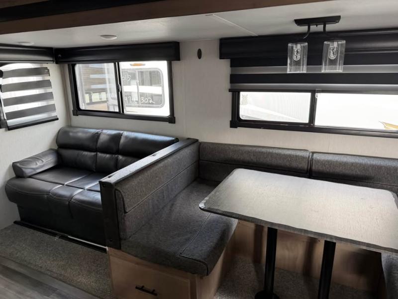 Privacy, convenience, comfort and a lot of space can be found in this travel trailer! The rear bunkhouse includes a barn-style door for easy entry, double-sized bunks with a ladder to sleep four, and a wardrobe for your clothes. You will have your own privacy in the front bedroom with a walk-around queen bed, dual shirt closets and nightstands, plus easy access to the dual-entry bath. The main living and kitchen area has an L-shaped kitchen area with everything nearby including a farm-style sink, a 12V residential refrigerator, and a walk-in pantry. You can relax at the jack knife sofa and U-shaped dinette within the slide out and enjoy the fireplace or the window views in the slide.