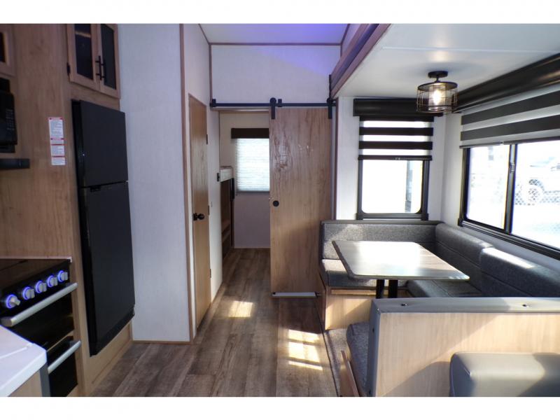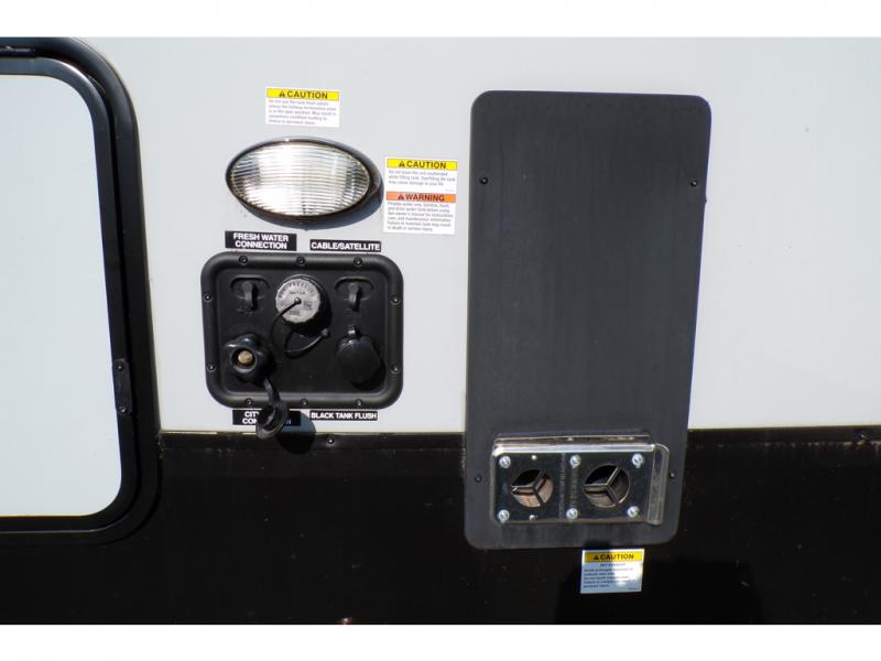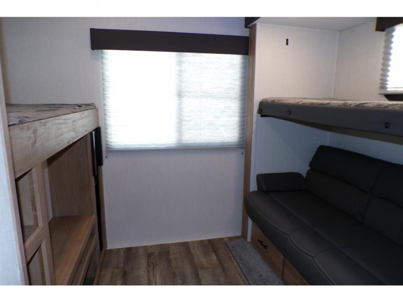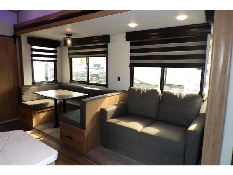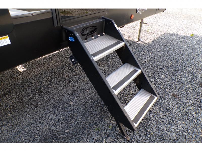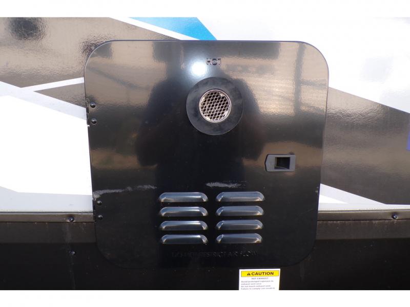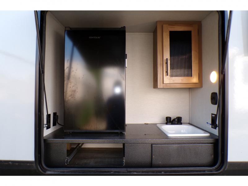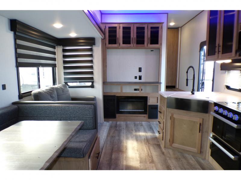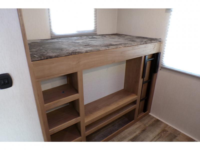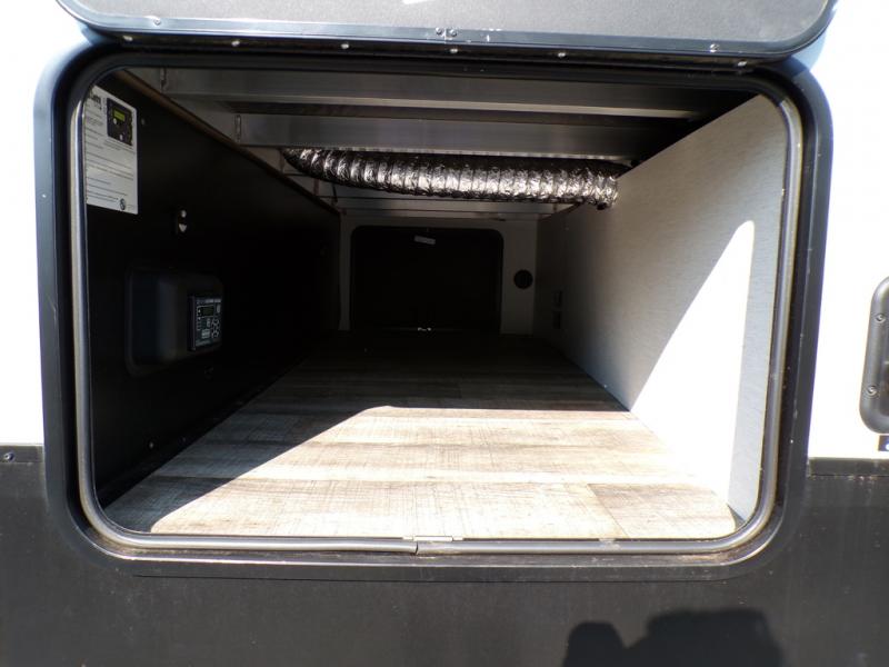 Get ready for an amazing adventure with this Cherokee Arctic Wolf fifth wheel! You can see all sorts of mountains, landscapes, scenery, and beaches, and you will still have a comfortable home to retreat to after seeing all of those sights. The bunkhouse is quite fun for your kids because it has a jackknife sofa that sits across from a storage area that has been prepped for a TV. There is also a slide for more space to have fun, a flip-up bunk above the sofa, and a bunk above the storage. Another amazing feature is the half bathroom that is right next to the bunkhouse, and this half bathroom also contains the second exterior entry door. This means you can come inside quickly to use the restroom while you are outside working on dinner at the outdoor kitchen with residential refrigerator. The living room has a fireplace to provide coziness, and there is a 50W solar panel to provide power while you are off-grid.