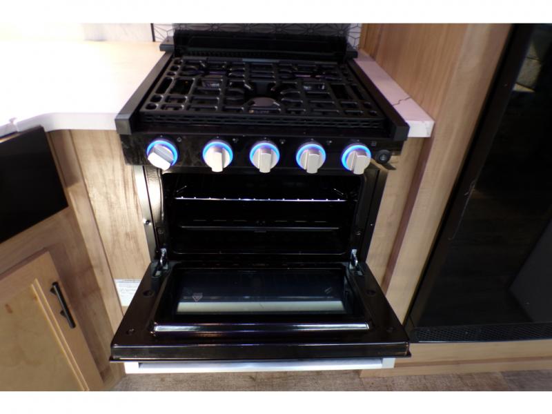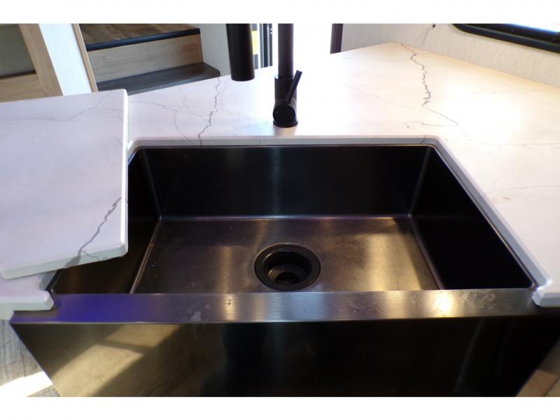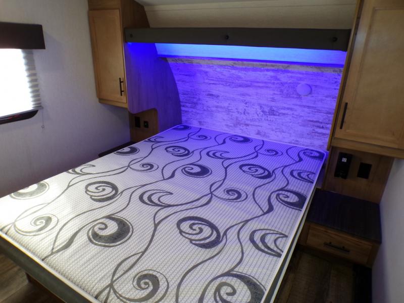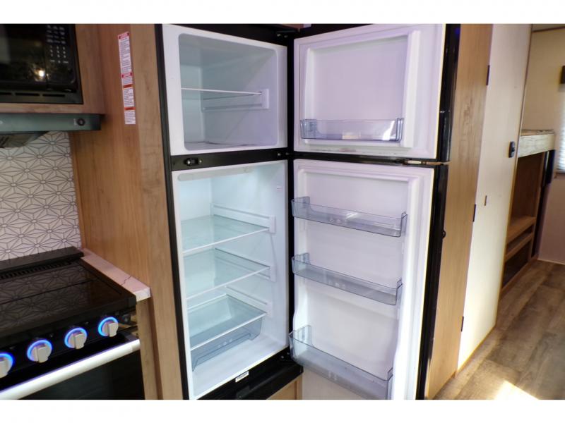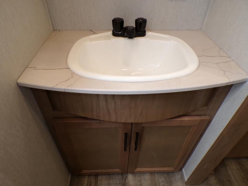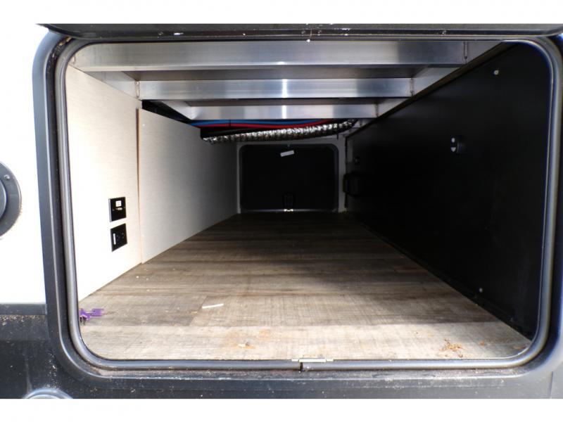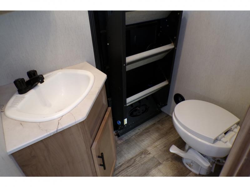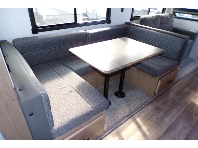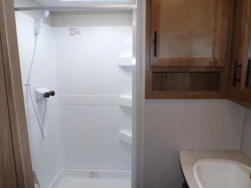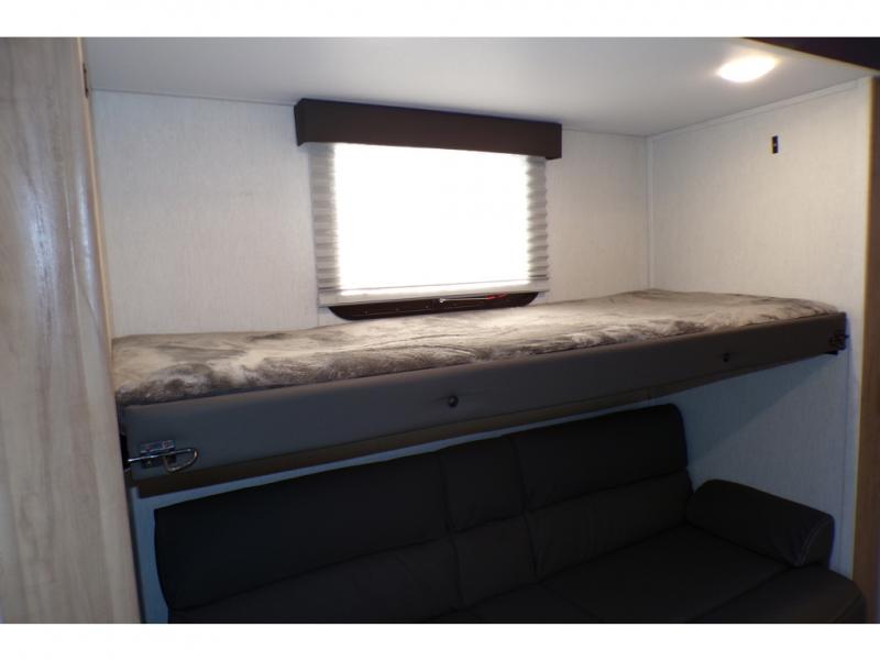 Get ready for an amazing adventure with this Cherokee Arctic Wolf fifth wheel! You can see all sorts of mountains, landscapes, scenery, and beaches, and you will still have a comfortable home to retreat to after seeing all of those sights. The bunkhouse is quite fun for your kids because it has a jackknife sofa that sits across from a storage area that has been prepped for a TV. There is also a slide for more space to have fun, a flip-up bunk above the sofa, and a bunk above the storage. Another amazing feature is the half bathroom that is right next to the bunkhouse, and this half bathroom also contains the second exterior entry door. This means you can come inside quickly to use the restroom while you are outside working on dinner at the outdoor kitchen with residential refrigerator. The living room has a fireplace to provide coziness, and there is a 50W solar panel to provide power while you are off-grid.