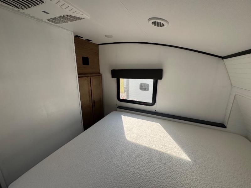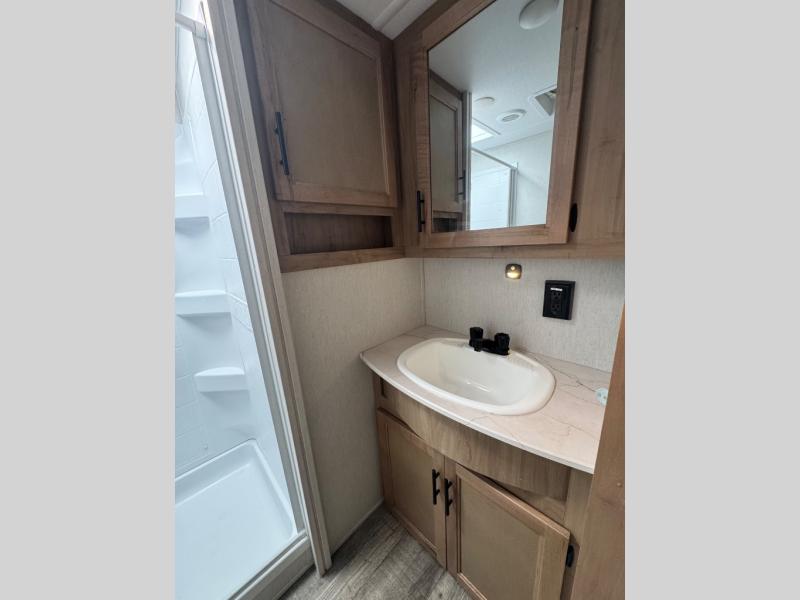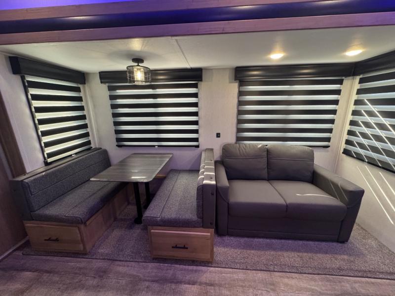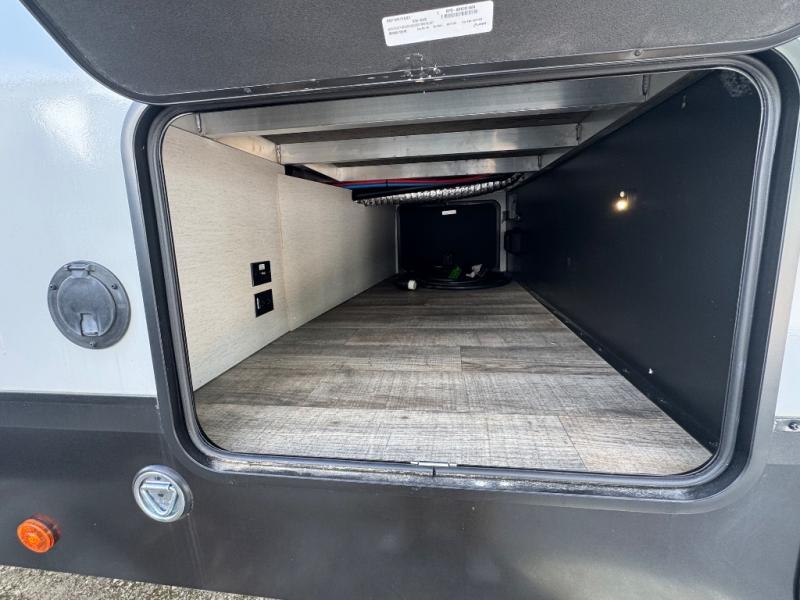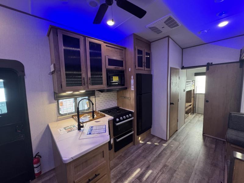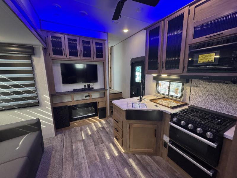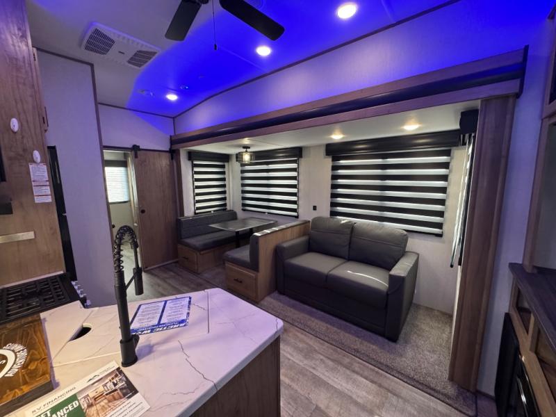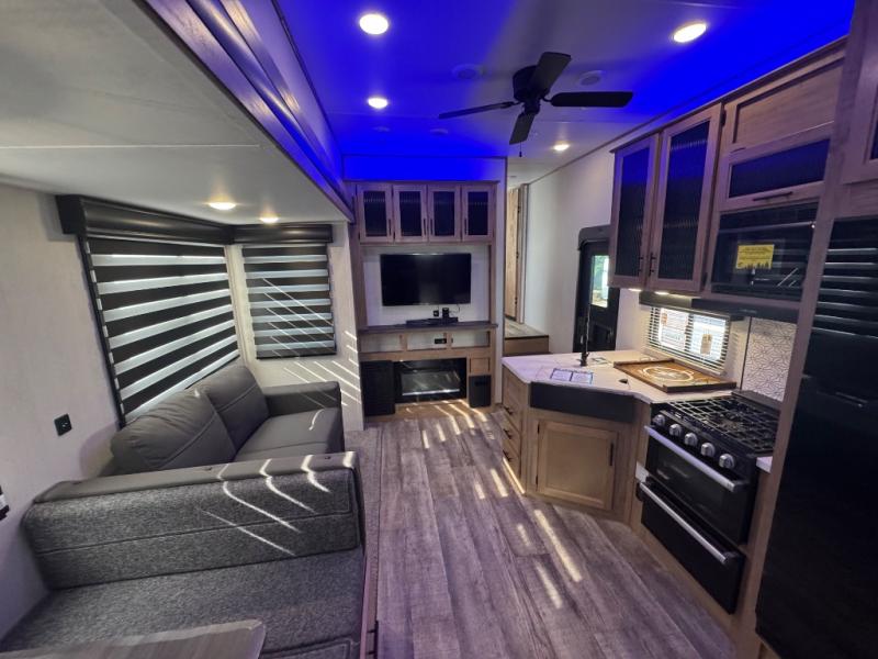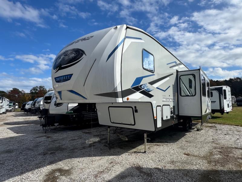 Get ready for an amazing adventure with this Cherokee Arctic Wolf fifth wheel! You can see all sorts of mountains, landscapes, scenery, and beaches, and you will still have a comfortable home to retreat to after seeing all of those sights. The bunkhouse is quite fun for your kids because it has a jackknife sofa that sits across from a storage area that has been prepped for a TV. There is also a slide for more space to have fun, a flip-up bunk above the sofa, and a bunk above the storage. Another amazing feature is the half bathroom that is right next to the bunkhouse, and this half bathroom also contains the second exterior entry door. This means you can come inside quickly to use the restroom while you are outside working on dinner at the outdoor kitchen with residential refrigerator. The living room has a fireplace to provide coziness, and there is a 50W solar panel to provide power while you are off-grid.