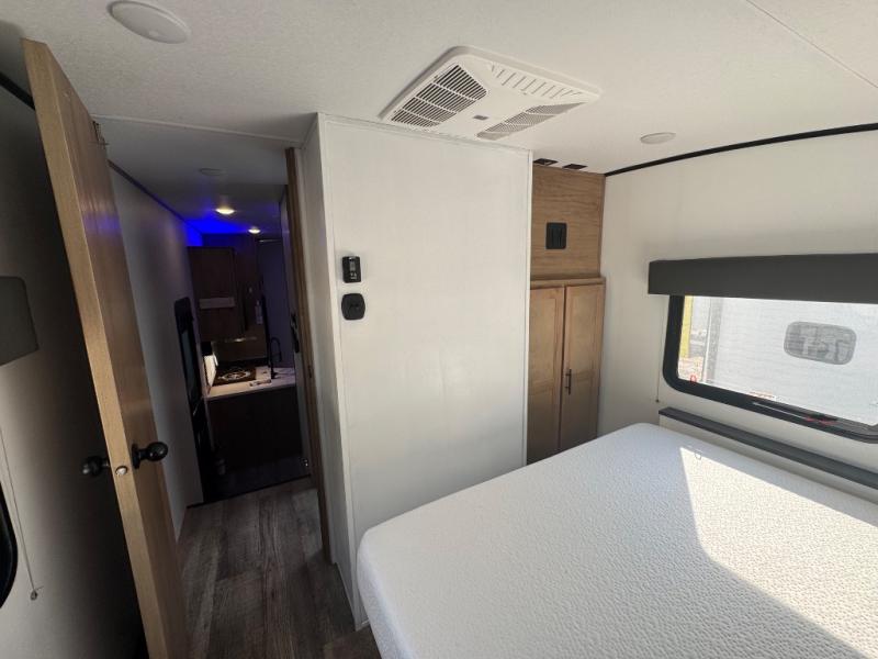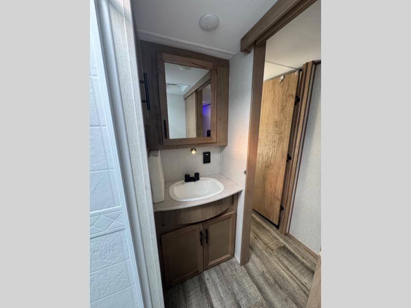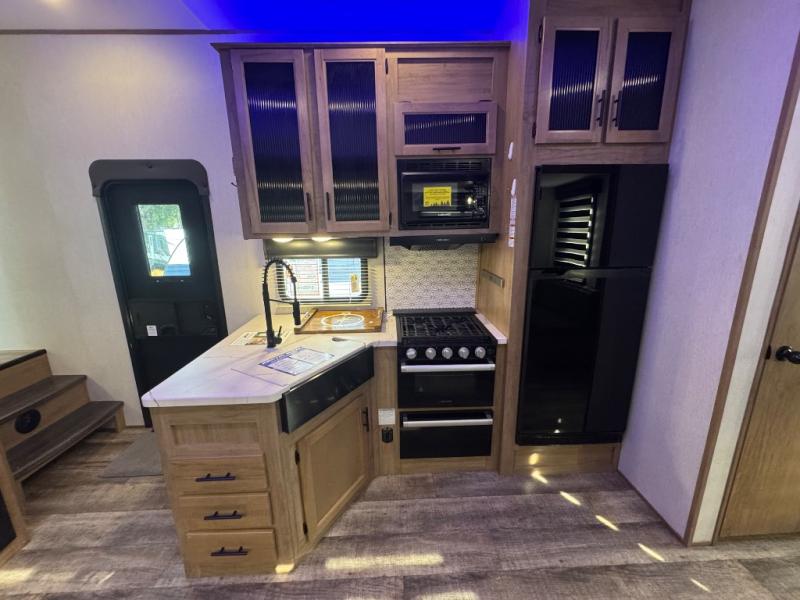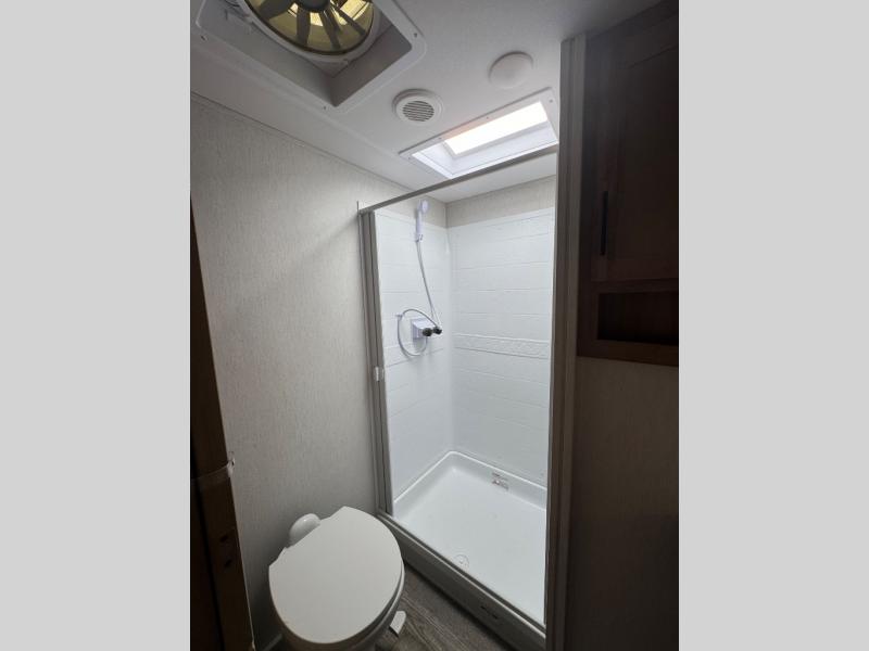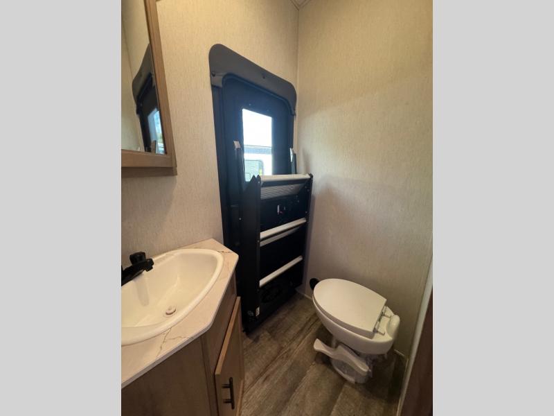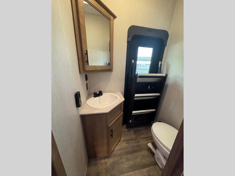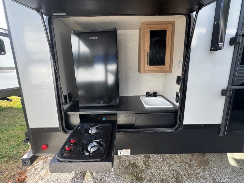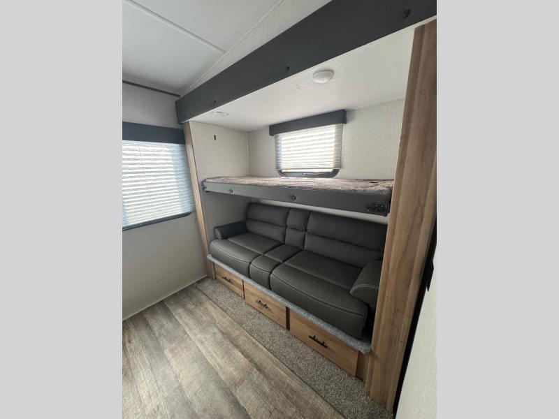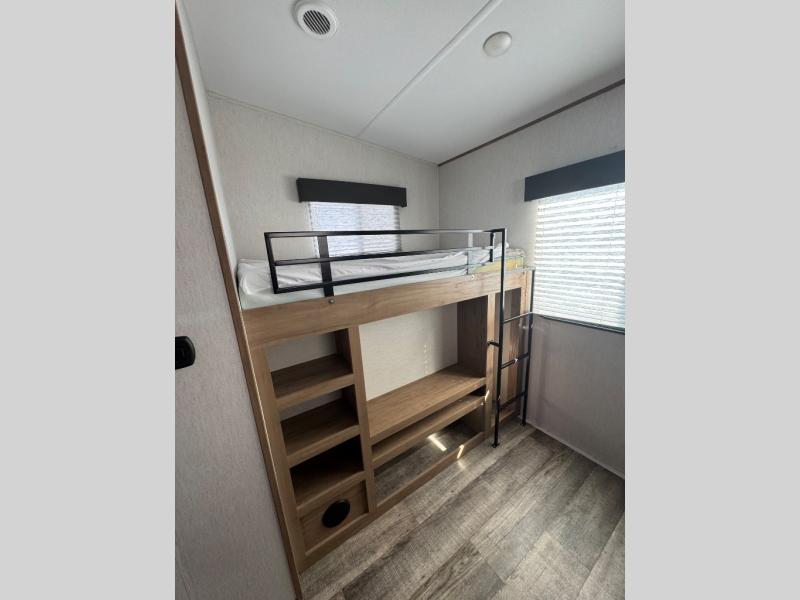 Get ready for an amazing adventure with this Cherokee Arctic Wolf fifth wheel! You can see all sorts of mountains, landscapes, scenery, and beaches, and you will still have a comfortable home to retreat to after seeing all of those sights. The bunkhouse is quite fun for your kids because it has a jackknife sofa that sits across from a storage area that has been prepped for a TV. There is also a slide for more space to have fun, a flip-up bunk above the sofa, and a bunk above the storage. Another amazing feature is the half bathroom that is right next to the bunkhouse, and this half bathroom also contains the second exterior entry door. This means you can come inside quickly to use the restroom while you are outside working on dinner at the outdoor kitchen with residential refrigerator. The living room has a fireplace to provide coziness, and there is a 50W solar panel to provide power while you are off-grid.