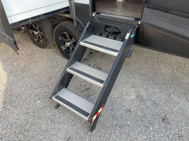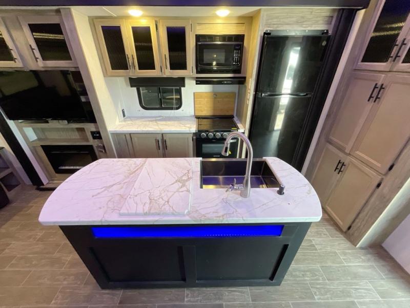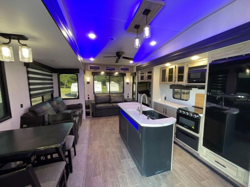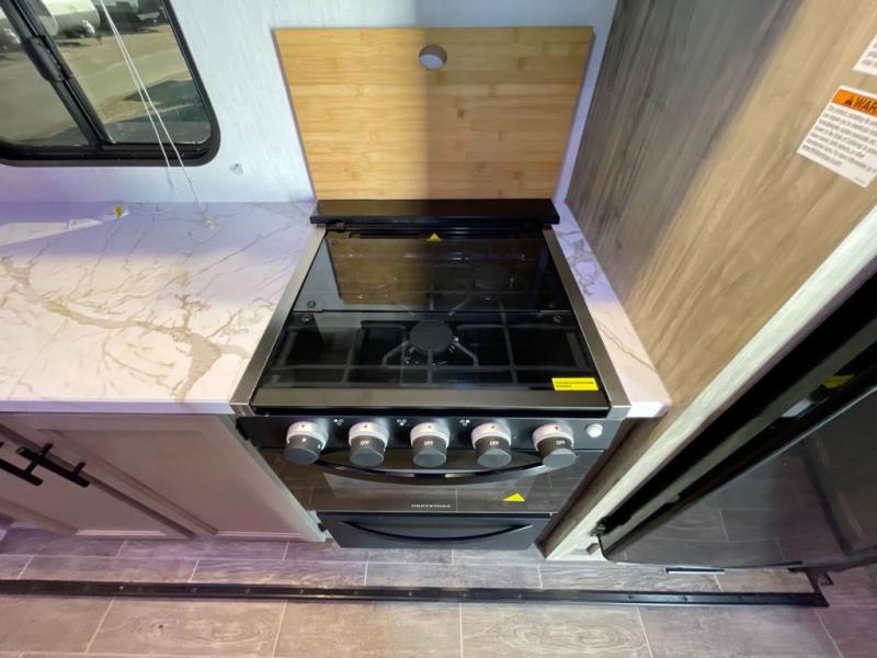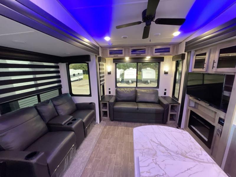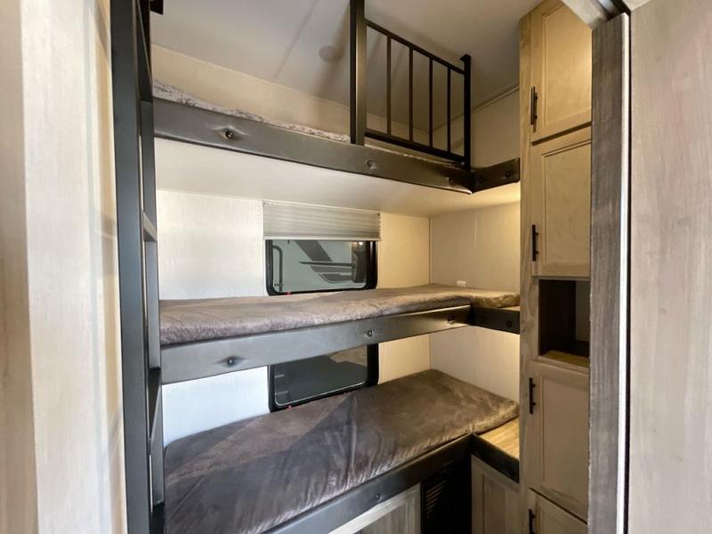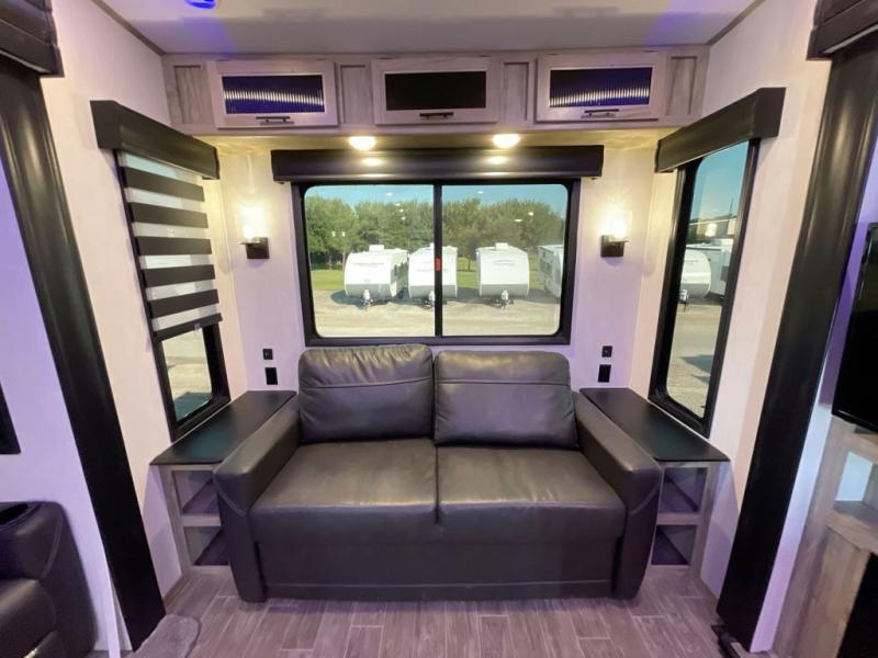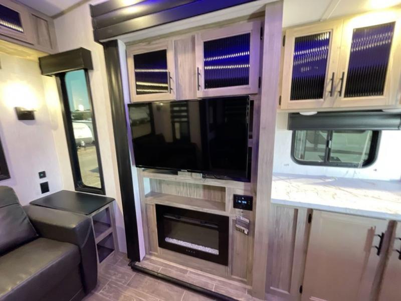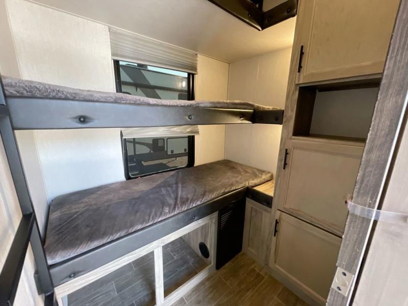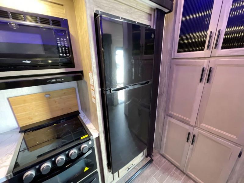 If you want something that is going to accommodate the whole family, check out this Cherokee Arctic Wolf fifth wheel! Not only is there a private bedroom with a residential queen bed for you, but there is also a private bunkhouse with triple bunk beds for any other tired campers. You can even use the tri-fold sofa out in the main living area for additional sleeping space. This main living area has home theater seating across from a fireplace with TV prep, so you can relax in true comfort each night. You can also play a game or put together a puzzle at the free-standing table with two fixed chairs and two folding chairs. This whole area will be kept cool when you switch on the ceiling fan, and if you need to head outside to check on the campfire, you can easily grab your jacket from the entryway coat drop zone and your sandals from the shoe storage under the steps.