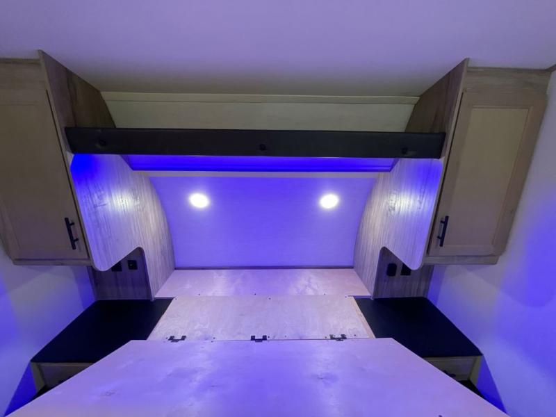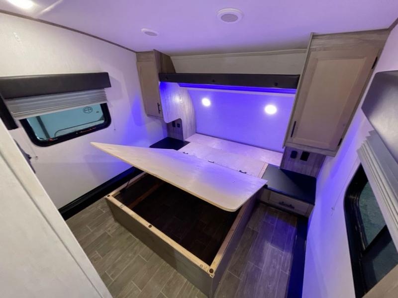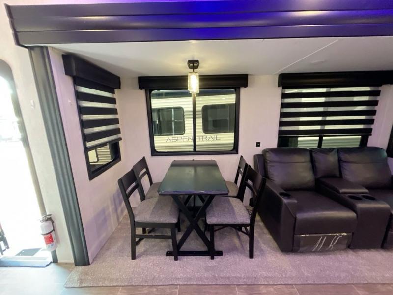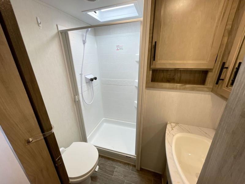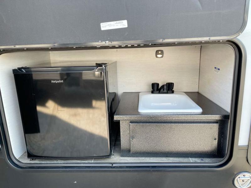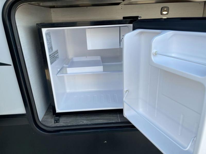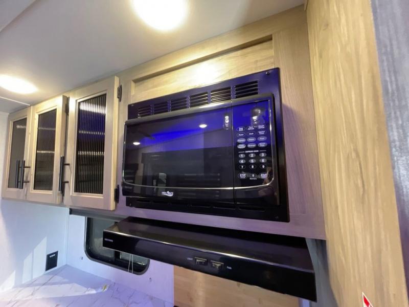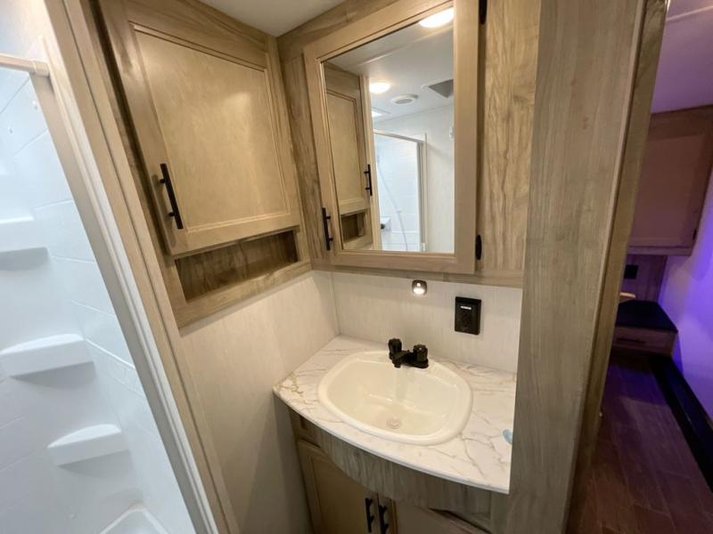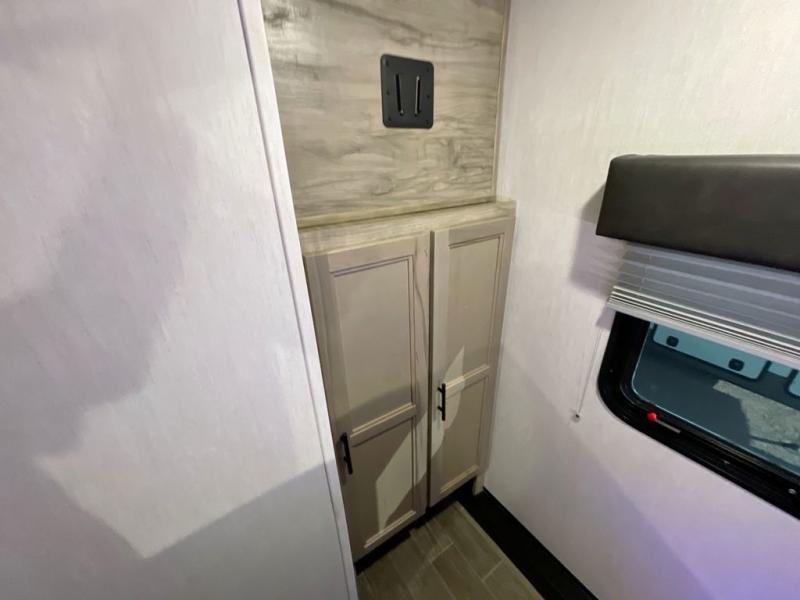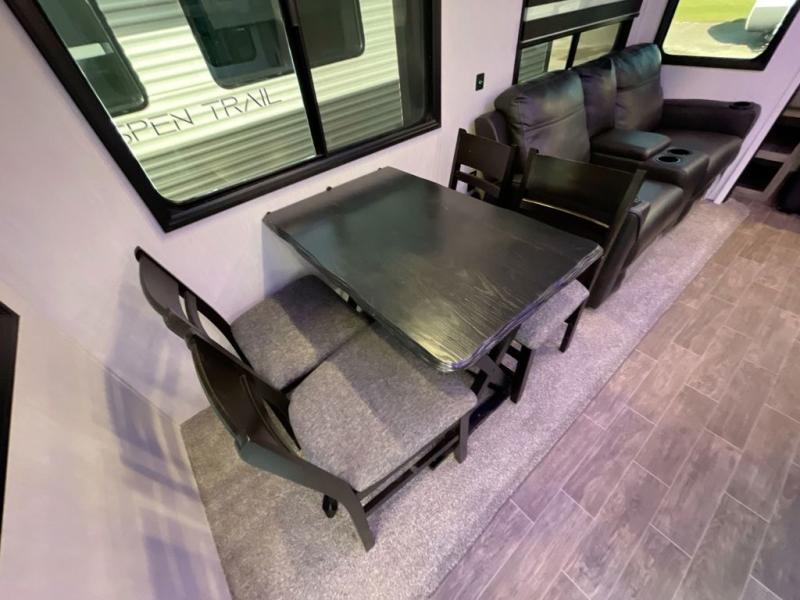 If you want something that is going to accommodate the whole family, check out this Cherokee Arctic Wolf fifth wheel! Not only is there a private bedroom with a residential queen bed for you, but there is also a private bunkhouse with triple bunk beds for any other tired campers. You can even use the tri-fold sofa out in the main living area for additional sleeping space. This main living area has home theater seating across from a fireplace with TV prep, so you can relax in true comfort each night. You can also play a game or put together a puzzle at the free-standing table with two fixed chairs and two folding chairs. This whole area will be kept cool when you switch on the ceiling fan, and if you need to head outside to check on the campfire, you can easily grab your jacket from the entryway coat drop zone and your sandals from the shoe storage under the steps.