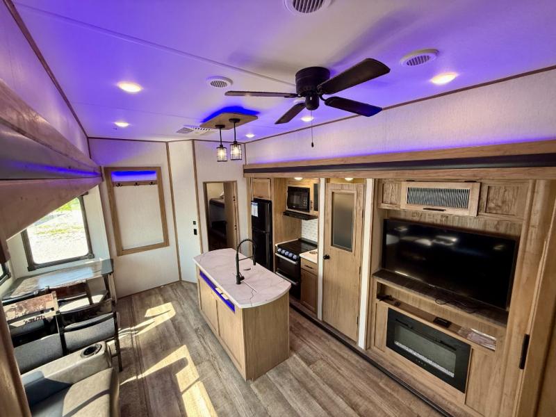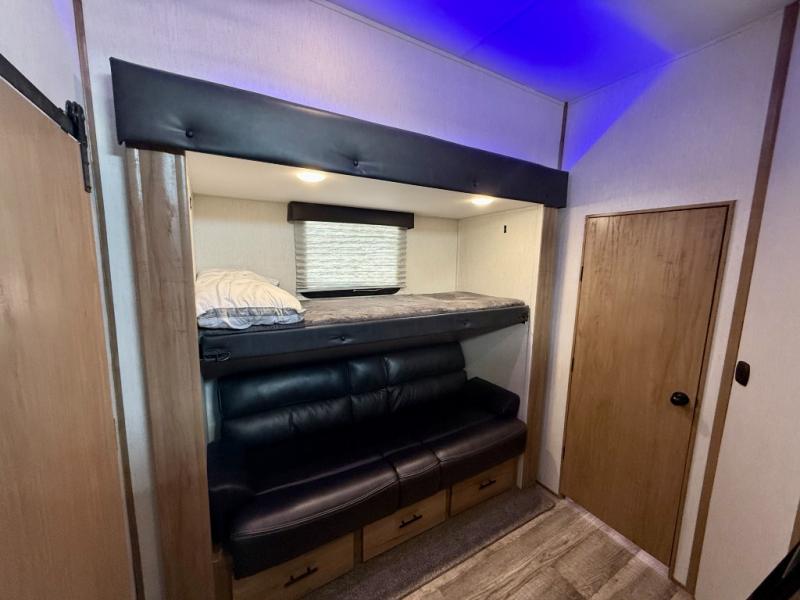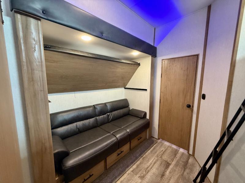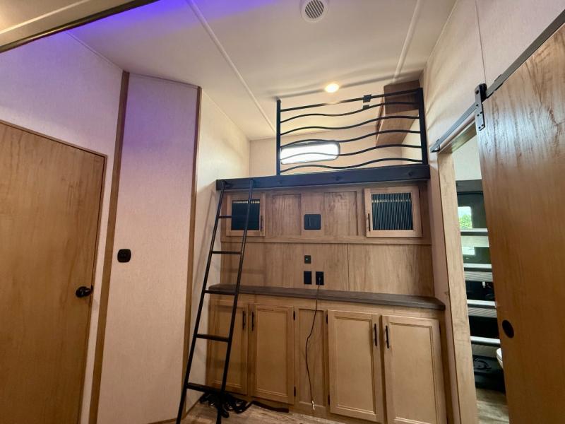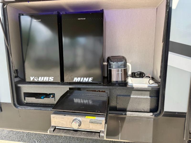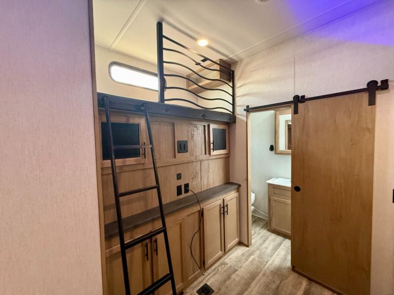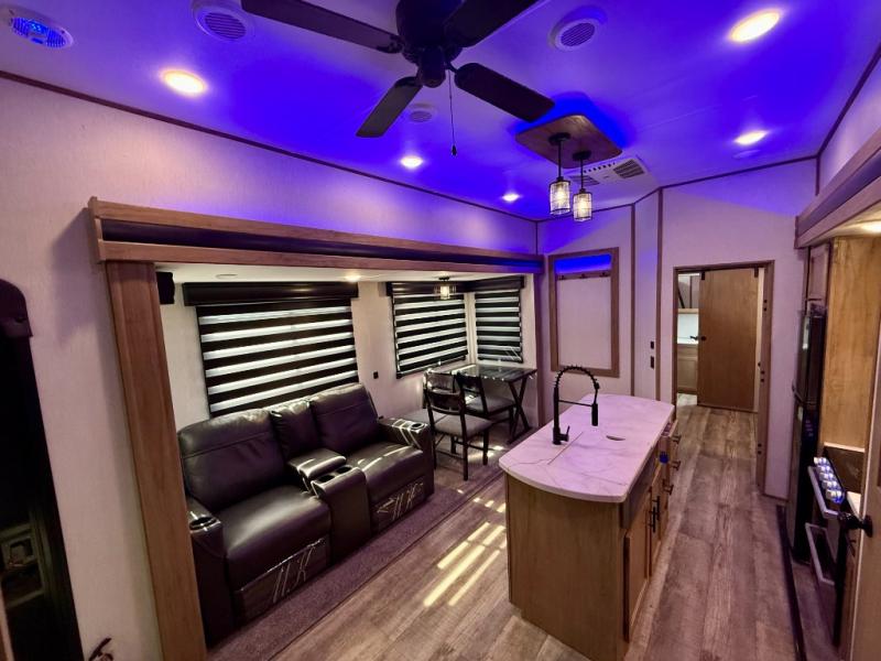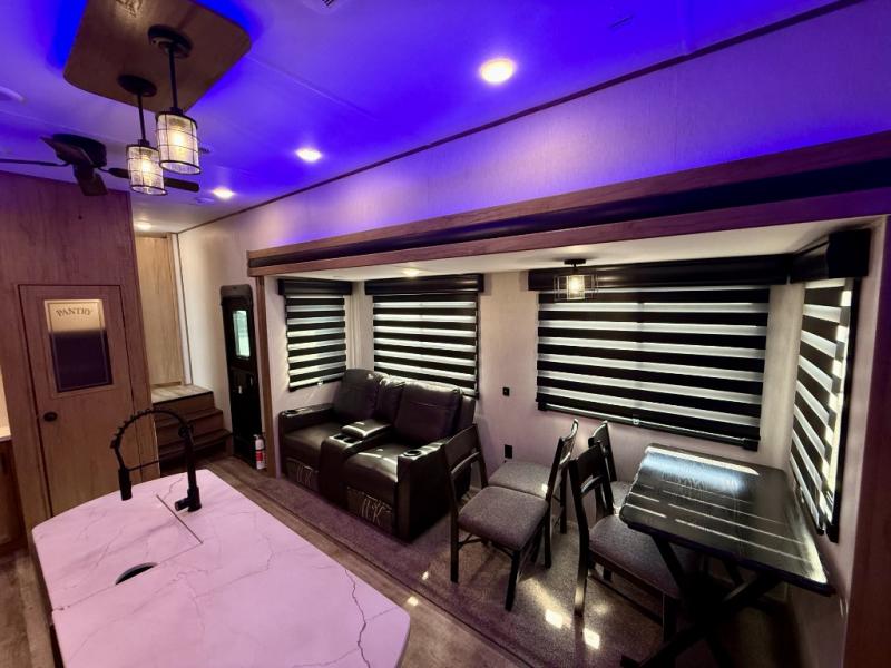 You can't beat this dual entry fifth wheel packed with luxury amenities! Your guests will love the rear private bunkhouse with their own full bath and exterior entry door, plus a jackknife sofa with drawers and a flip-up bunk. There is even a loft with a bunk mat for more sleeping space! The main kitchen and living area includes dual opposing slides, theater seating across from the fireplace, and even a coffee bar where you can set up your Keurig machine. There is also a table with two fixed chairs and two folding chairs, a second pantry, plus a 12V refrigerator for food storage. You'll find the second full bath to be super convenient when traveling with friends and family, and the front private bedroom will feel just like home. Here, you'll find a king bed slide out, an oversized front bedroom closet with built in shelves and sliding doors, plus a desk with a makeup area that can double as a work desk if needed. Head outdoors to enjoy the exterior griddle and two exterior refrigerators, plus the 15' power awning and pass-through storage!