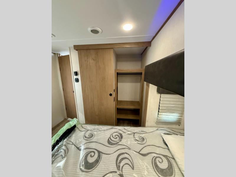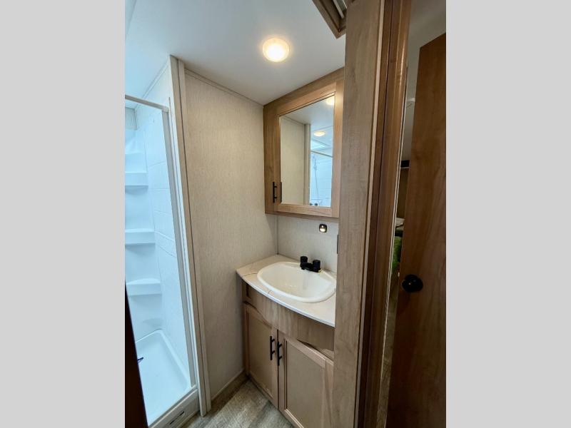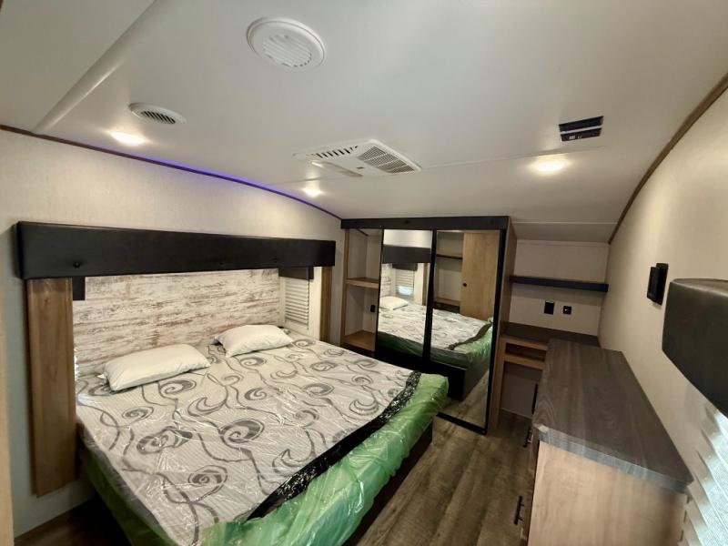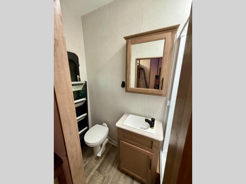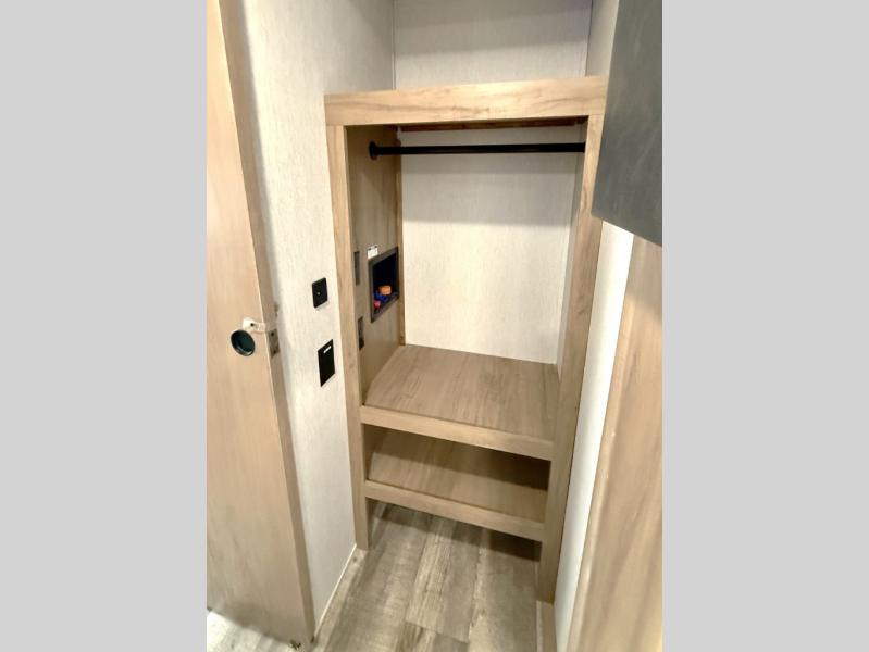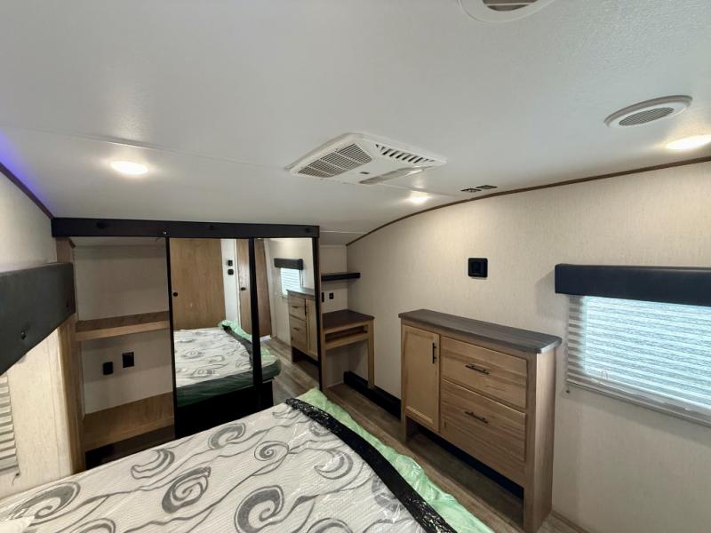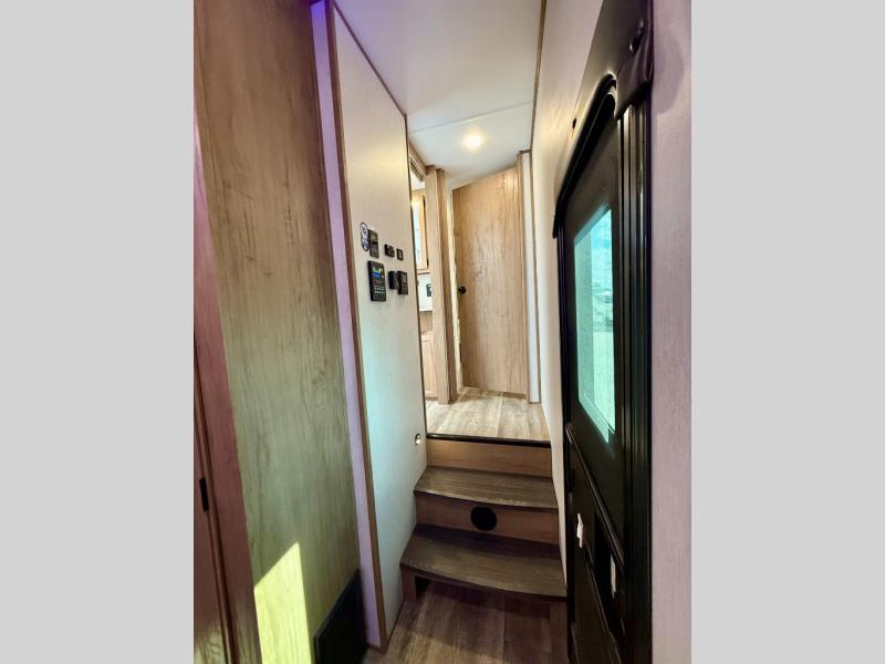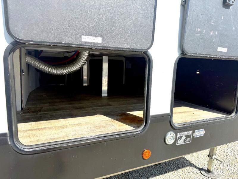 You can't beat this dual entry fifth wheel packed with luxury amenities! Your guests will love the rear private bunkhouse with their own full bath and exterior entry door, plus a jackknife sofa with drawers and a flip-up bunk. There is even a loft with a bunk mat for more sleeping space! The main kitchen and living area includes dual opposing slides, theater seating across from the fireplace, and even a coffee bar where you can set up your Keurig machine. There is also a table with two fixed chairs and two folding chairs, a second pantry, plus a 12V refrigerator for food storage. You'll find the second full bath to be super convenient when traveling with friends and family, and the front private bedroom will feel just like home. Here, you'll find a king bed slide out, an oversized front bedroom closet with built in shelves and sliding doors, plus a desk with a makeup area that can double as a work desk if needed. Head outdoors to enjoy the exterior griddle and two exterior refrigerators, plus the 15' power awning and pass-through storage!