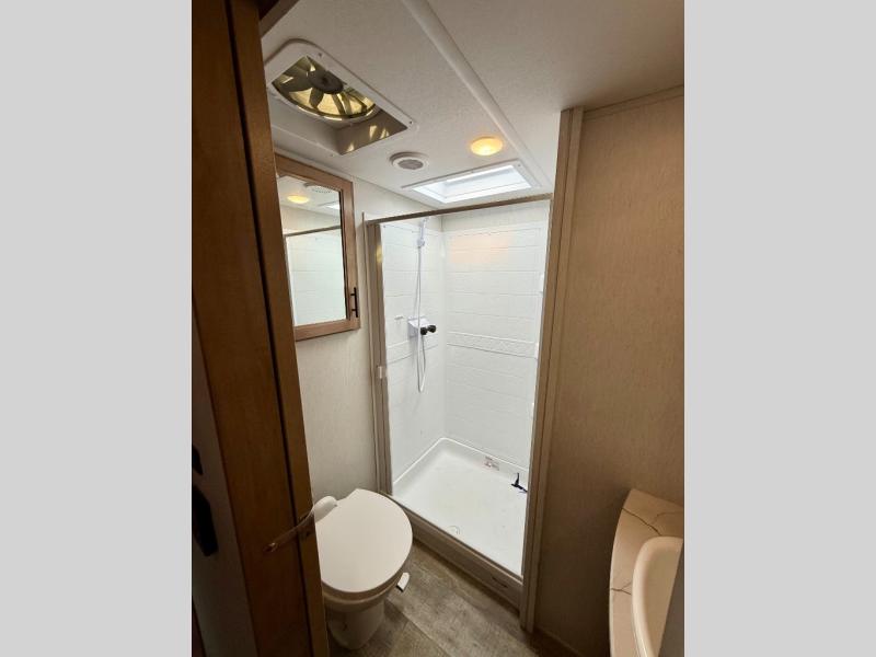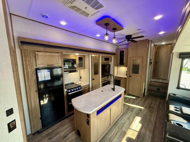 You will have amazing residential comfort in the Forest River Cherokee Arctic Wolf Suite fifth wheels! These units have a “SuperStor” dual-cavern basement storage compartment to allow you to bring more gear, and they have been constructed with a “ToughBend” rigid skirt metal design, a 1x engineered wood “SuperTruss” roof structure with 3/8" decking, and a 5/8” tongue-and-groove plywood floor decking. Each model includes Leash Latch pet safety technology, an outside shower with hot/cold water, preparations for an exterior TV, motion-sensing lighting, and a smart monitor panel with smart phone Bluetooth connectivity. The supersized central air conditioning unit (15,000 BTU) with quick cool air dump feature and second oversized 15,000 BTU ducted air conditioner will cool your unit down in a snap when you camp in the hot summer months.