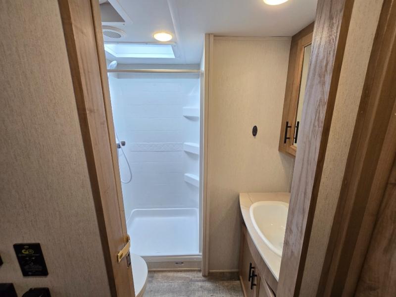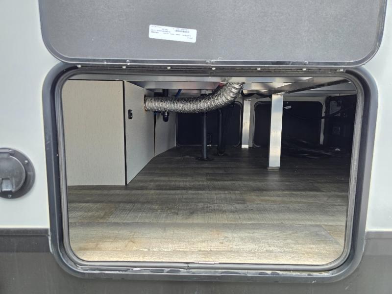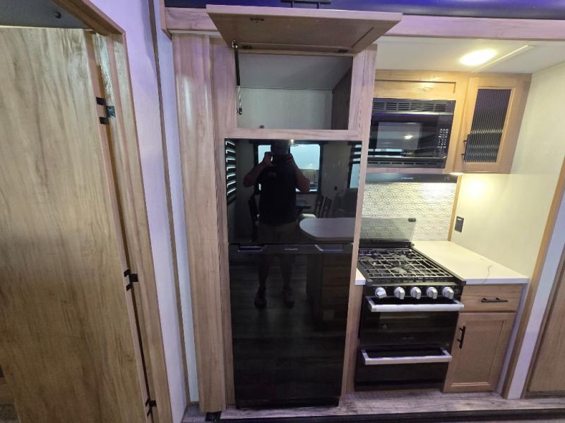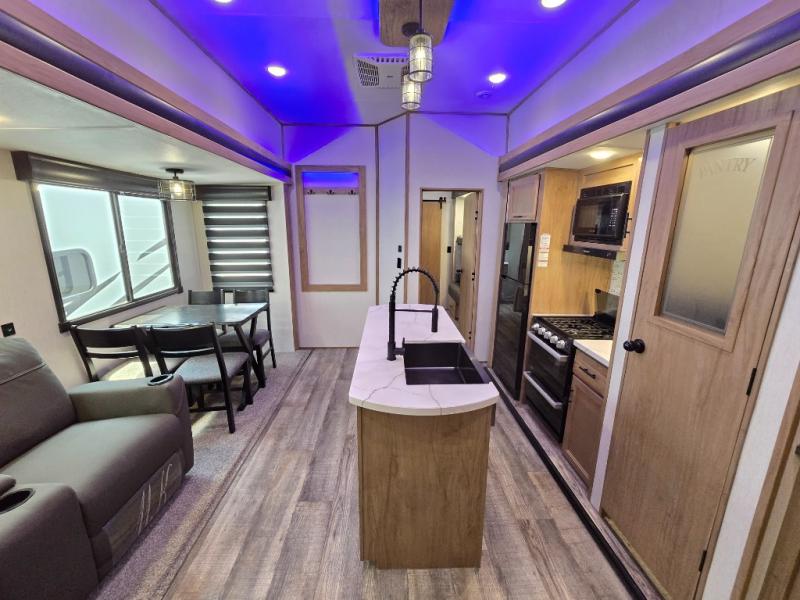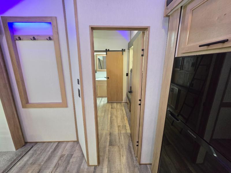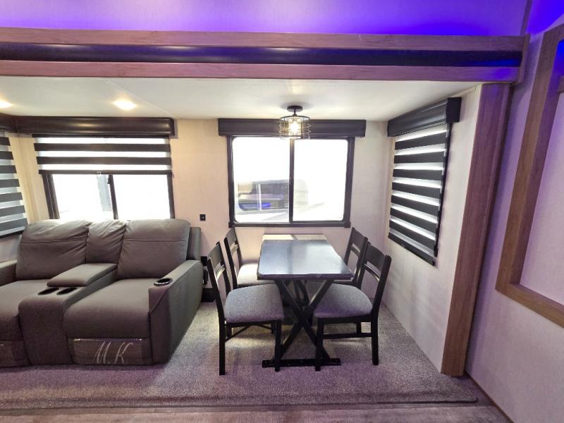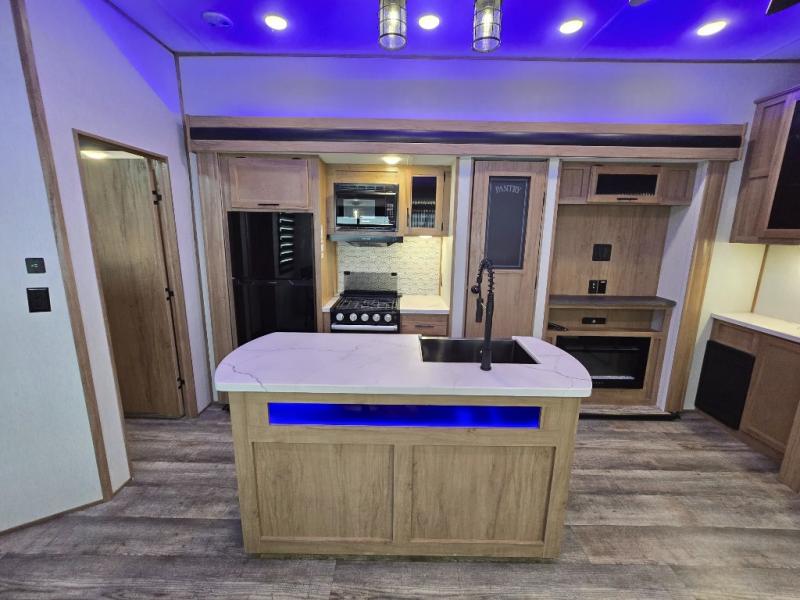 You can't beat this dual entry fifth wheel packed with luxury amenities! Your guests will love the rear private bunkhouse with their own full bath and exterior entry door, plus a jackknife sofa with drawers and a flip-up bunk. There is even a loft with a bunk mat for more sleeping space! The main kitchen and living area includes dual opposing slides, theater seating across from the fireplace, and even a coffee bar where you can set up your Keurig machine. There is also a table with two fixed chairs and two folding chairs, a second pantry, plus a 12V refrigerator for food storage. You'll find the second full bath to be super convenient when traveling with friends and family, and the front private bedroom will feel just like home. Here, you'll find a king bed slide out, an oversized front bedroom closet with built in shelves and sliding doors, plus a desk with a makeup area that can double as a work desk if needed. Head outdoors to enjoy the exterior griddle and two exterior refrigerators, plus the 15' power awning and pass-through storage!