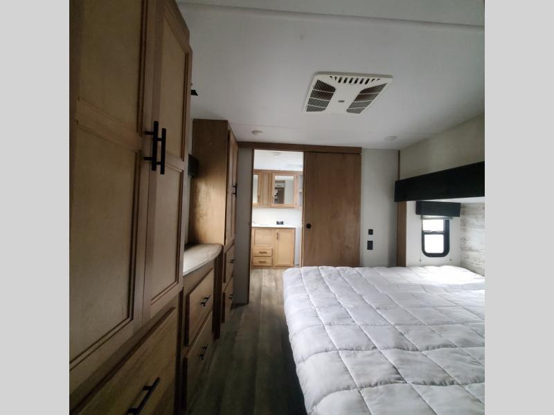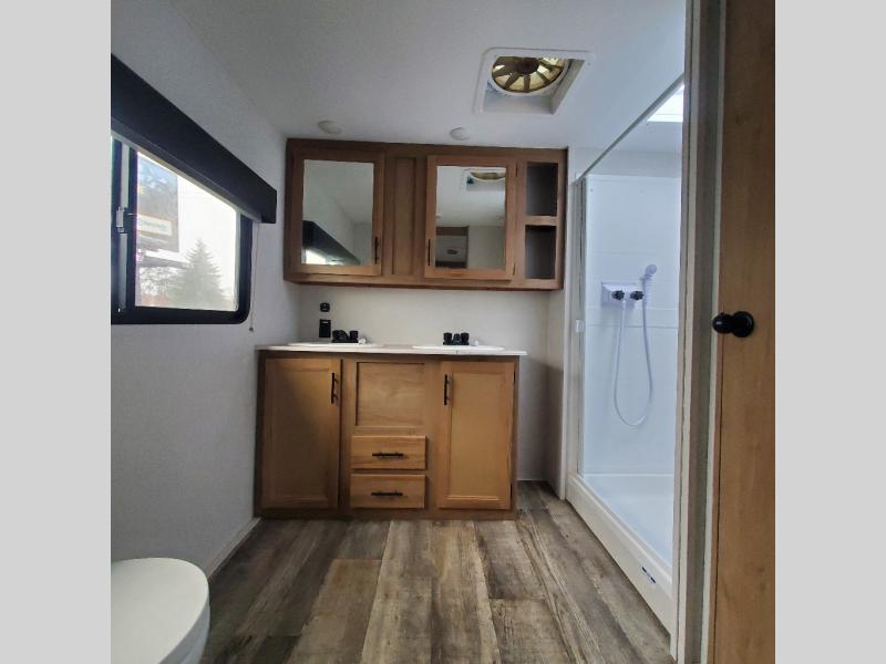 You will have amazing residential comfort in the Forest River Cherokee Arctic Wolf Suite fifth wheels! These units have a “SuperStor” dual-cavern basement storage compartment to allow you to bring more gear, and they have been constructed with a “ToughBend” rigid skirt metal design, a 1x engineered wood “SuperTruss” roof structure with 3/8" decking, and a 5/8” tongue-and-groove plywood floor decking. Each model includes Leash Latch pet safety technology, an outside shower with hot/cold water, preparations for an exterior TV, motion-sensing lighting, and a smart monitor panel with smart phone Bluetooth connectivity. The supersized central air conditioning unit (15,000 BTU) with quick cool air dump feature and second oversized 15,000 BTU ducted air conditioner will cool your unit down in a snap when you camp in the hot summer months.