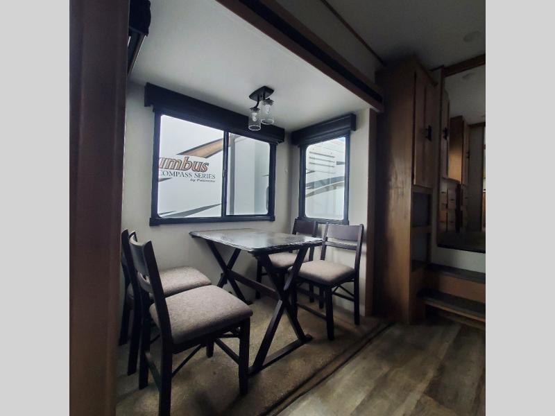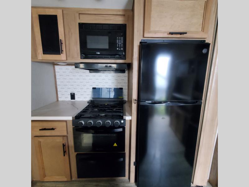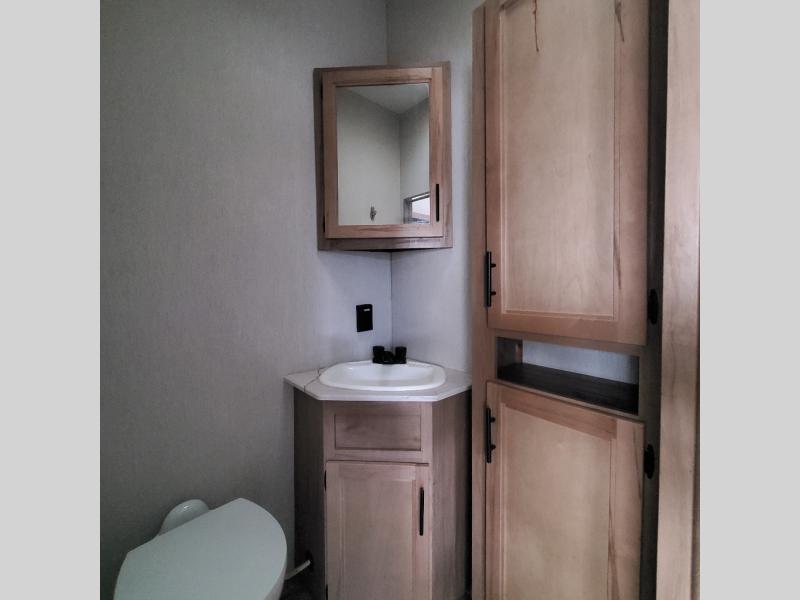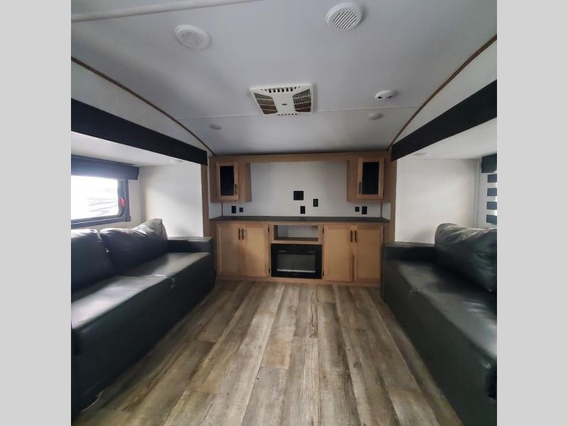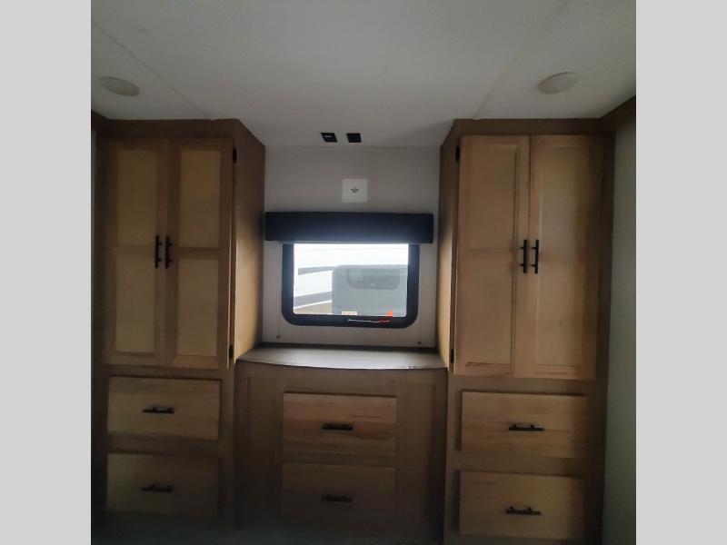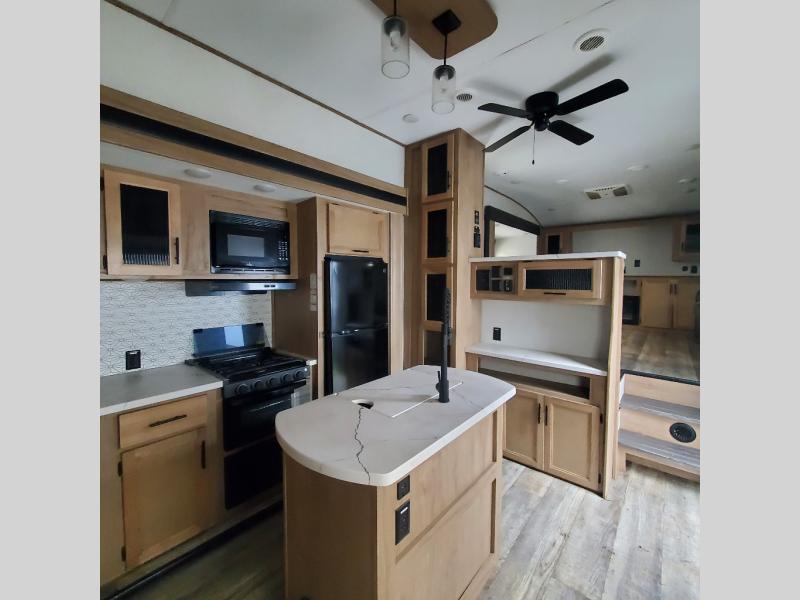 Five slides, a bath and a half, plus sleeping space for six make this fifth wheel the perfect choice! Once you arrive at your destination, prepare lunch on the exterior griddle, and fill your cup with the exterior ice storage. Inside, you'll find a kitchen island, plenty of storage space, plus a table with two fixed chairs and two folding chairs. The front living area will be a favorite place to hang out and this room can double as a bedroom with the two tri-fold sofas. There is also theater seating across from the entertainment center and fireplace, plus two cabinets for added storage space. When you're ready to call it a night, head to the master bedroom for a great night's rest on the king bed slide out. You will also love the full rear bath with dual bath sinks, a spacious shower, plus a closet with stackable washer and dryer prep!