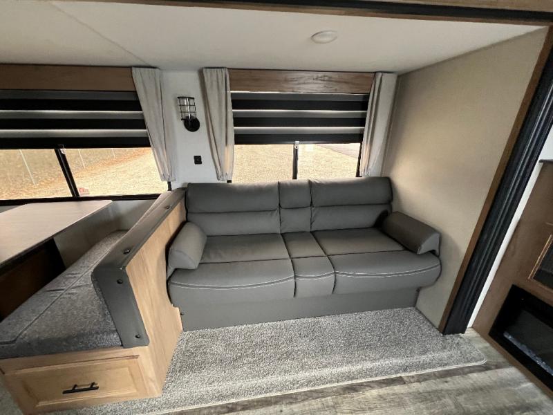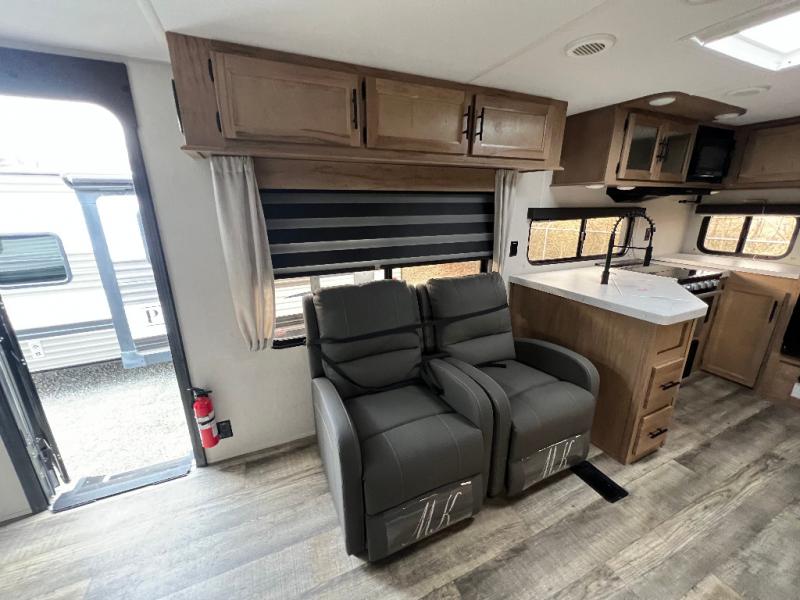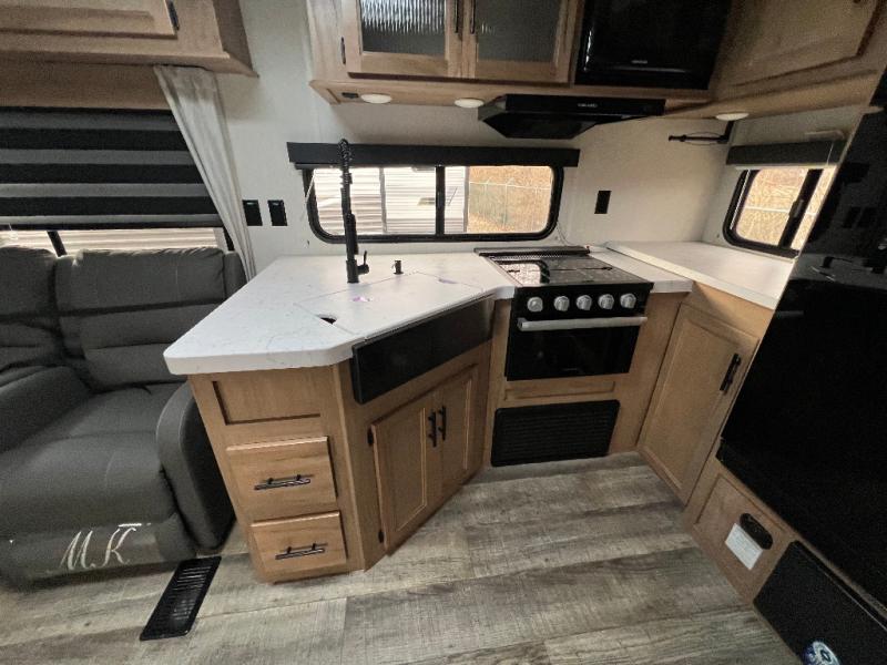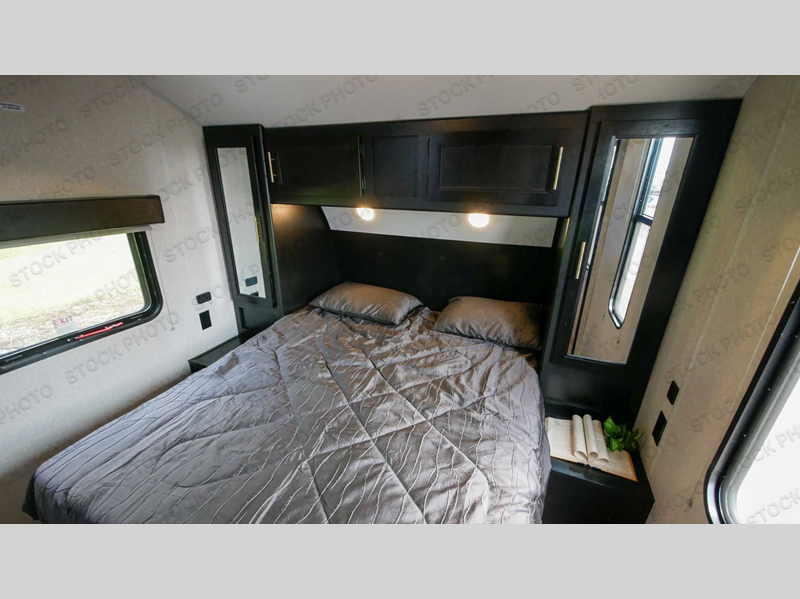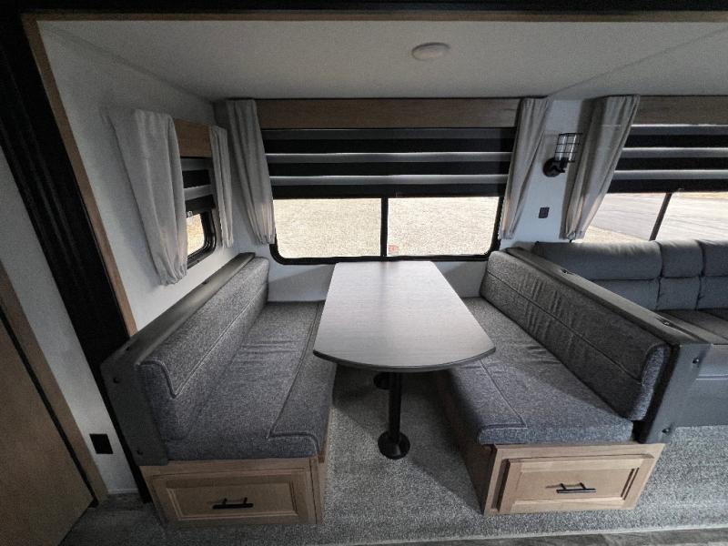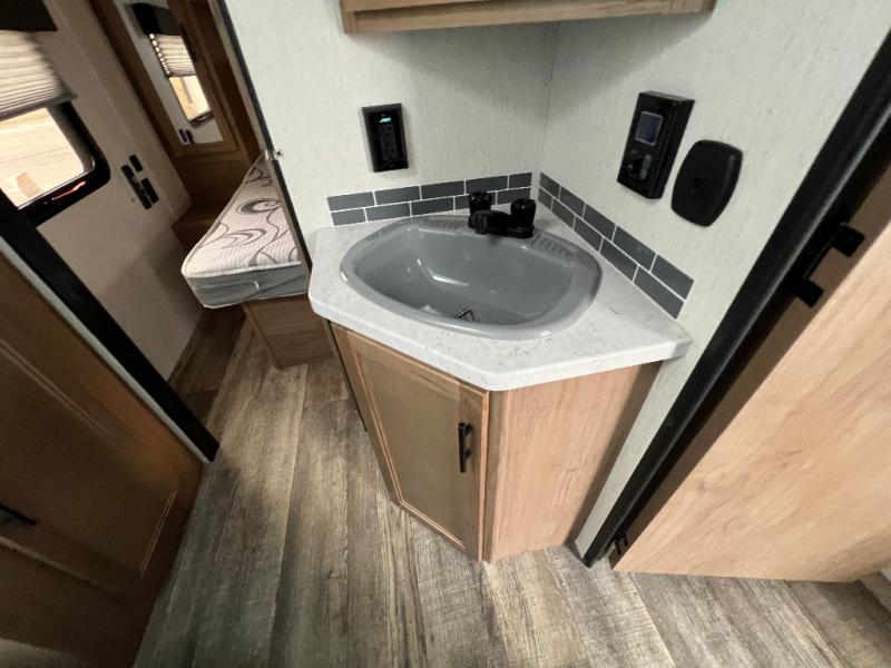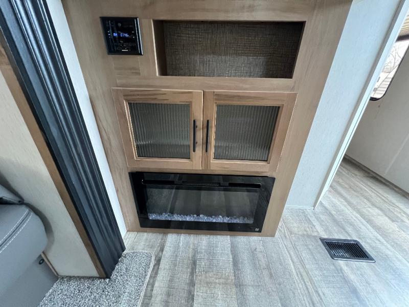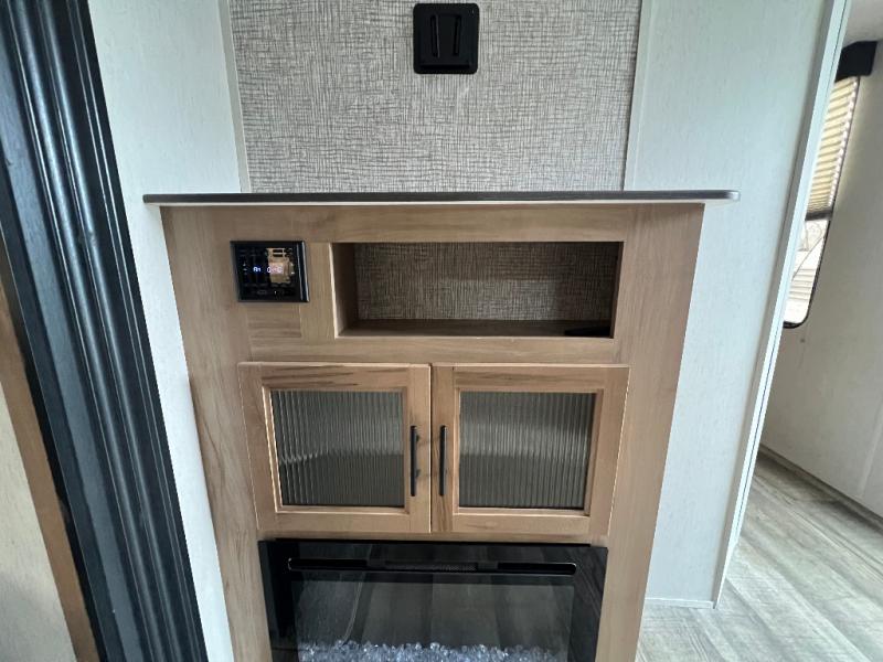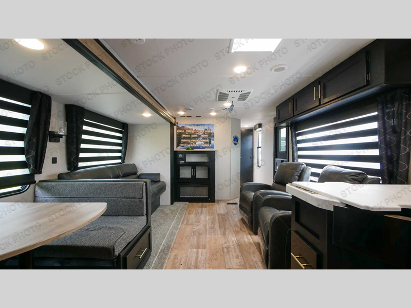 This middle entry trailer allows you to choose to head to the front private bedroom after passing the full dual entry bathroom or to the rear where you will find the kitchen as you pass the living area furniture and panoramic windows on both sides. You can dine at the booth dinette or while sitting on the chairs or sofa while enjoying the fireplace then easily clean up using the farm sink and extra counter space. And you can store plenty of dry good and snacks in the large pantry. The chef can also cook on the outside kitchen while everyone enjoys the 15' power awning. And there is storage found throughout including inside dinette drawers, the overhead cabinets, the bedroom dual wardrobes and more!