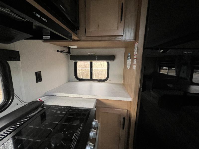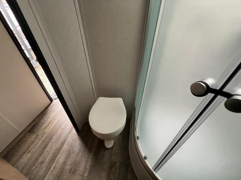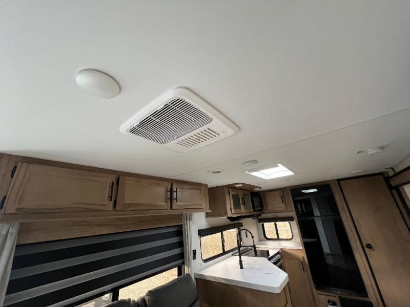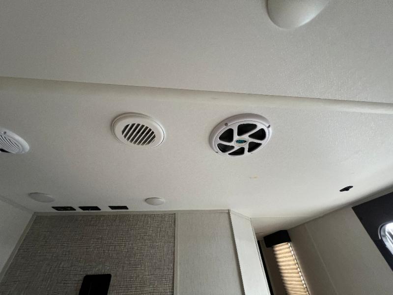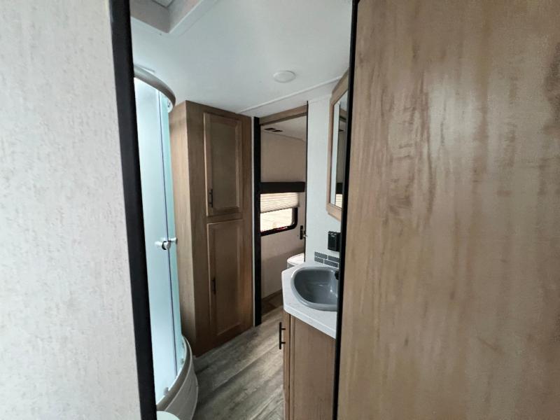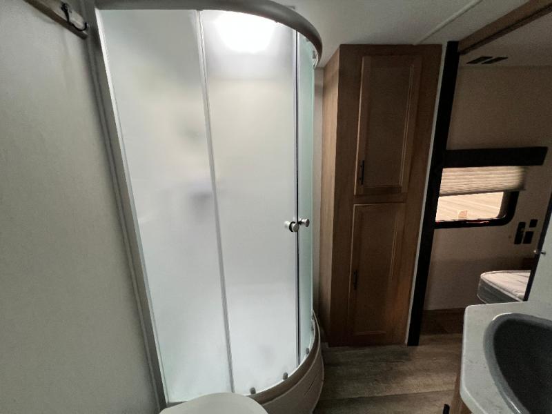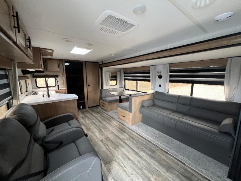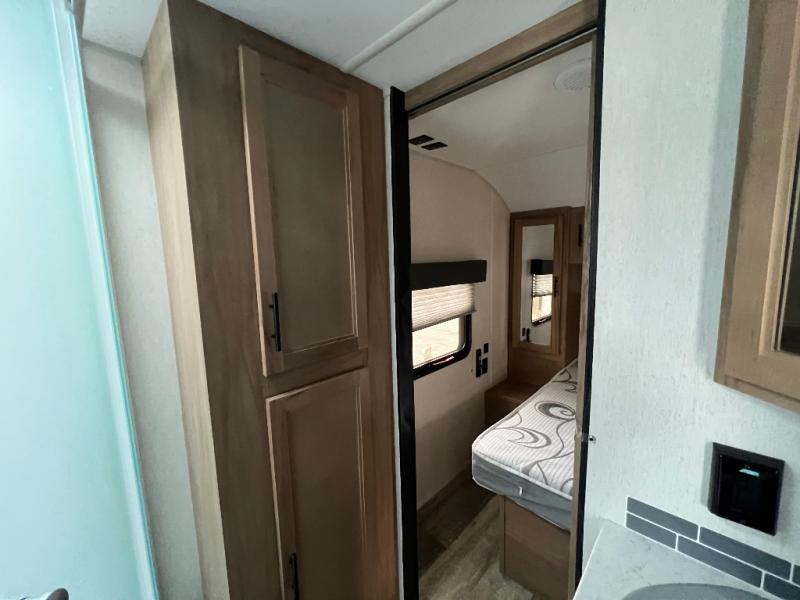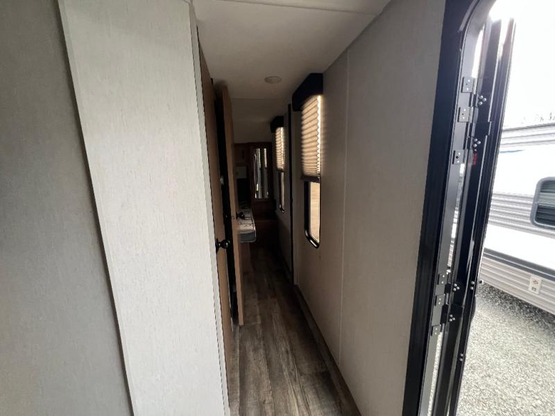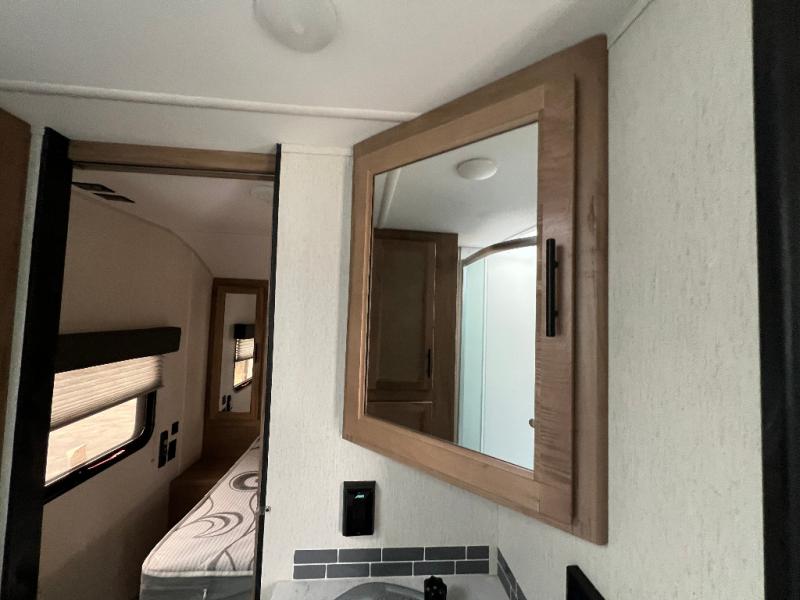 This middle entry trailer allows you to choose to head to the front private bedroom after passing the full dual entry bathroom or to the rear where you will find the kitchen as you pass the living area furniture and panoramic windows on both sides. You can dine at the booth dinette or while sitting on the chairs or sofa while enjoying the fireplace then easily clean up using the farm sink and extra counter space. And you can store plenty of dry good and snacks in the large pantry. The chef can also cook on the outside kitchen while everyone enjoys the 15' power awning. And there is storage found throughout including inside dinette drawers, the overhead cabinets, the bedroom dual wardrobes and more!