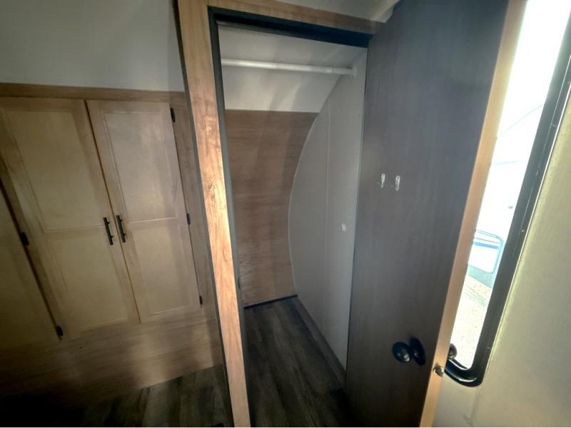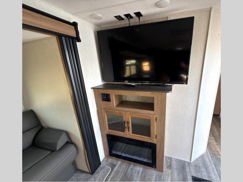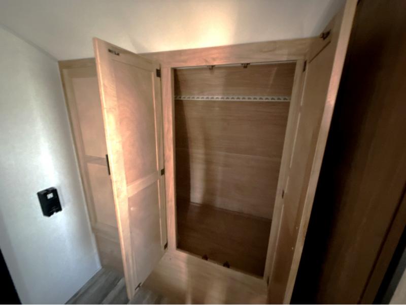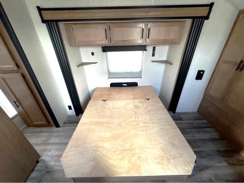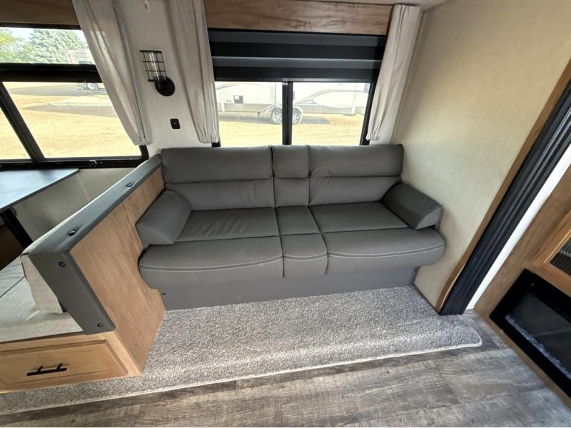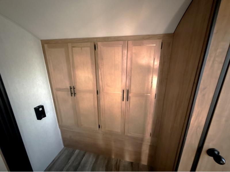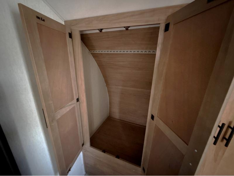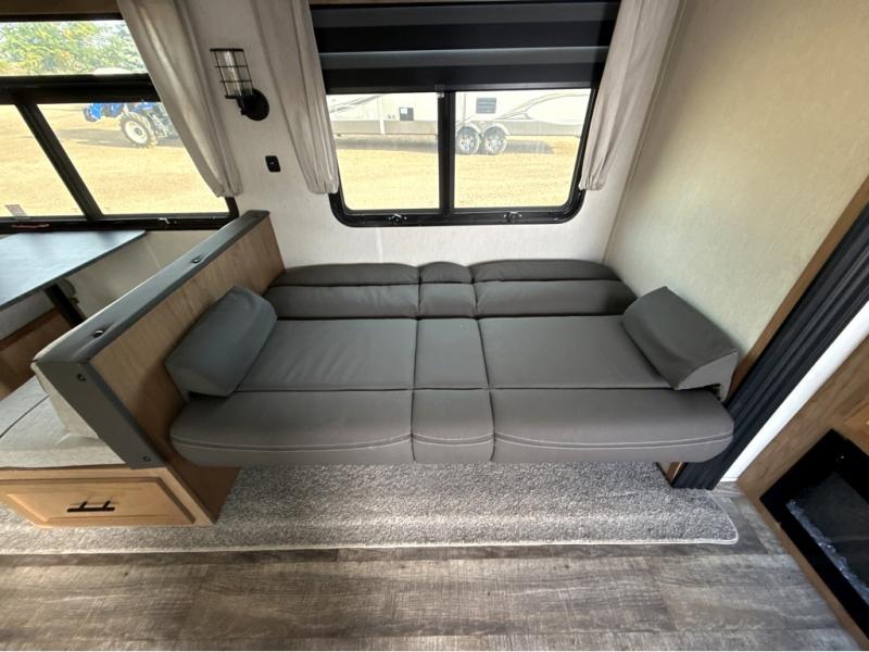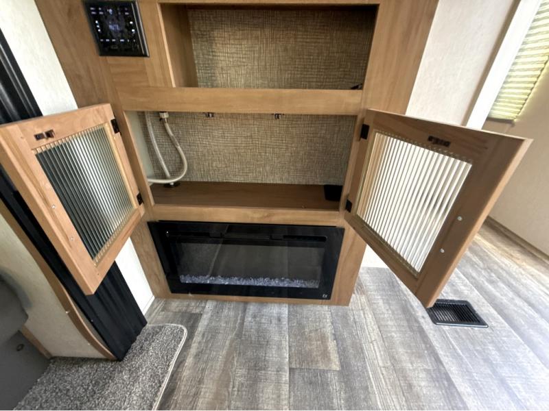 You and your spouse will love this spacious master suite with loads of storage including a space prepped for a washer/dryer option. There is a closet and dresser as well, plus there is a private entrance into the double entry bath. You can relax at night in true comfort on either the sofa or one of the two chairs while you enjoy the fireplace. The booth dinette is perfect for not only eating meals at or playing games, but also for transforming into an extra sleeping space for your grandkids. The rear kitchen has everything you will need to whip up some delicious meals and the large pantry is big enough to hold everyone's favorite snacks. And the cook can make meals using the outdoor kitchen as well.