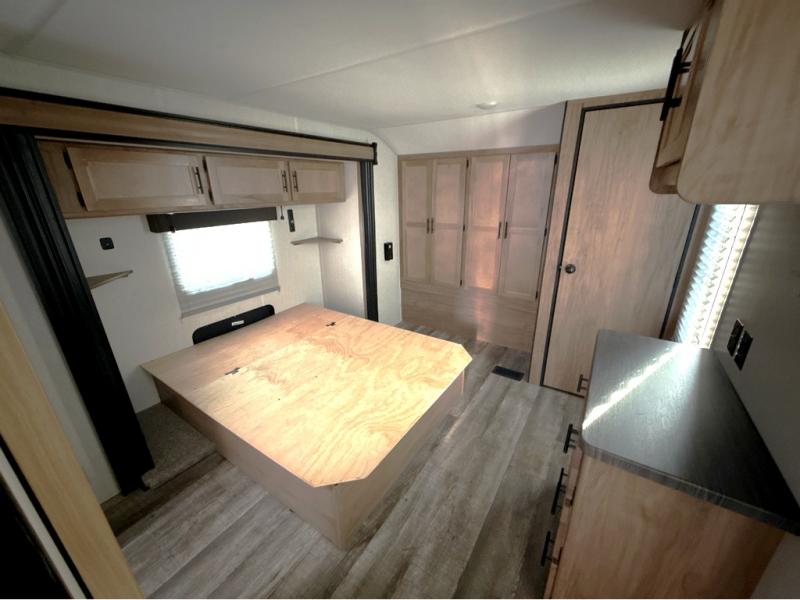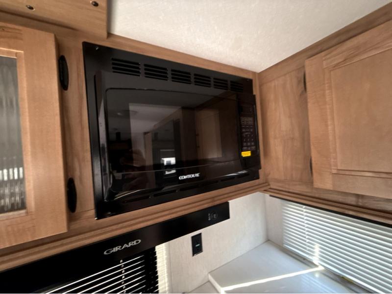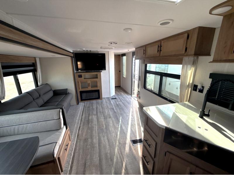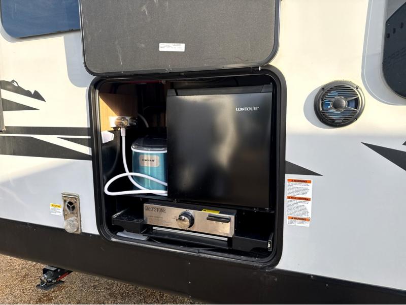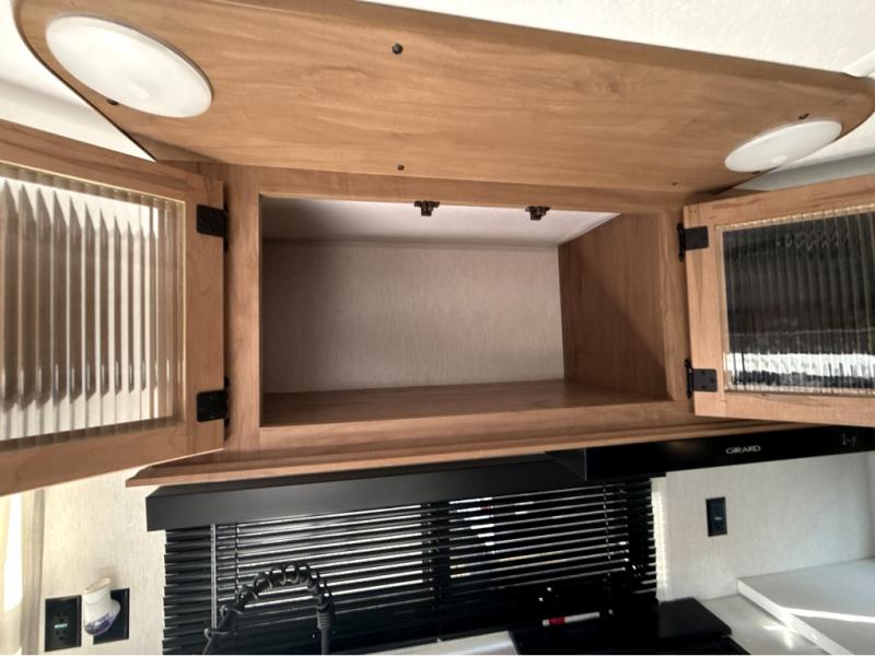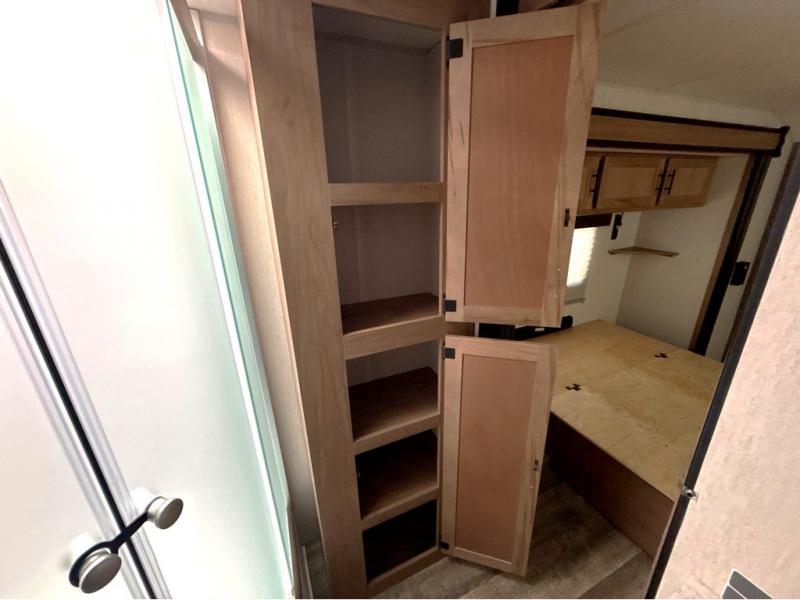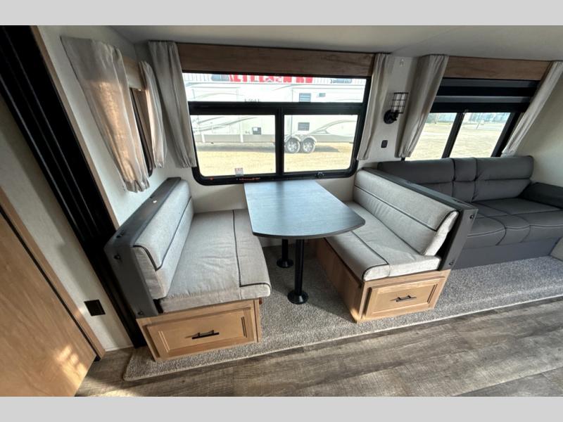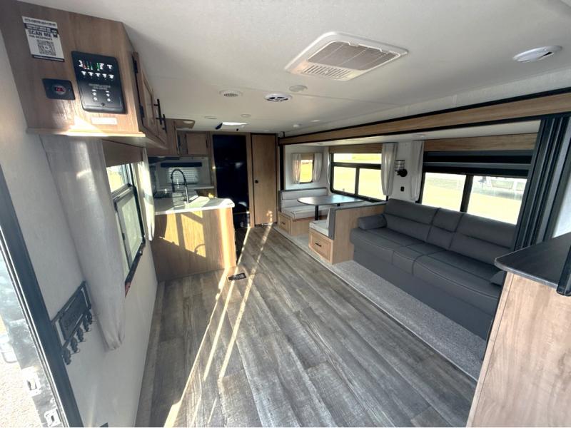 You and your spouse will love this spacious master suite with loads of storage including a space prepped for a washer/dryer option. There is a closet and dresser as well, plus there is a private entrance into the double entry bath. You can relax at night in true comfort on either the sofa or one of the two chairs while you enjoy the fireplace. The booth dinette is perfect for not only eating meals at or playing games, but also for transforming into an extra sleeping space for your grandkids. The rear kitchen has everything you will need to whip up some delicious meals and the large pantry is big enough to hold everyone's favorite snacks. And the cook can make meals using the outdoor kitchen as well.
