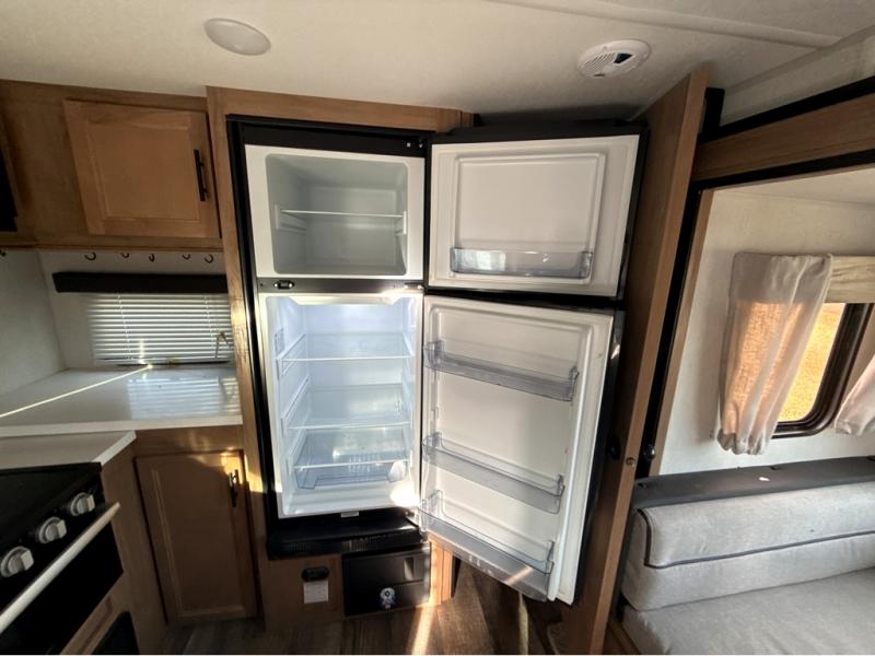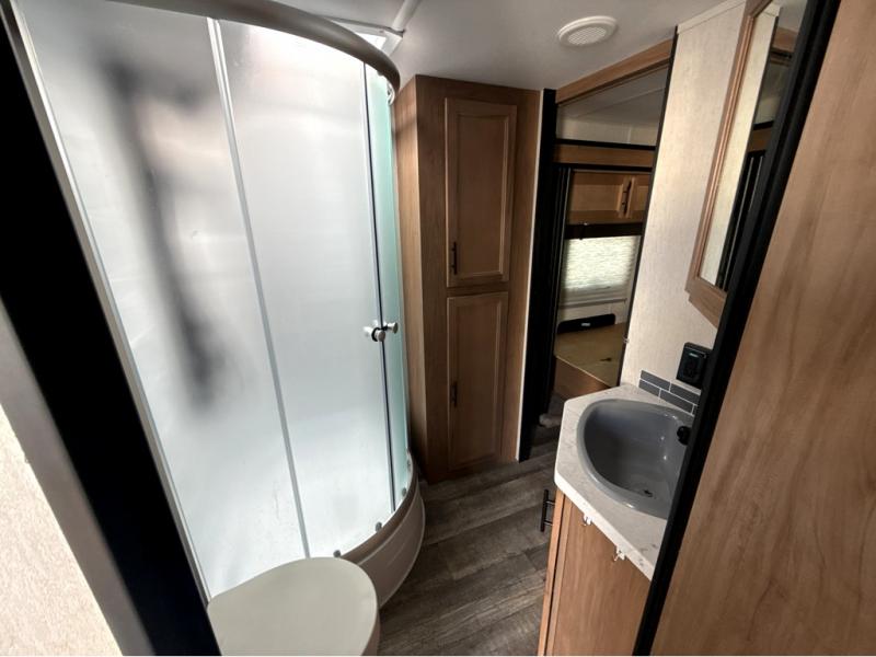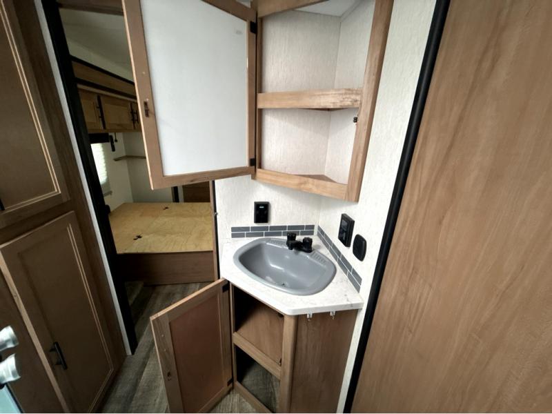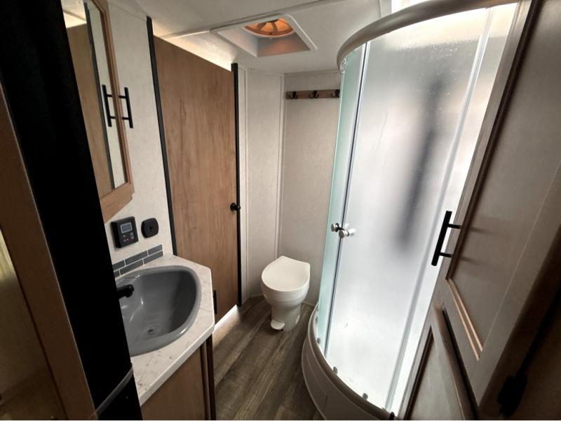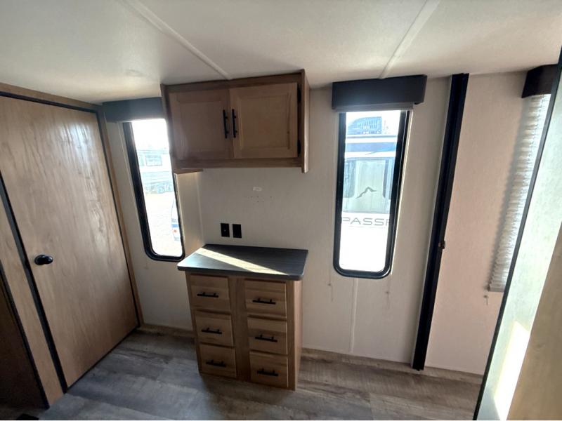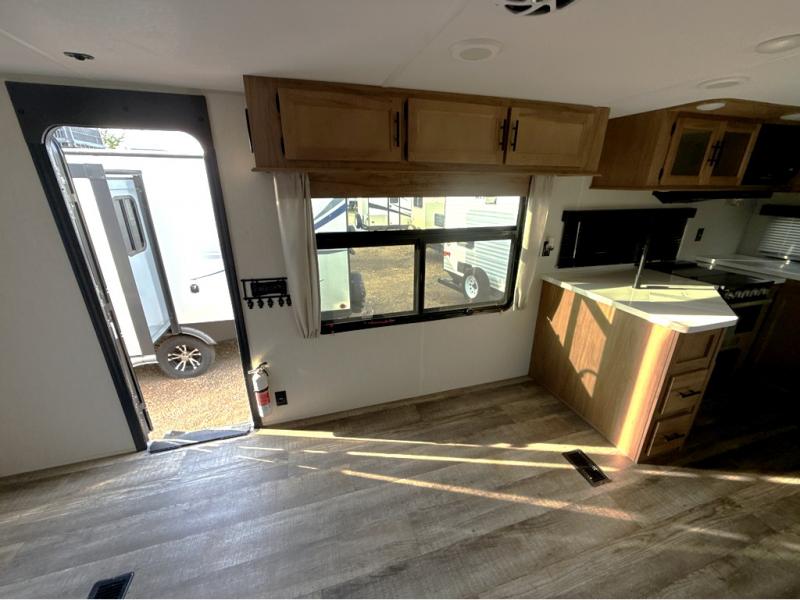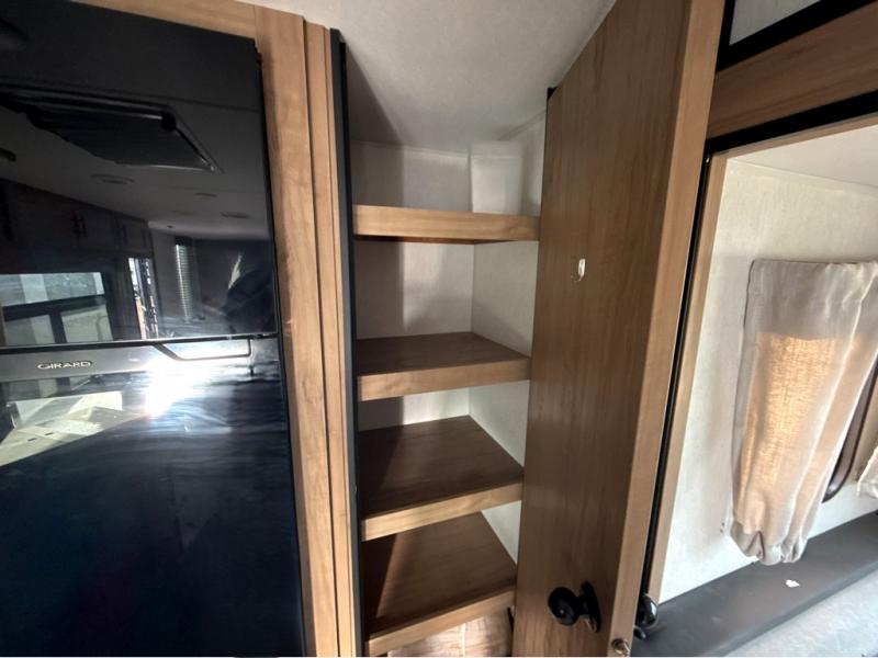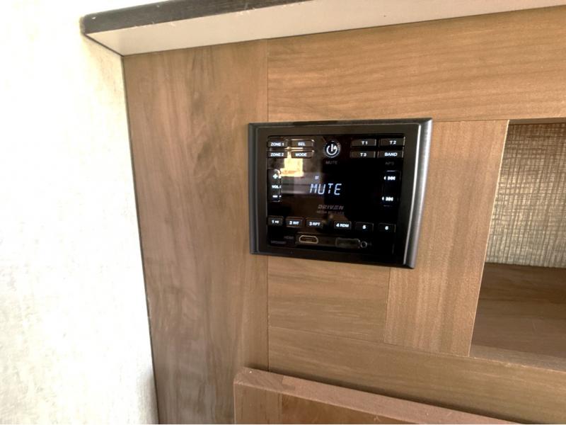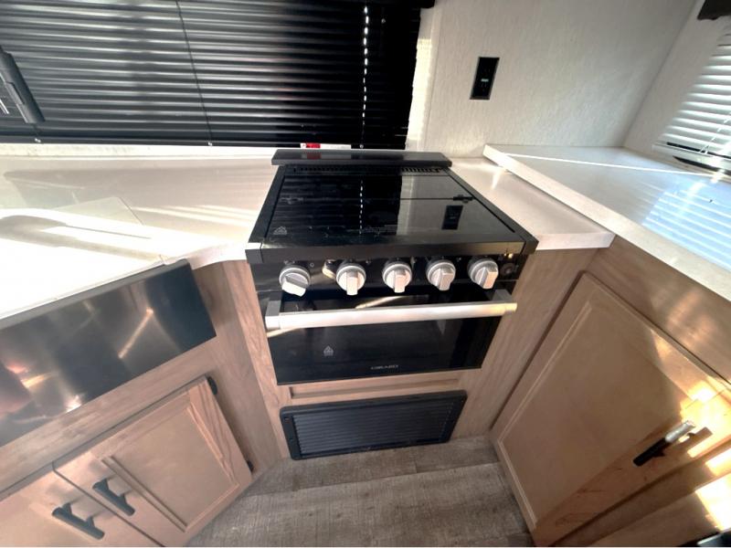 You and your spouse will love this spacious master suite with loads of storage including a space prepped for a washer/dryer option. There is a closet and dresser as well, plus there is a private entrance into the double entry bath. You can relax at night in true comfort on either the sofa or one of the two chairs while you enjoy the fireplace. The booth dinette is perfect for not only eating meals at or playing games, but also for transforming into an extra sleeping space for your grandkids. The rear kitchen has everything you will need to whip up some delicious meals and the large pantry is big enough to hold everyone's favorite snacks. And the cook can make meals using the outdoor kitchen as well.