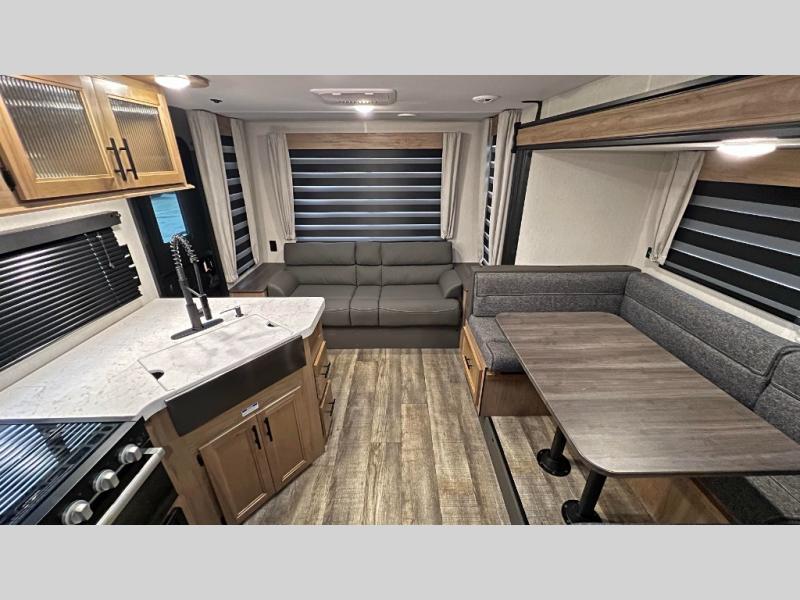 This Cherokee Grey Wolf travel trailer is perfect for your small family and will leave you planning your next outing before you are back from your current weekend away! You will find all of the comforts you need with plenty of livable space including a U-shaped dinette slide. There is also a sofa for more seating when company arrives, and there are end tables on either side to prevent spills. A spacious walk-through bath leads to a front private bedroom where you will enjoy a great night's rest on a comfortable queen-size bed. You will find ample storage for clothing in the wardrobes that are above handy nightstands for your personal things. There are even lights mounted above the bed on each side which makes it easy to read a couple of chapters before drifting off to sleep.