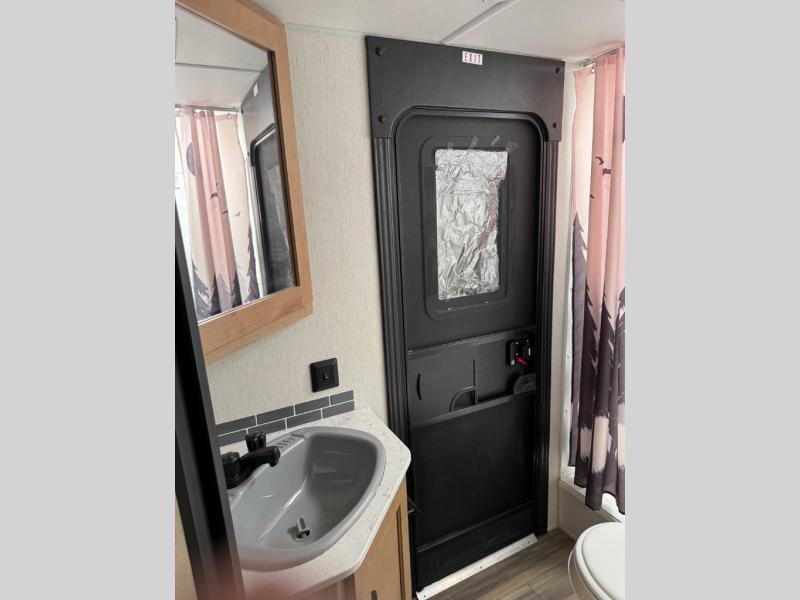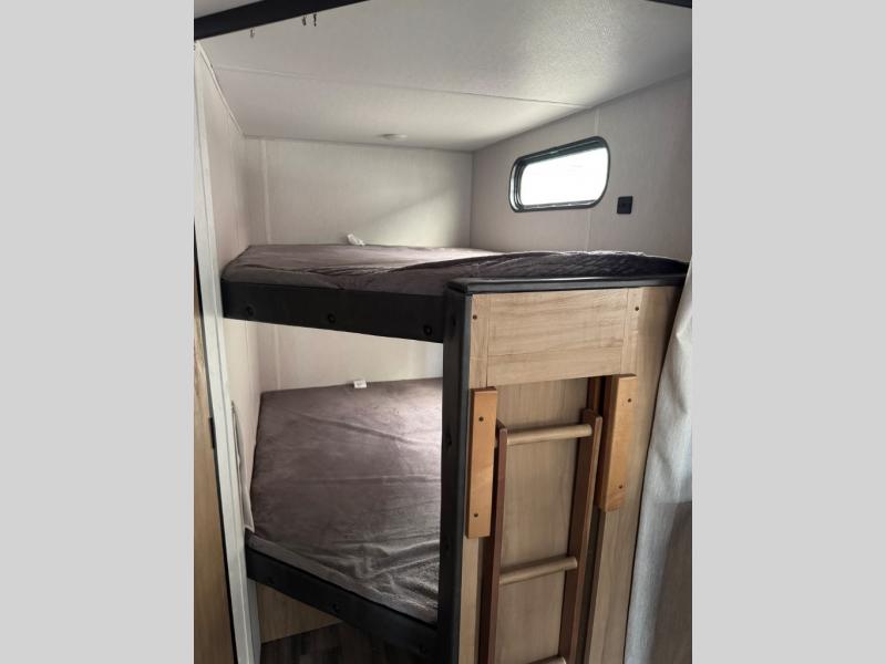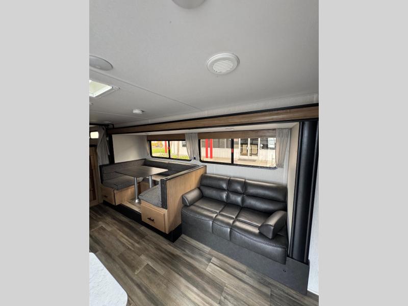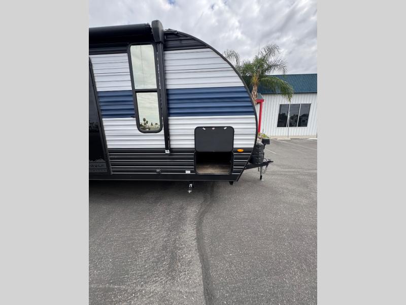 Come on inside this Cherokee Grey Wolf travel trailer and experience the convenience of a smooth flow of traffic in and out with two entry doors. The rear door leads into a full bath which is great for accessibility when outside and when you need to use the bathroom. Once inside, you will notice the large U-shaped dinette and the sofa which sit on the slide and create a spacious footprint for moving about, as well as great places to play games and socialize with your friends and family. A walk-in pantry provides plenty of storage allowing you to stock up on your favorite snacks and dry goods for your family adventure. At night, there is sleeping space for everyone between the double-size bunks and the queen-size bed, plus the furniture.