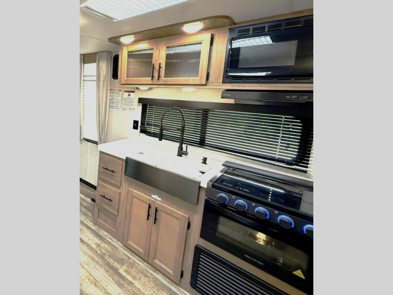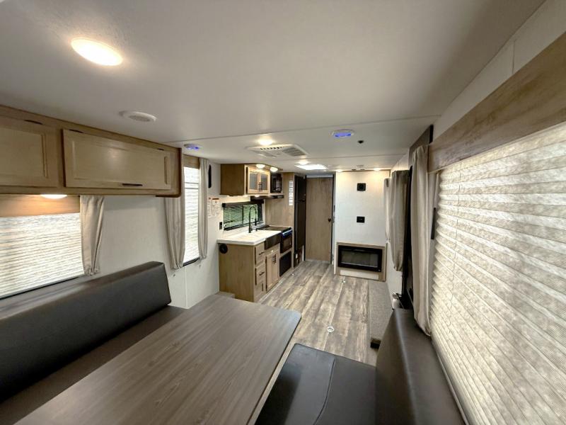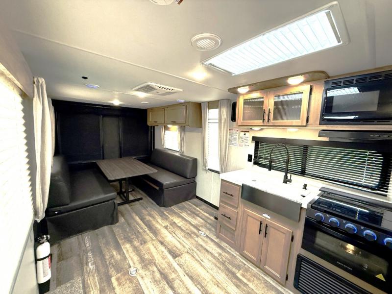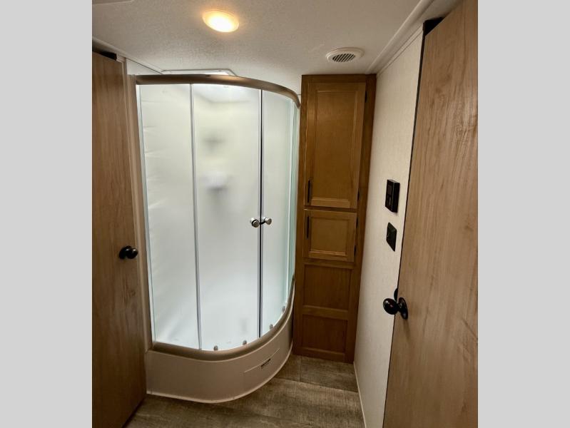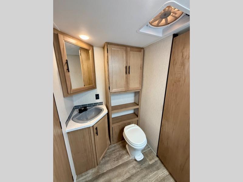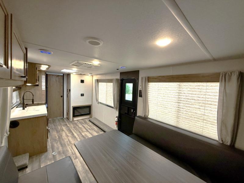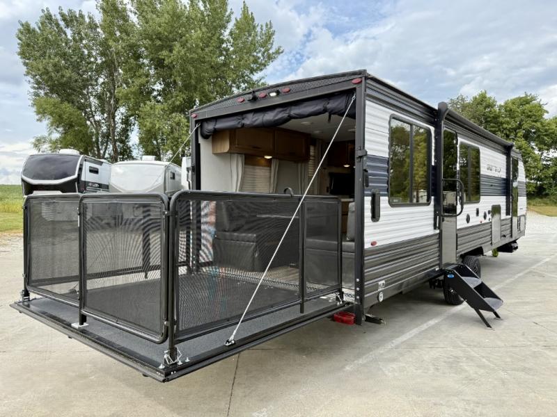 You won't want to miss out on an adventure taken with this Cherokee Grey Wolf toy hauler! This unit provides both an indoor and outdoor kitchen so that you can choose where you want to spend your time preparing dinner, and if you like eating your meals inside away from the bugs, you'll be able to sit down on one of the two fold-down sofas with dinette table in between and enjoy that meal. You'll also appreciate having a walk-through bath because it provides an entry door on either side so that you can discreetly enter the bathroom from the front private bedroom in the early morning hours.