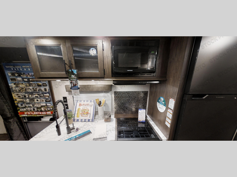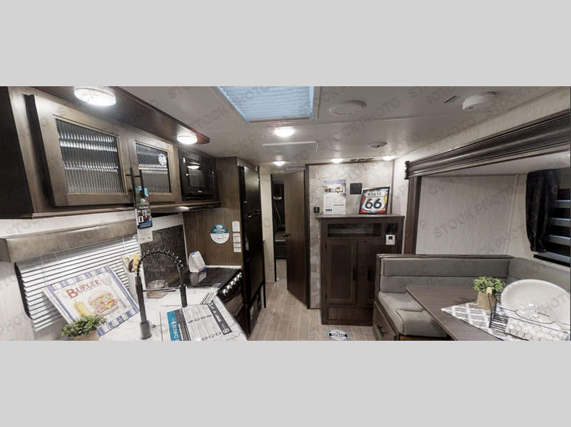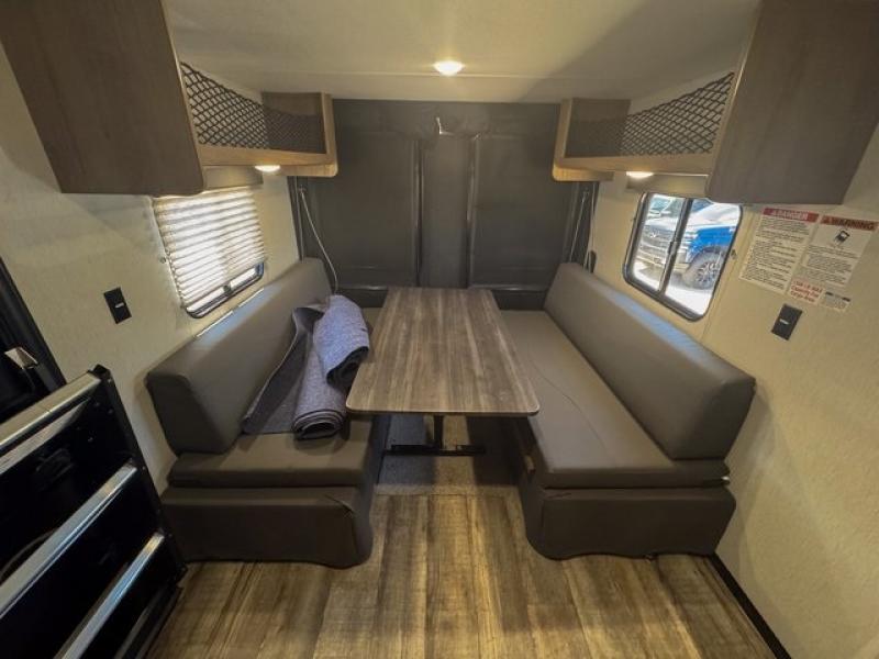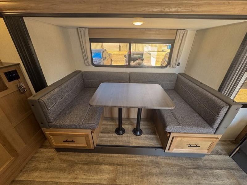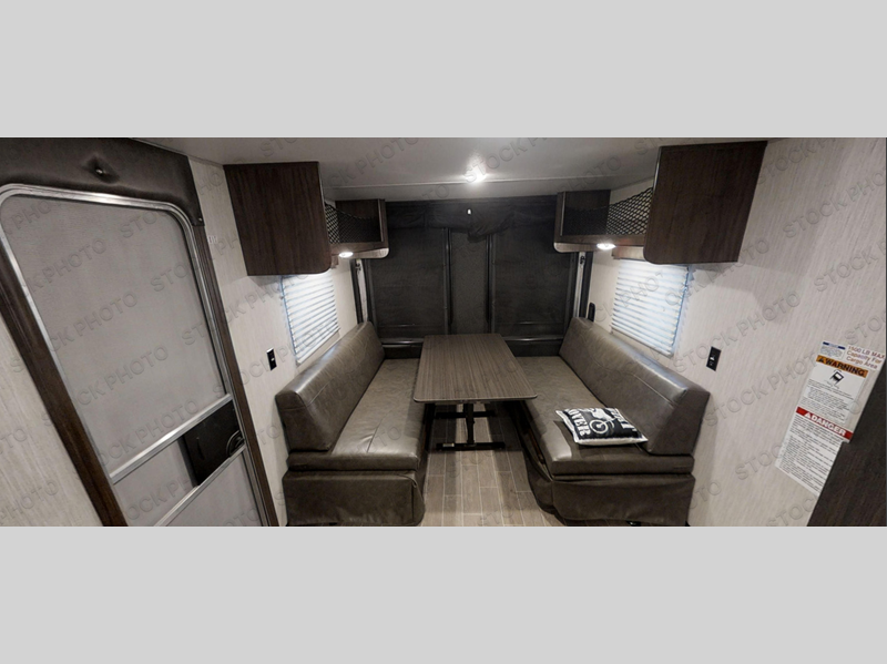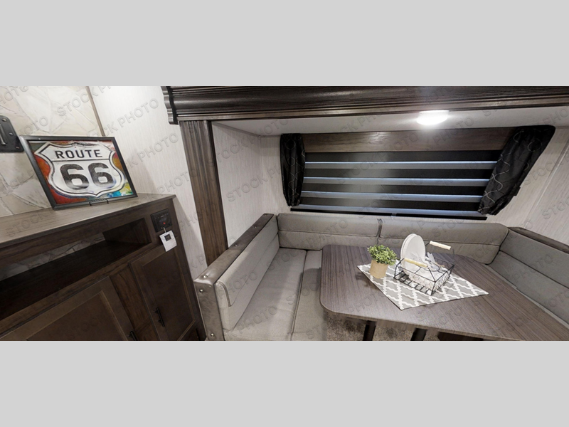 This Cherokee Grey Wolf toy hauler is perfect for those who are concerned about keeping the fuel smells and grime from entering the main living area. In this unit you can enjoy the separation with a door and the walk-through bath. In the cargo area, you will have plenty of space for hauling all of your favorite toys. This area also features dual fold-down sofas with a dinette table that is great for your thrill seekers to come in for a break from riding. It also allows quick access into the bathroom without having to wander through the entire main living area where you are likely to leave a trail behind. After a full day of playing hard, you can get cleaned up and head into the main kitchen area where you will enjoy a U-shaped dinette. A full kitchen allows you to refuel your body, and there is also a queen Murphy bed up front so you can enjoy seating and sleeping space!