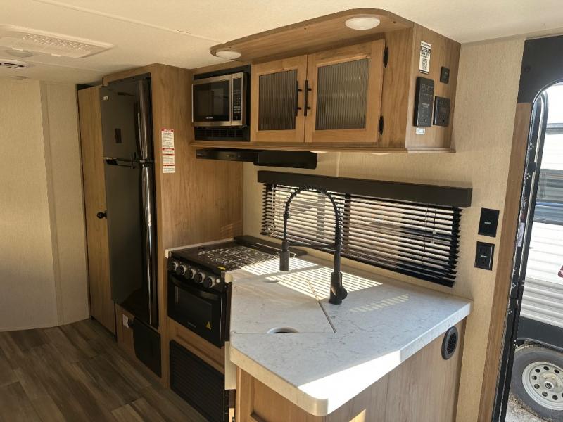 You will have such a great time making memories in this Cherokee Grey Wolf travel trailer! This amazing trailer not only has a master suite up front, but it also has another private bedroom in the back which means that both you and the rest of your fellow campers will sleep peacefully and privately. There is also a U-shaped dinette and sofa on the large slide in the main living area so that if you have anyone else traveling with you, they can also have a place to sleep. A full kitchen with a three-burner cooktop and oven will help you whip up a hearty meal to replenish your tired bodies, and a oversized pantry will hold onto your snacks and sweets for later.