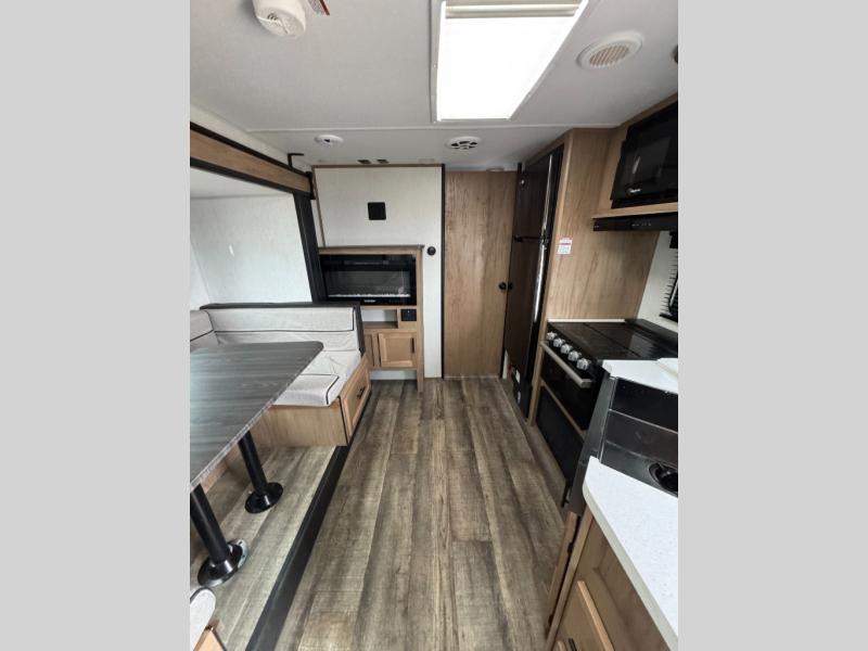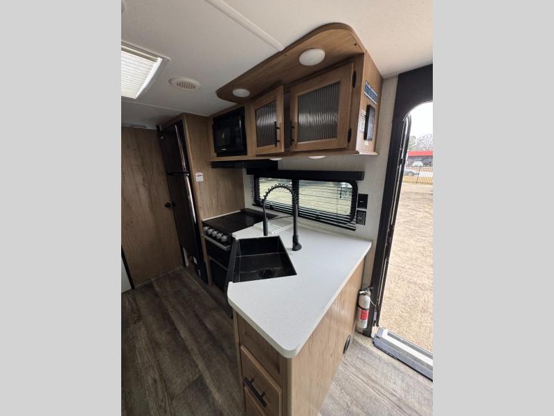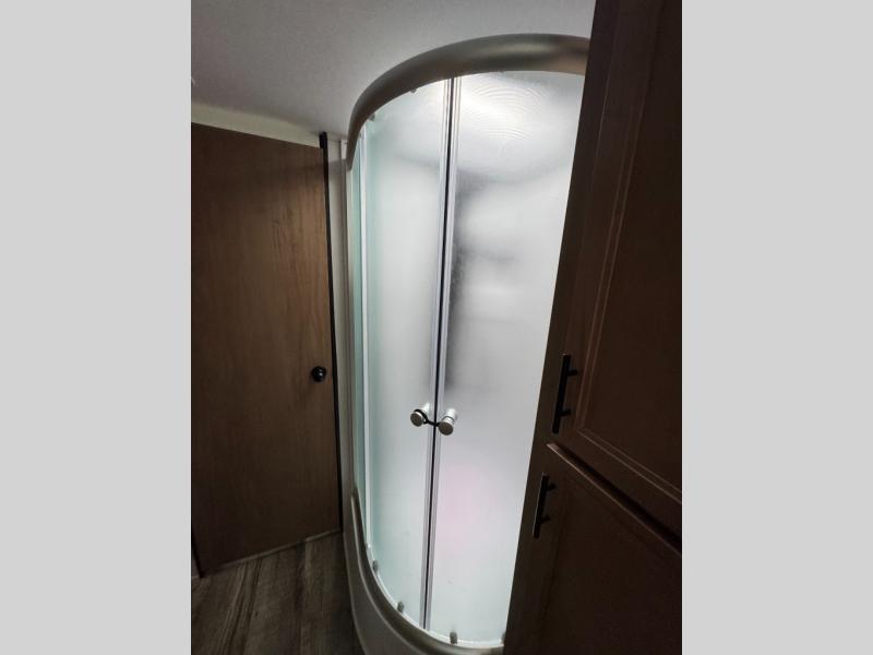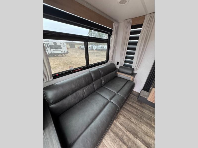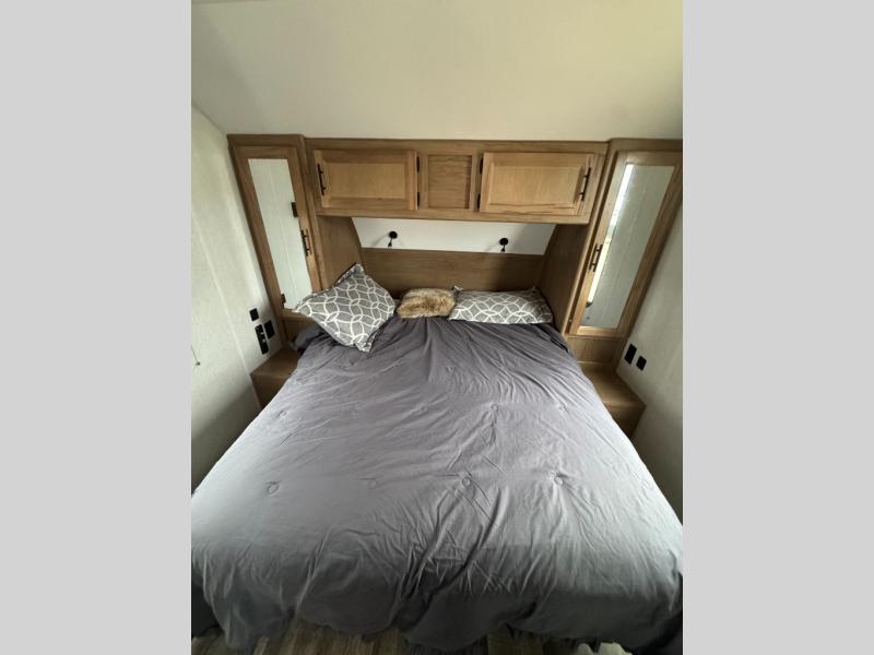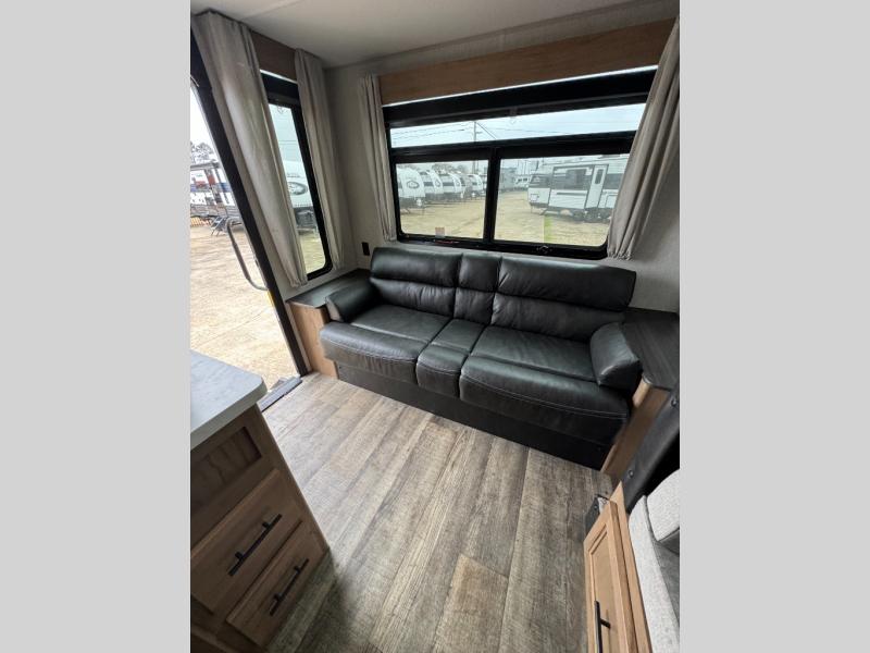 This Cherokee Grey Wolf Black Label travel trailer is perfect for your small family and will leave you planning your next outing before you are back from your current weekend away! You will find all of the comforts you need with plenty of livable space including a U-shaped dinette slide. There is also a sofa for more seating when company arrives, plus there are end tables on either side to prevent spills. A spacious walk-through bath leads to a front private bedroom where you will enjoy a great night's rest on a comfortable queen-size bed. You will find ample storage for clothing in the wardrobes that are above handy nightstands for your personal things. There are even lights mounted above the bed on each side which makes it easy to read a couple of chapters before drifting off to sleep.