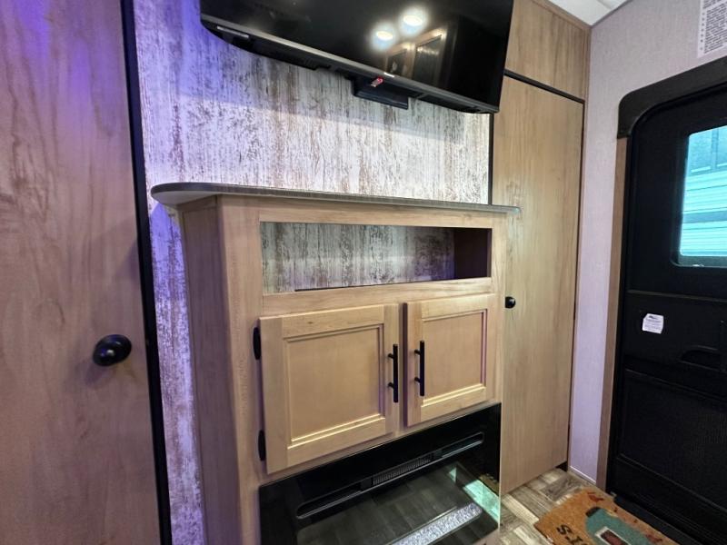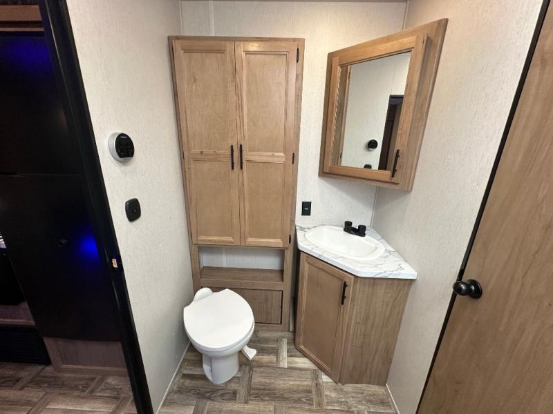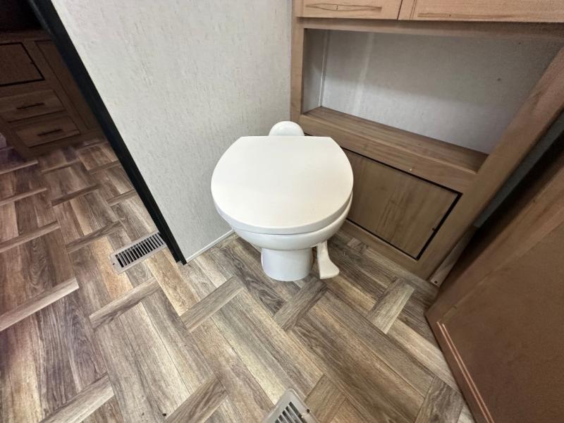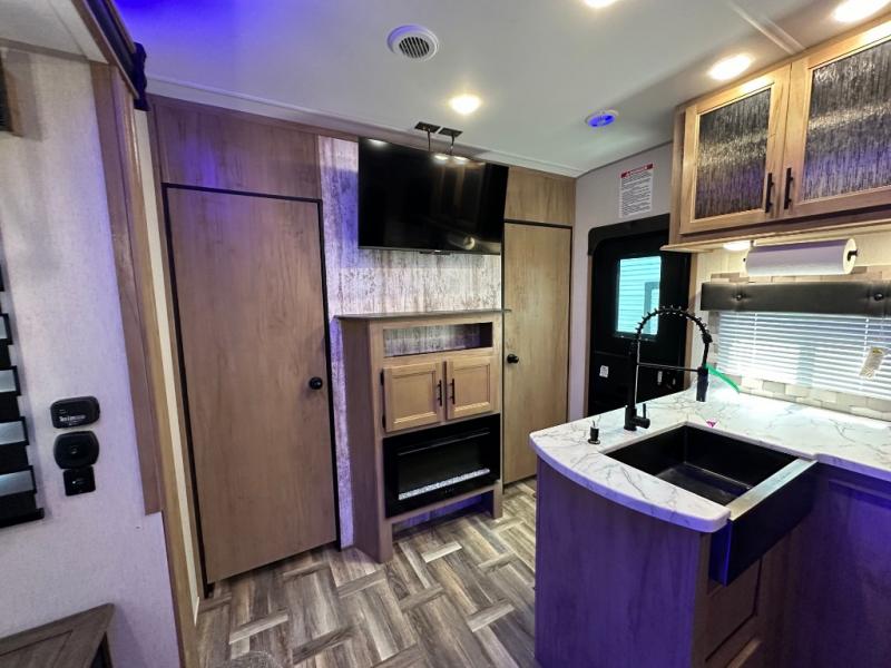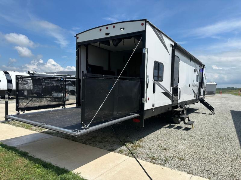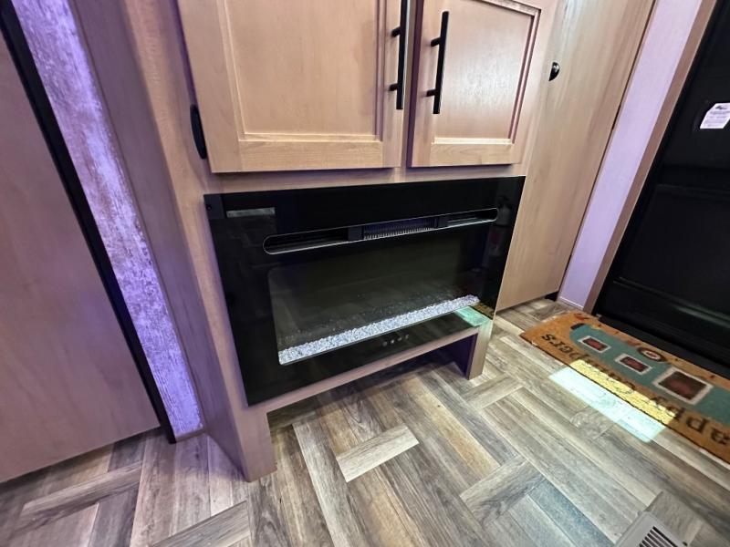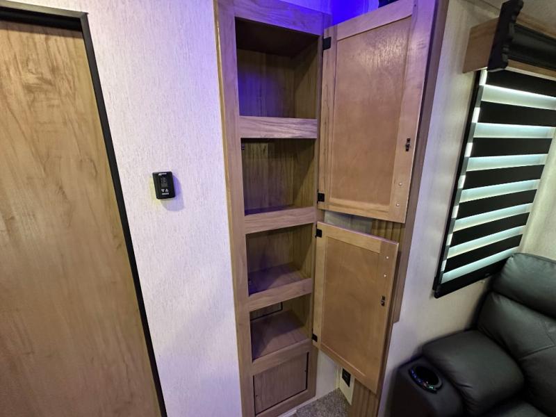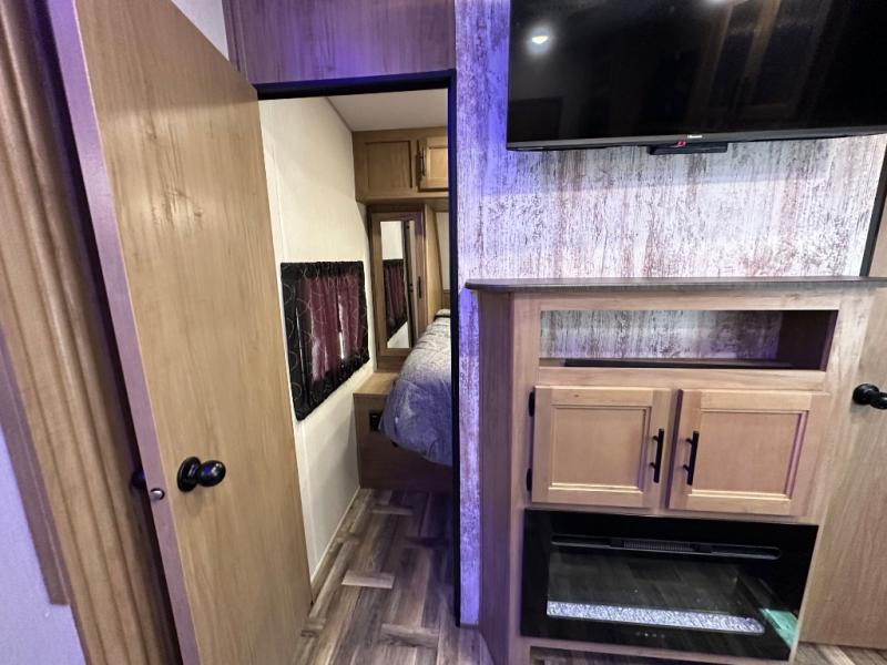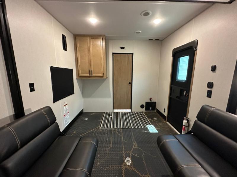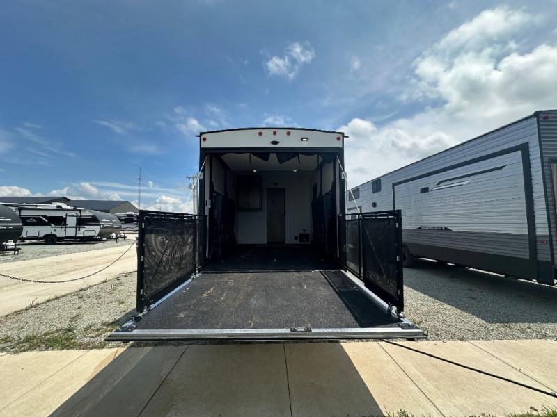 You are going to want this toy hauler for all of your adventures! It features a 12' garage area that has a folding dinette table with a Happijac bed lift system above it and one of the dual entry doors to the unit. The walk-through bathroom leads directly into the kitchen/living area. Here you will find a three burner cooktop to prepare your best meals, a U-shaped dinette to enjoy them at or you can switch it out for the optional party recliner sofa, and an entertainment center with a fireplace for a cozy evening indoors. Enjoy a good night's rest each night on the 67" x 74" Wolf Pack king bed with wardrobes on either side in the front private bedroom!