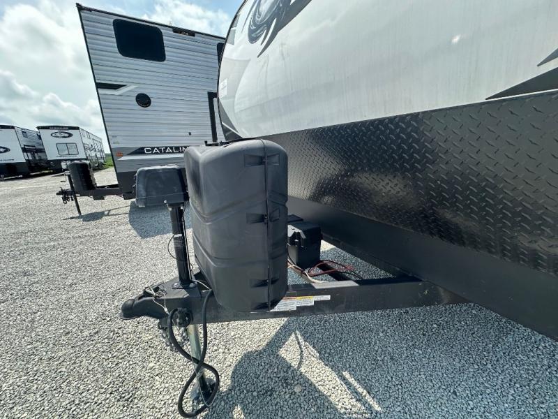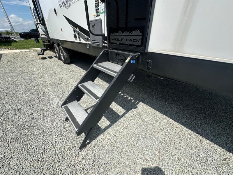 Run with the pack in any one of these Forest River Cherokee Wolf Pack toy haulers! They are affordable and versatile with a 102" widebody design to pack in all of the necessary features for a great adventure with your family and toys. The grey high gloss gel exterior will turn heads on the highway and the LED interior/exterior lights will make life easier. An outside shower with hot and cold water helps to keep the mud outside where it belongs. With an external 30 gallon fuel station, you won't have to worry about your toys being low on fuel. The Platinum package adds extra conveniences like a ramp door patio deck railing system, a Happijac bed lift system, and an industrial rubber garage floor on enclosed garage models. Come find the perfect model for you today!
