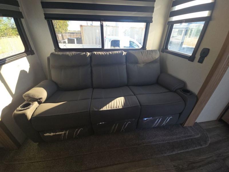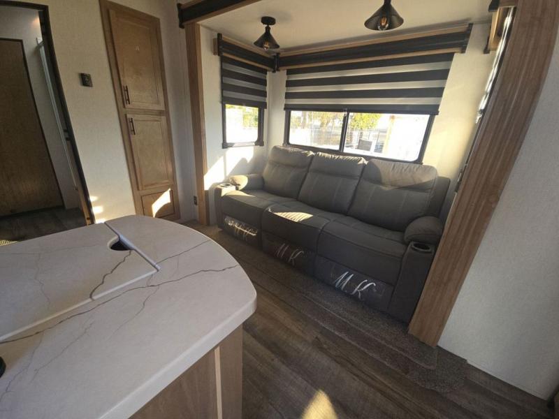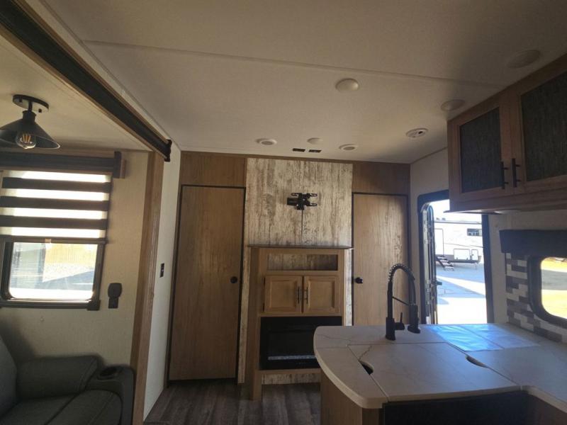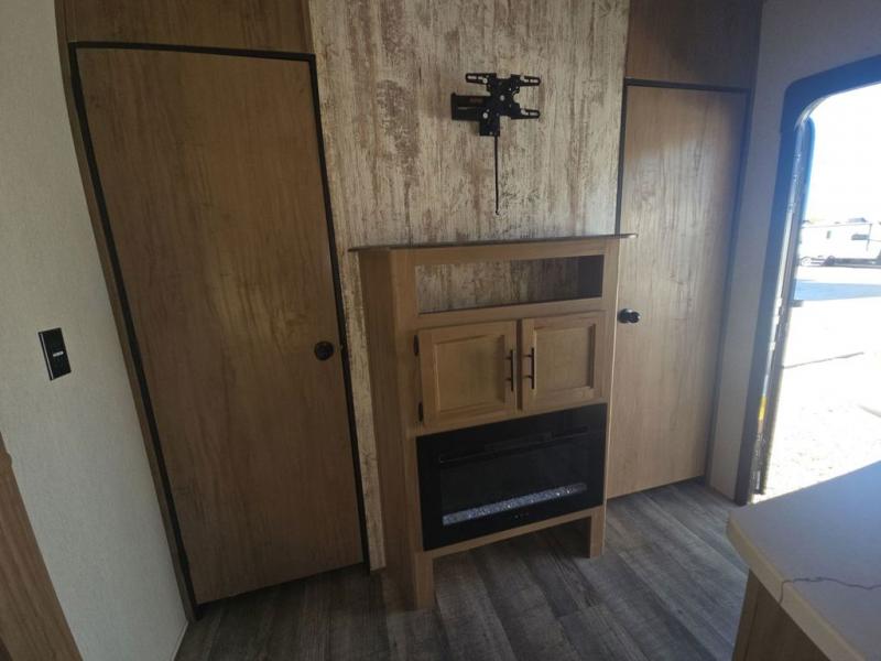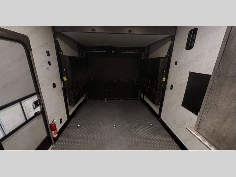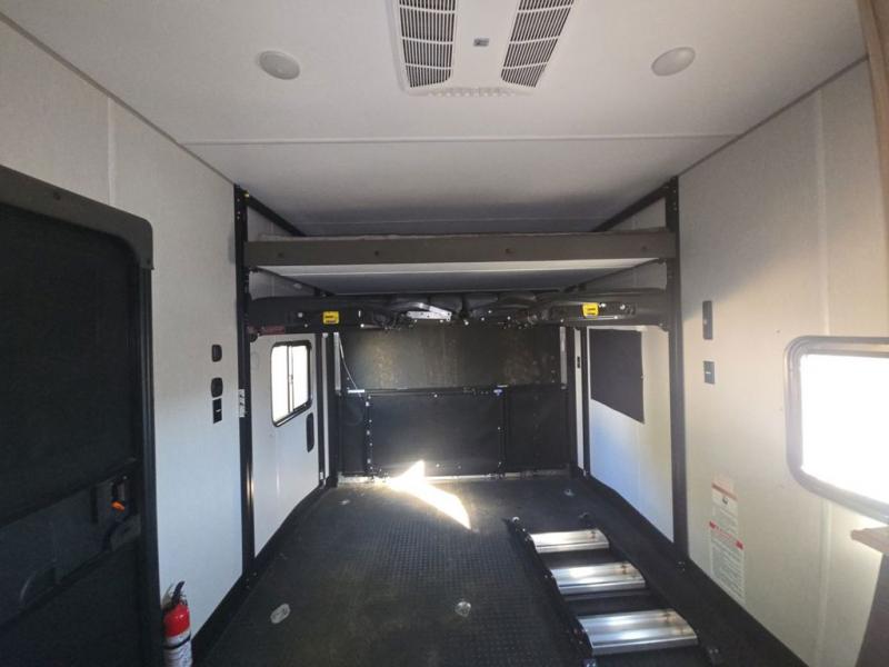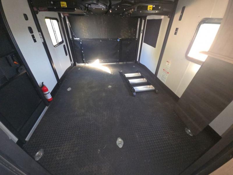 You are going to want this toy hauler for all of your adventures! It features a 12' garage area that has a folding dinette table with a Happijac bed lift system above it and one of the dual entry doors to the unit. The walk-through bathroom leads directly into the kitchen/living area. Here you will find a three burner cooktop to prepare your best meals, a U-shaped dinette to enjoy them at or you can switch it out for the optional party recliner sofa, and an entertainment center with a fireplace for a cozy evening indoors. Enjoy a good night's rest each night on the 67" x 74" Wolf Pack king bed with wardrobes on either side in the front private bedroom!