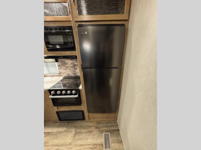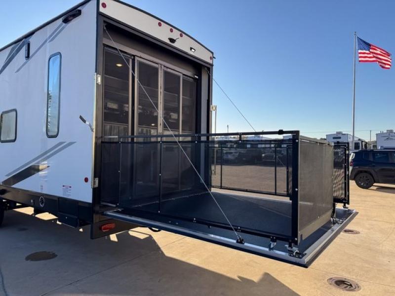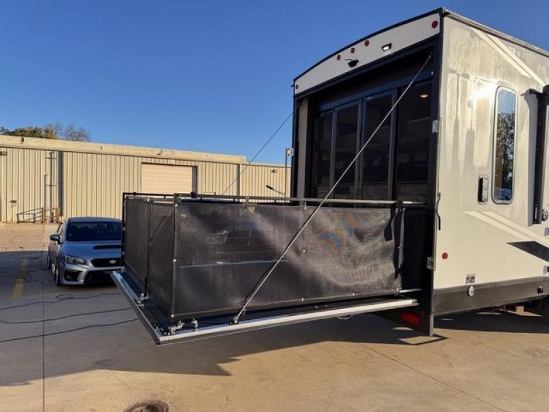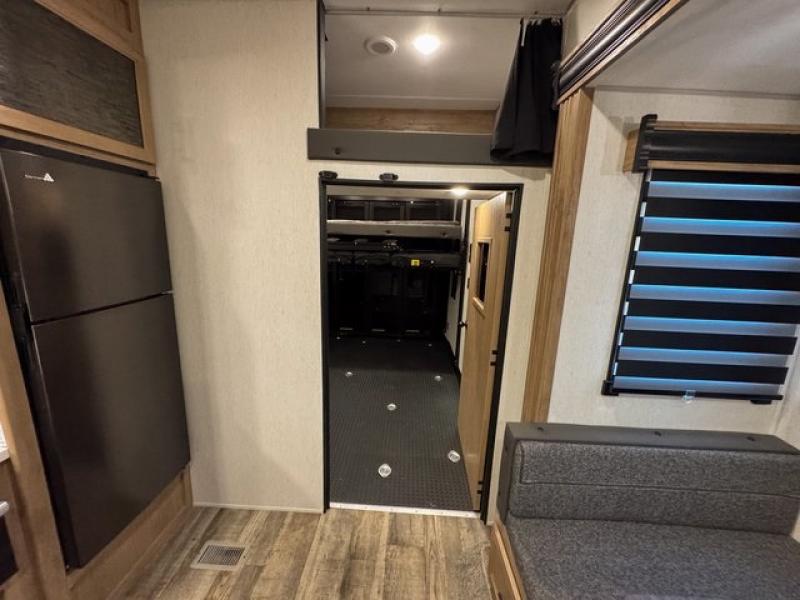 With dual entry doors, you will experience a smooth flow of traffic in and out of this toy hauler! One of the entrances leads into the 12' garage area with a folding dinette table below a Happijac bed lift system, and an area prepped to add an optional washer and dryer. The chef will have everything they need to prepare their best home cooked meals indoors or they can head to the outside kitchen to breathe in some fresh air while they cook. Gather together at the booth dinette for game night or relax on the sofa across from the entertainment center with a fireplace. When you're ready to wind down your nights, clean up in the dual entry bathroom with the radius shower then head directly into the front private bedroom where you can rest your head on the 67" x 74" Wolf Pack king bed!