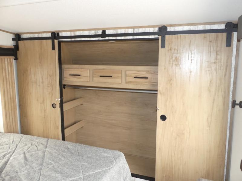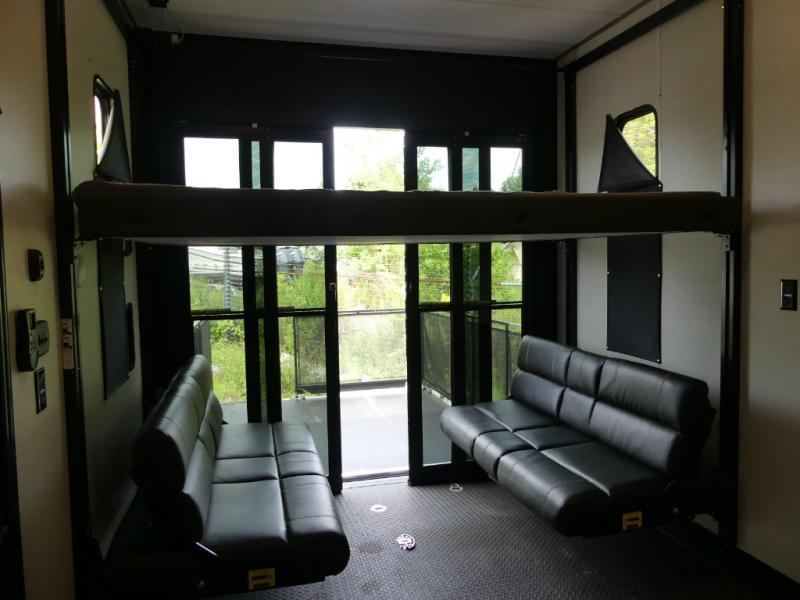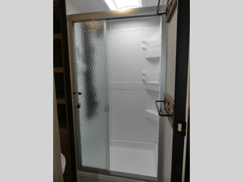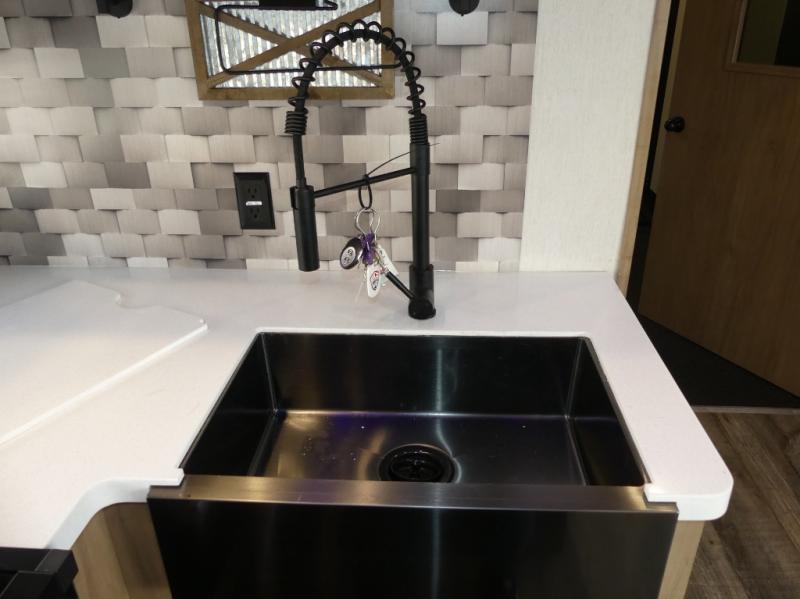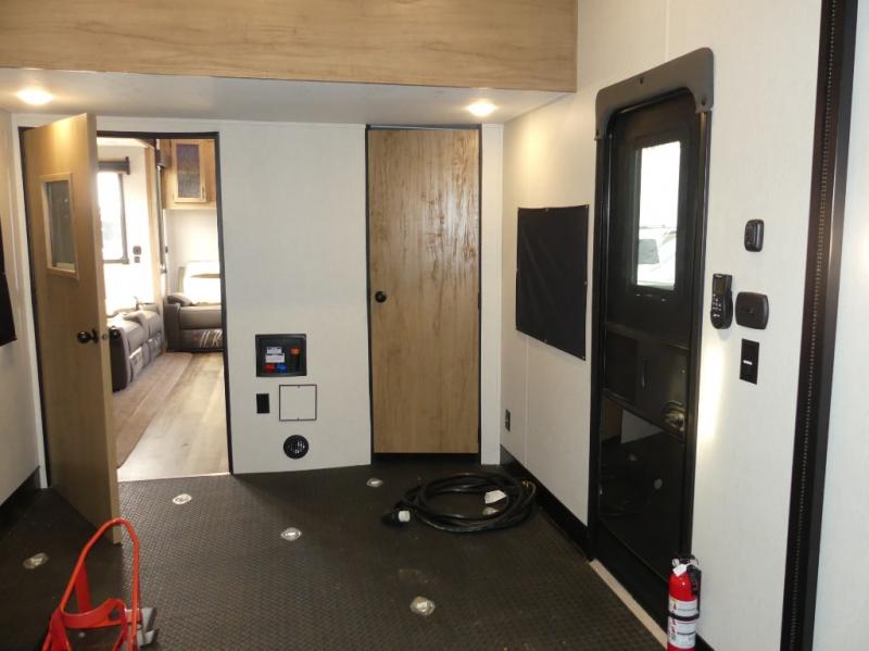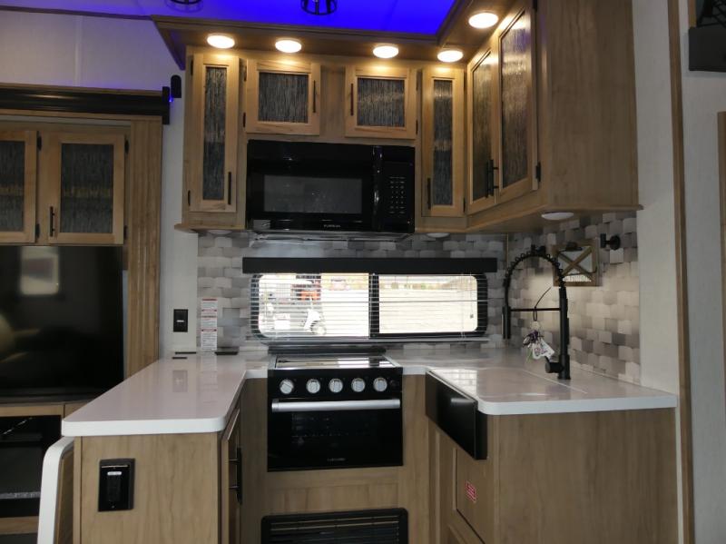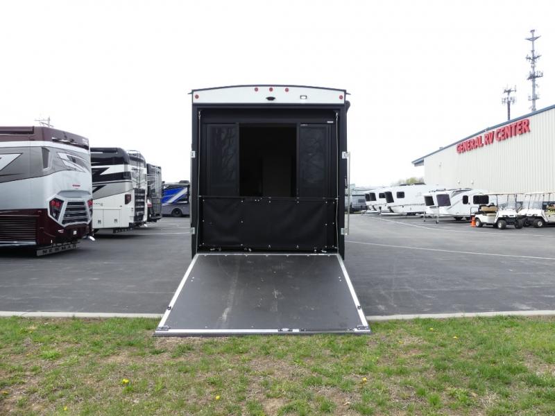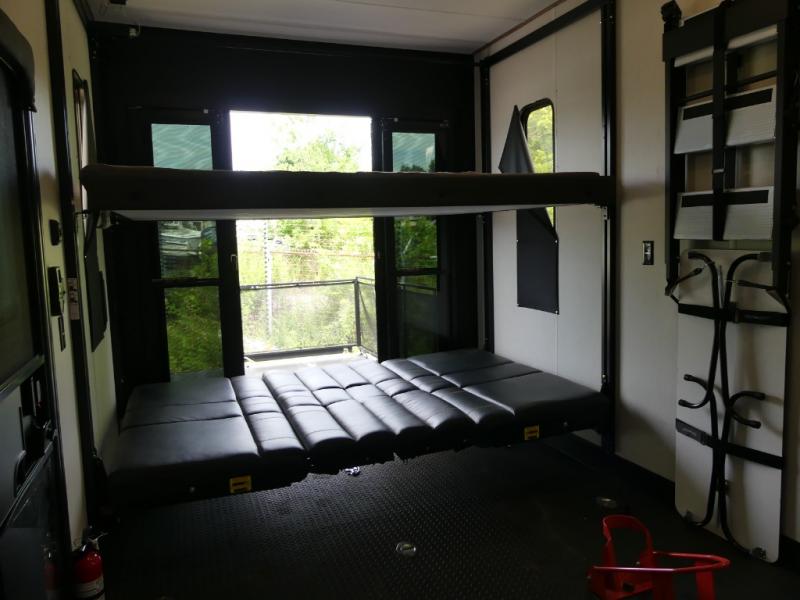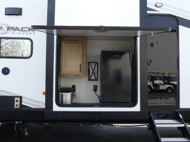 With any Cherokee Wolf Pack by Forest River, you will enjoy the most affordable and versatile toy hauler on the market! These fifth wheels and travel trailers feature an 8' 6" widebody design so you can bring along four-wheelers, kayak's, ATV's, golf carts, and gear galore! There is a forced air heated underbelly and enclosed holding tanks, plus a large 35,000 BTU forced air ducted furnace so you can camp all year around. Inside, you'll find zebra shades in the living room, real wood cabinet doors and drawers, LED lights, and a residential stainless steel farm sink. There is also a power awning with LED accent lighting, a large exterior folding grab handle, and an outside shower with hot and cold water to wash off your riding boots.