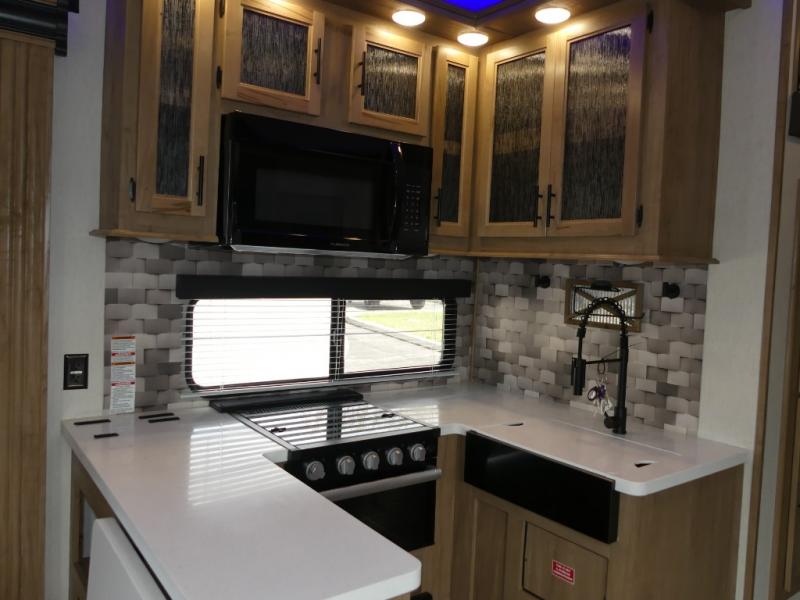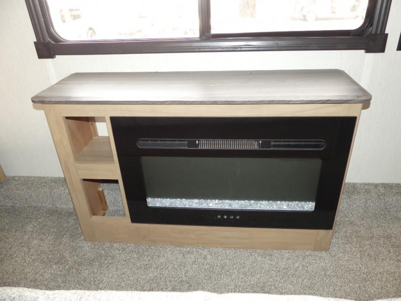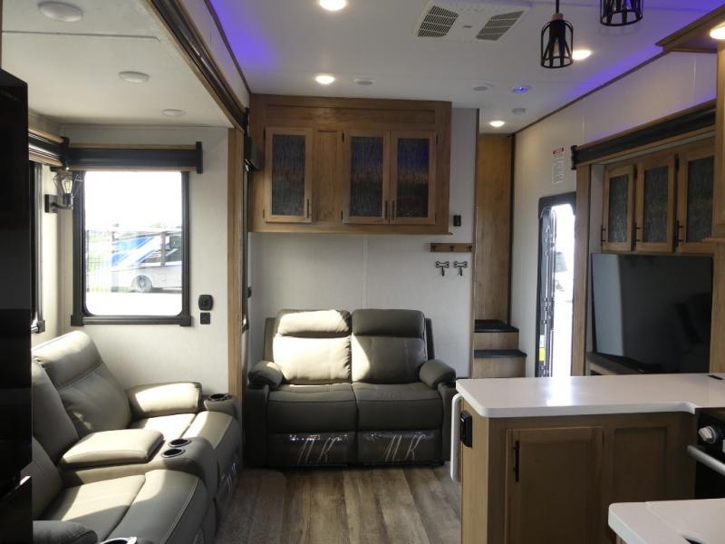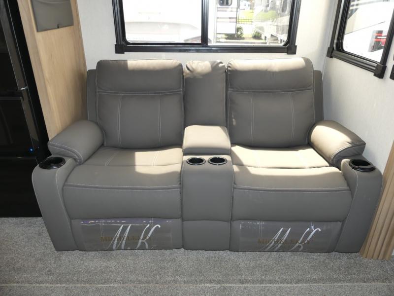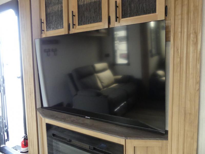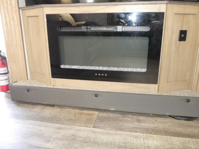 This fifth wheel is packed with features you don't want to pass up! The Diamond Package includes a three season garage wall, 6-point auto leveling, slam latch doors, and a TV in the living room for movie nights. You will also find aluminum sidewall construction, solid surface countertops in the kitchen, a 30" residential microwave, and more! The 14' separate garage will not only store your toys, but will double as your guests' bedroom since there is a Happijac power bed above a sofa/bed, a convenient half bath, plus a loft. Everyone can meet in the main living area/kitchen to relax on the theater seating or additional sofa, and the U-shaped kitchen will be a big plus with the chef of your group. There is a flip-up counter for more prep space, a pantry, plus an extra large 16 cu. ft. 12V refrigerator for perishables. And don't overlook the outside kitchen with a refrigerator and an ice maker! The front master suite will feel just like home with its queen bed slide out, full-length wardrobe, and bedroom fireplace!