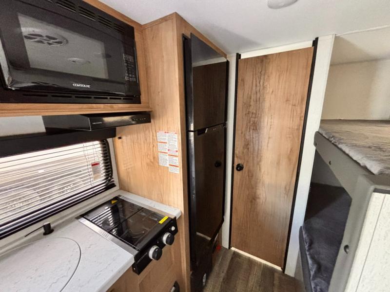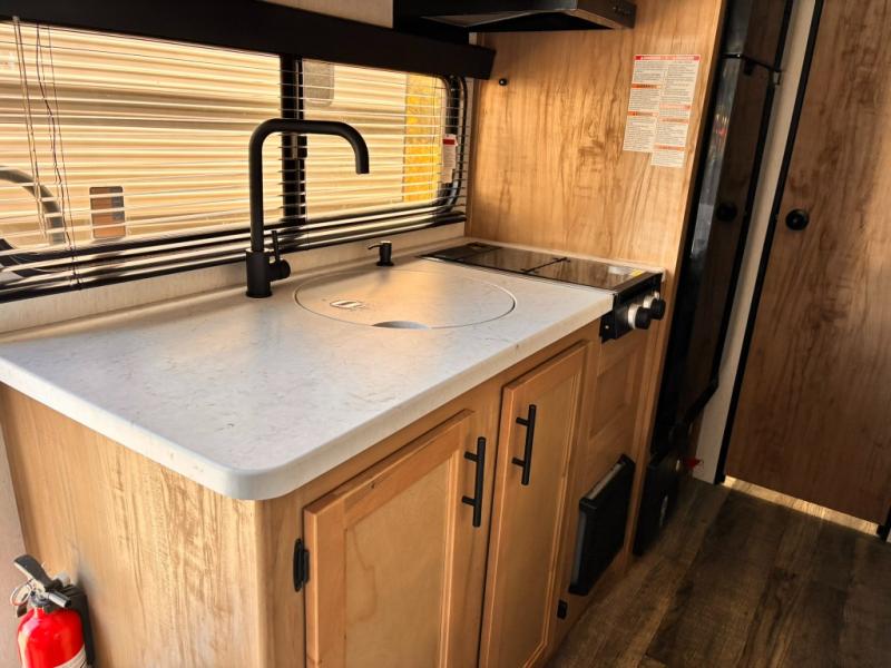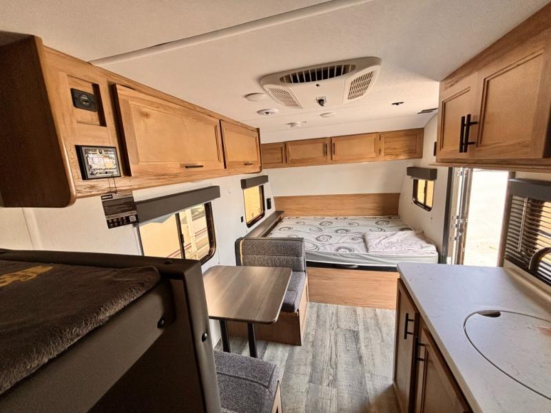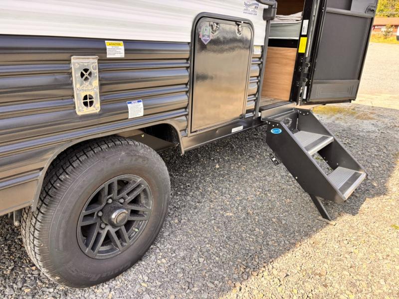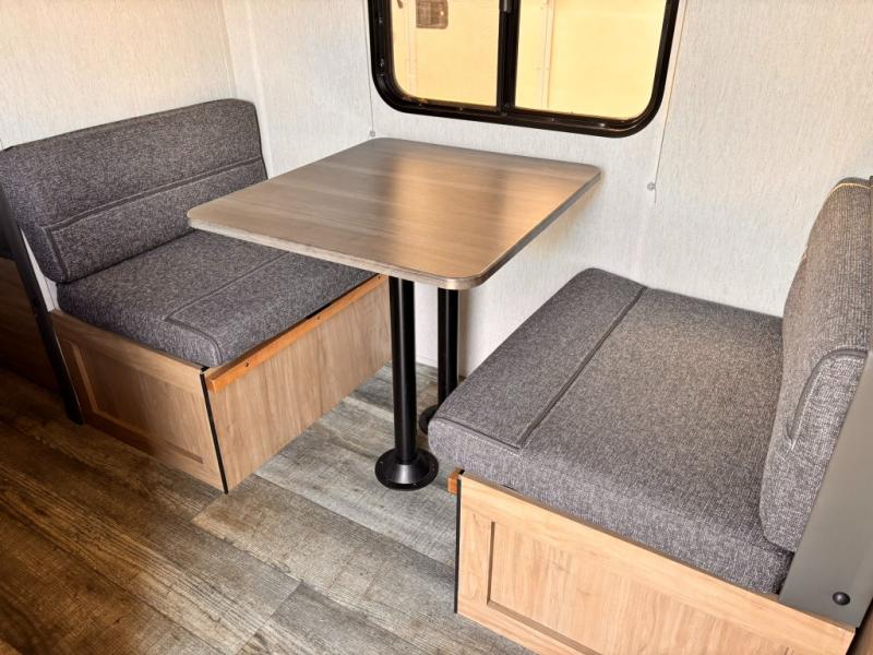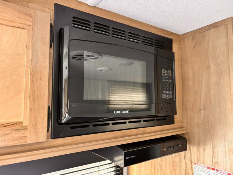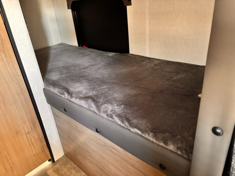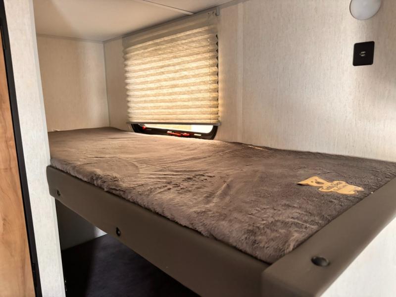 The whole family can sleep comfortably in this travel trailer! It has a set of bunk beds for the kids to sleep on with a TV mount location for extra entertainment, and you can sleep comfortably on the front queen bed with overhead cabinets and a shelf. There is even an exterior pack and play door that accesses the storage space under the bottom bunk. The chef will enjoy preparing their best home cooked meals either indoors with the high output cooktop or at the outside mini kitchen while staying protected by the 12' power awning, plus you have an outside TV mount location for added entertainment while you cook!