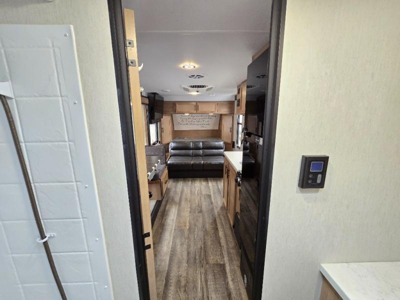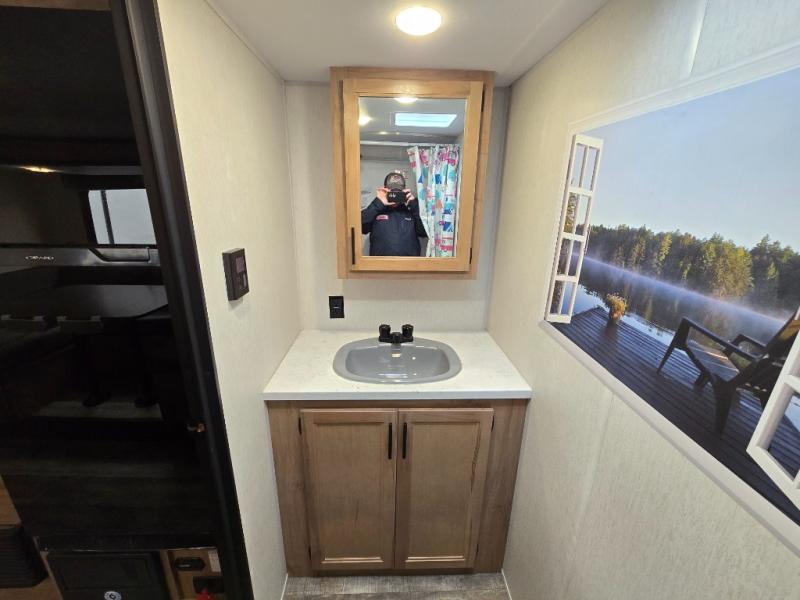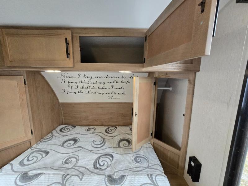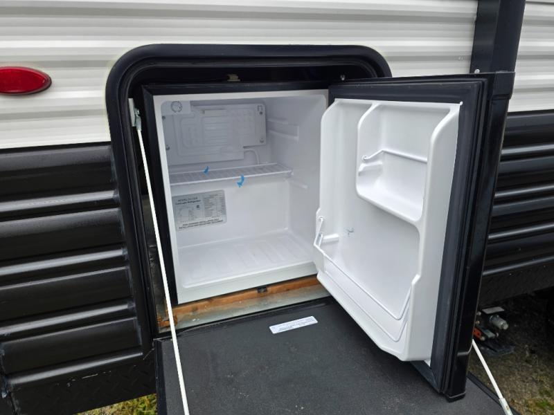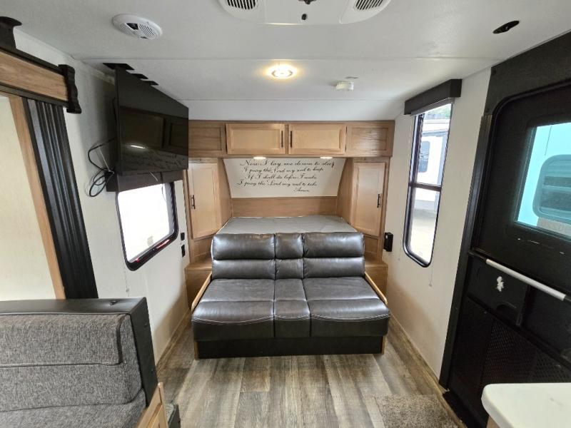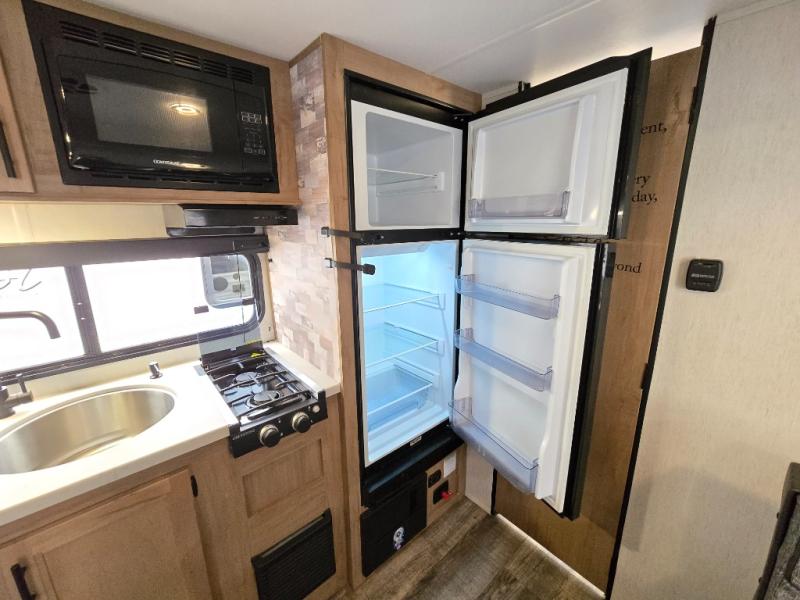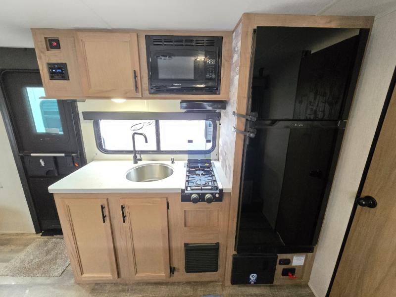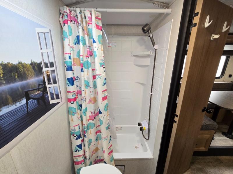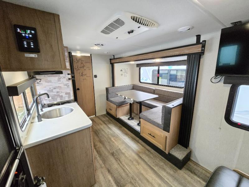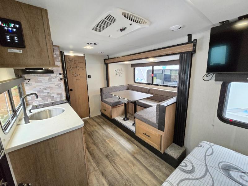 Perfect for a couple or family of four to enjoy. This Wolf Pup unit offers a versatile Cherokee Sleep System which allows you to convert a portion of your bed into a sofa for daytime use so you can have more seating when needed and not have the additional unit length that an added separate sofa would require. The U-shaped dinette offers plenty of seating for meals or games, and there are large storage drawers beneath for your things. This can also be converted into added sleeping space if needed at night. The kitchen provides a microwave oven, round single bowl sink with cover for added counter space, a range for cooking, and a 12 volt residential refrigerator to keep all of your perishables fresh. The rear bath features a tub/shower, toilet, and vanity with sink, plus medicine cabinet and skylight.