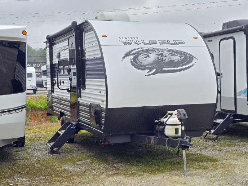 Each one of these Forest River Cherokee Wolf Pup travel trailers and toy haulers are lightweight and easy to tow! They are fully self contained with ample tank capacities, an abundance of storage space, and filled with at home amenities. The aerodynamic smooth radius front profile, the Power Gear frame technology, and the space saver rail design make them easier to maneuver. You will also appreciate the seamless roofing membrane with heat reflectivity to keep the sun from making your unit a hot box. The tongue and groove plywood flooring will hold up for years of fun and the USB charging stations help to keep your electronics at 100% while you're away. Come find the best model for you today!
