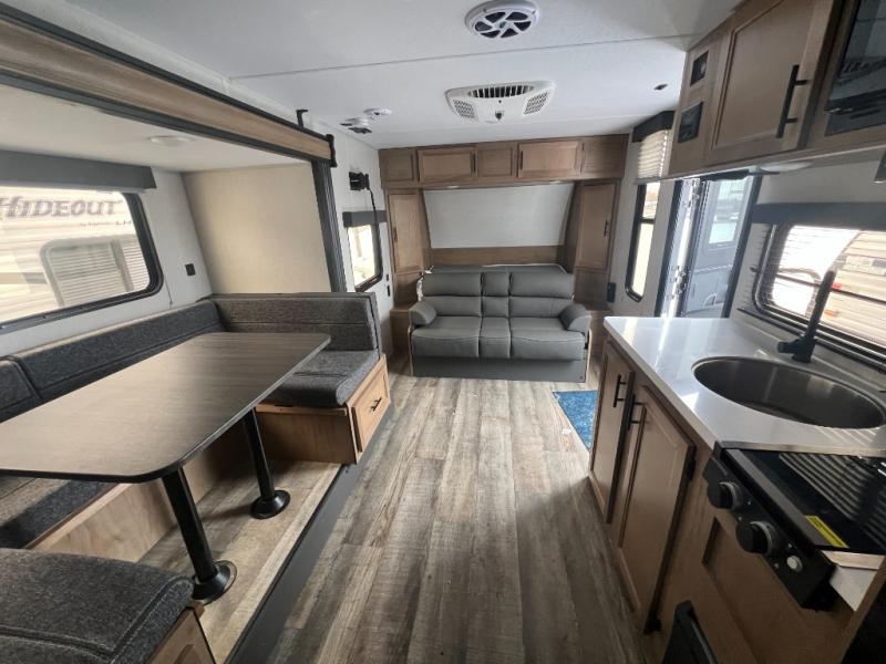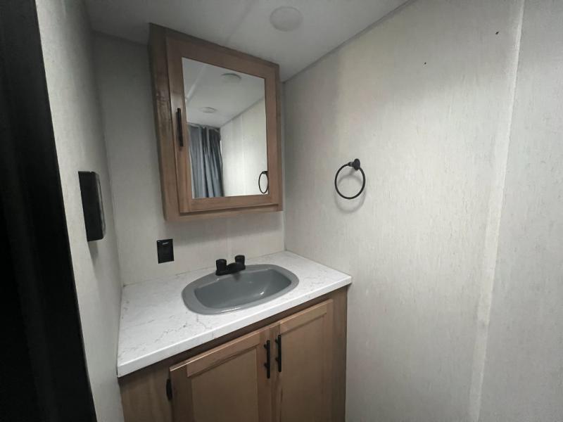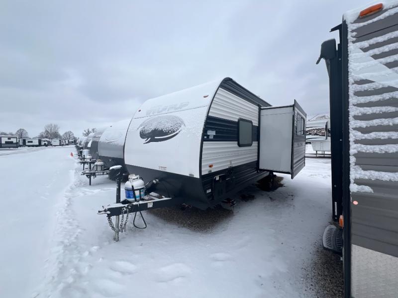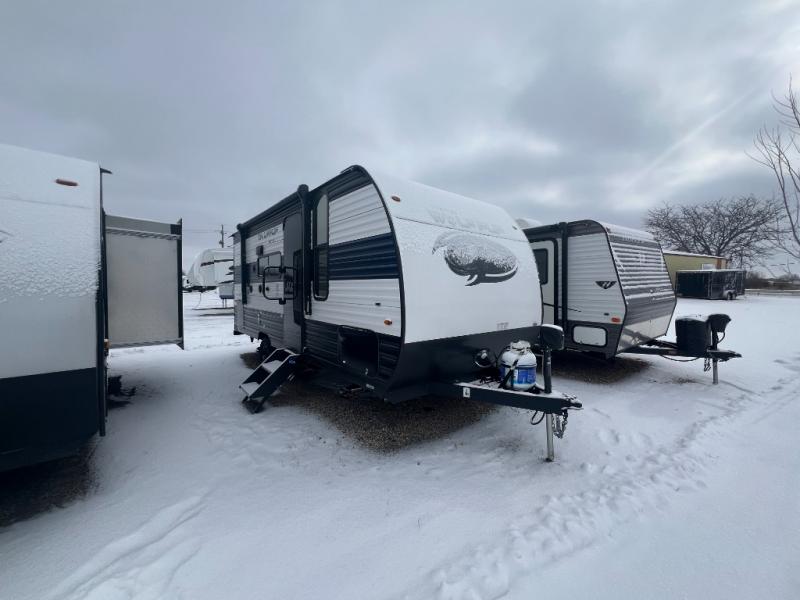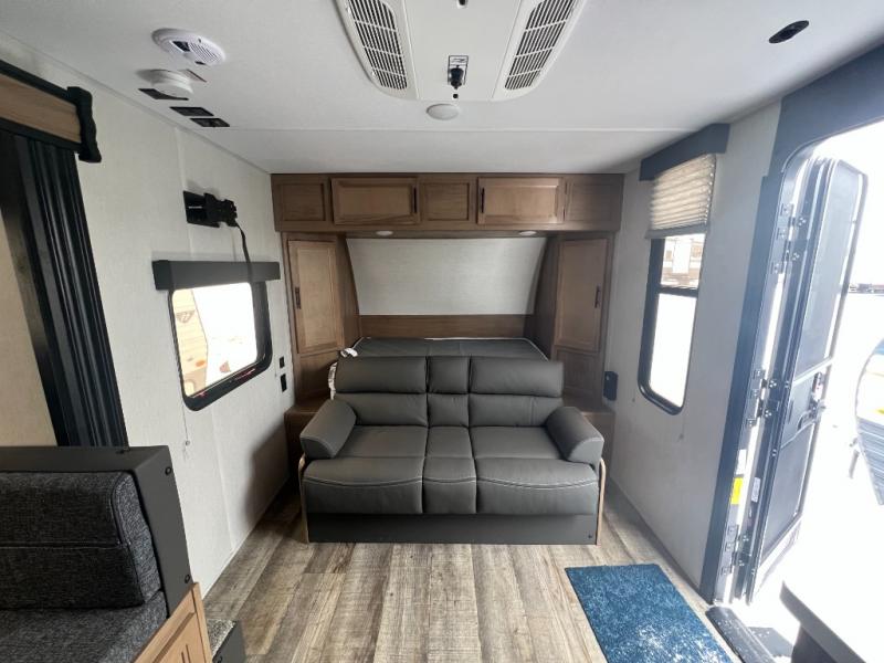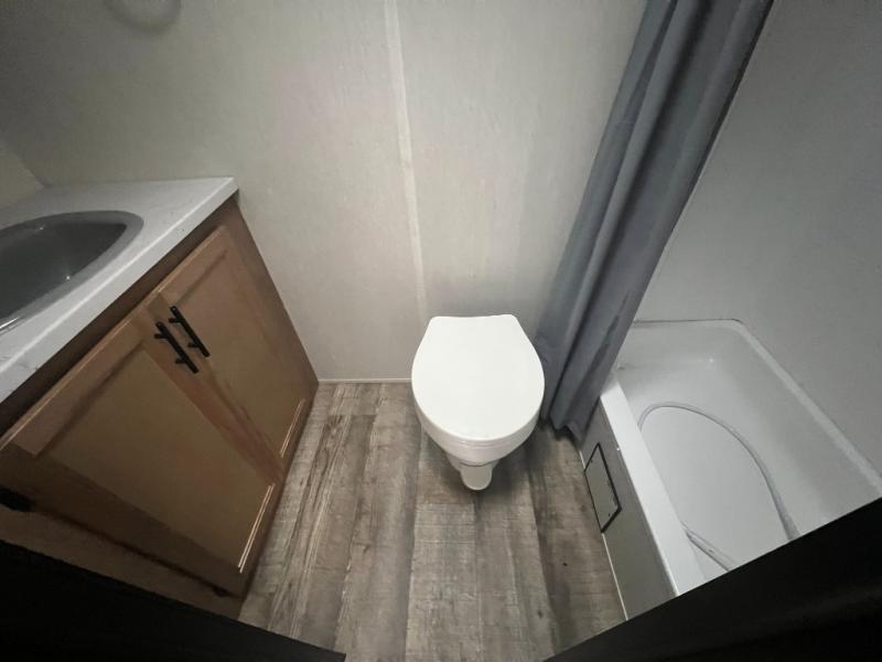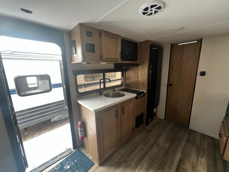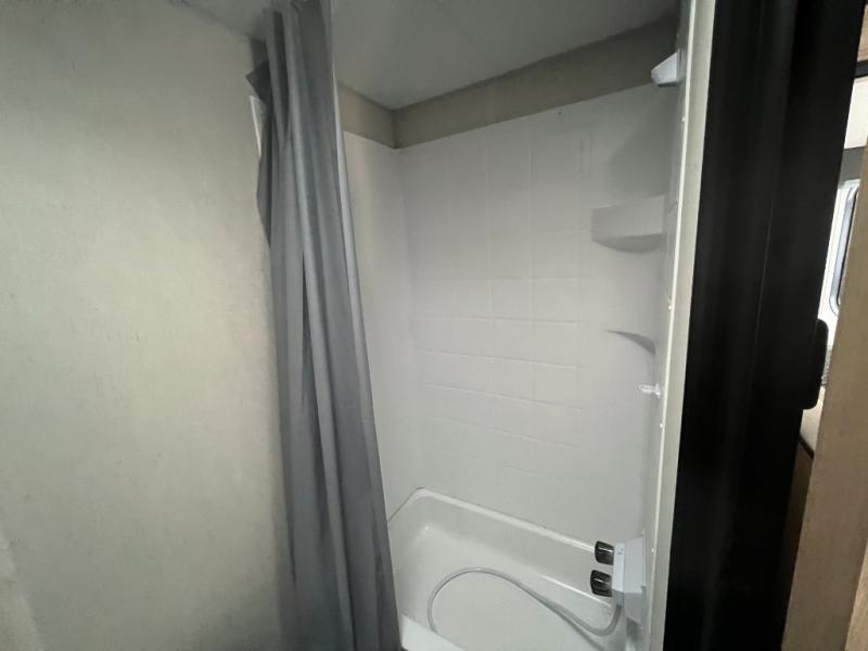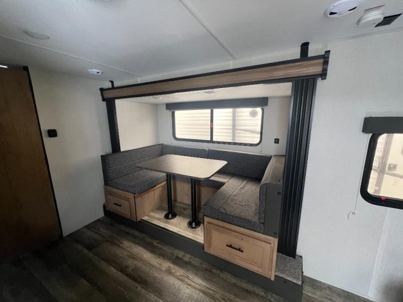 Perfect for a couple or family of four to enjoy. This Wolf Pup unit offers a versatile Cherokee Sleep System which allows you to convert a portion of your bed into a sofa for daytime use so you can have more seating when needed and not have the additional unit length that an added separate sofa would require. The U-shaped dinette offers plenty of seating for meals or games, and there are large storage drawers beneath for your things. This can also be converted into added sleeping space if needed at night. The kitchen provides a microwave oven, round single bowl sink with cover for added counter space, a range for cooking, and a 12 volt residential refrigerator to keep all of your perishables fresh. The rear bath features a tub/shower, toilet, and vanity with sink, plus medicine cabinet and skylight.