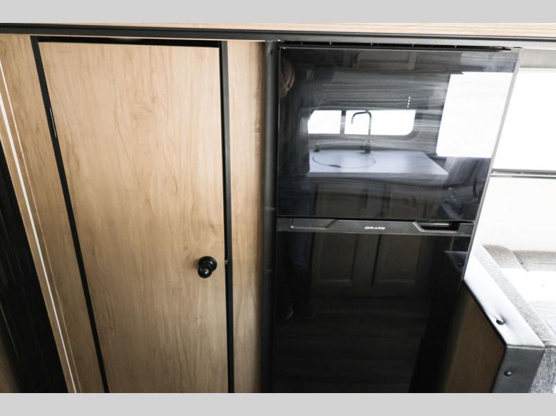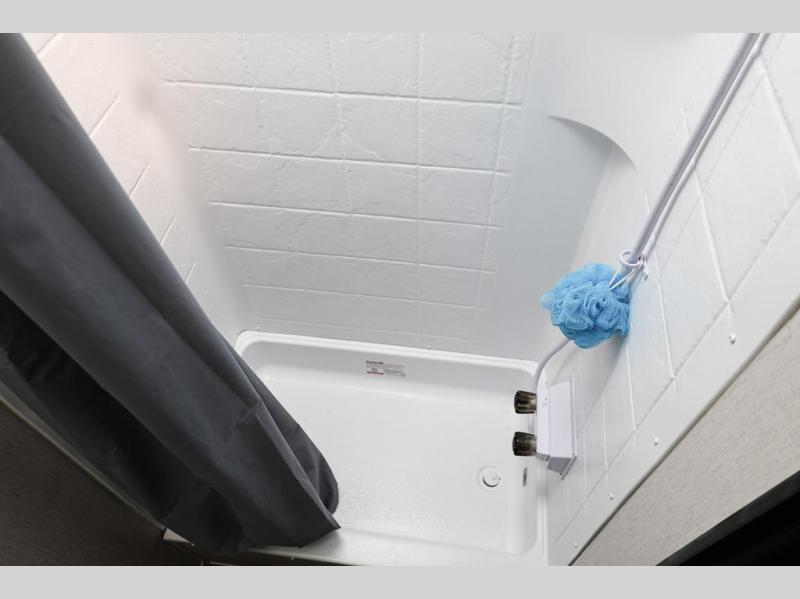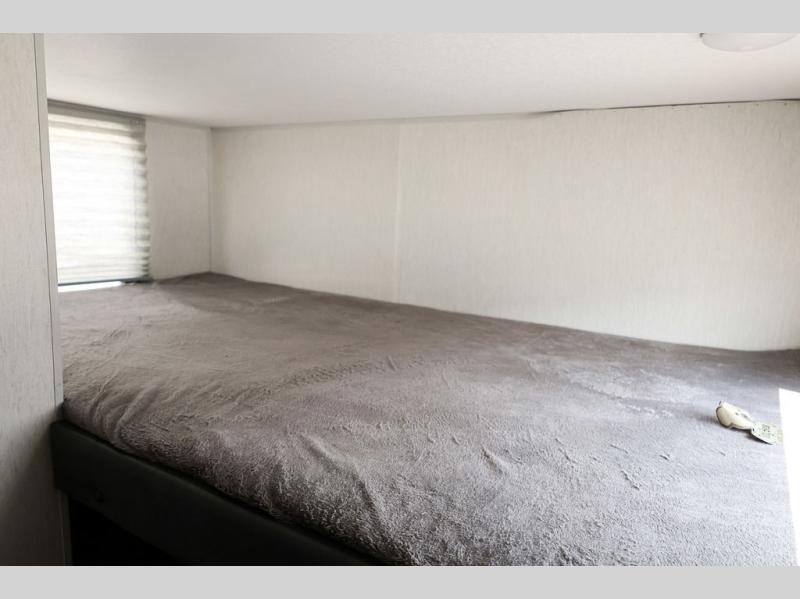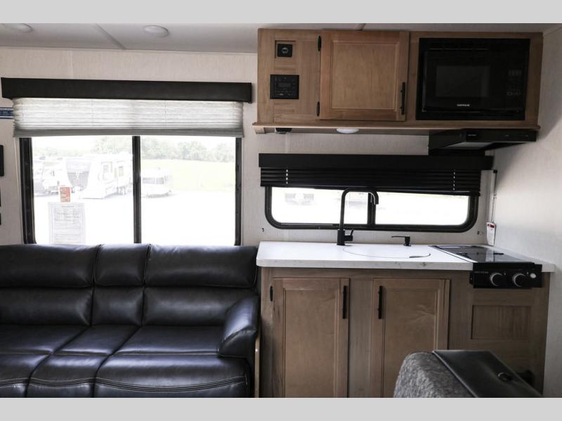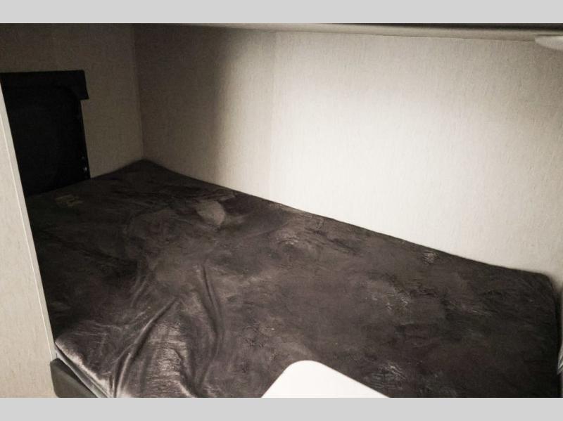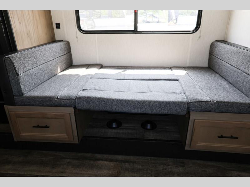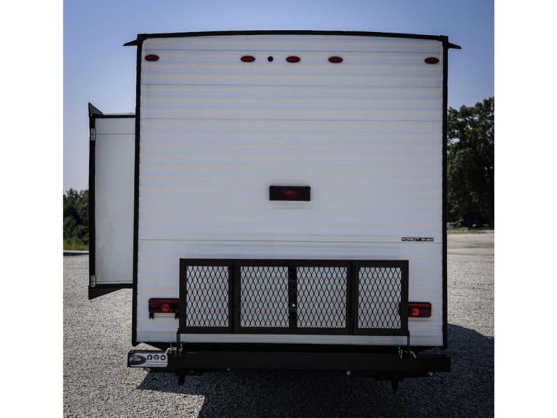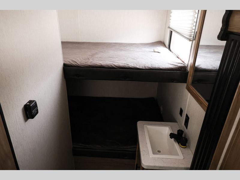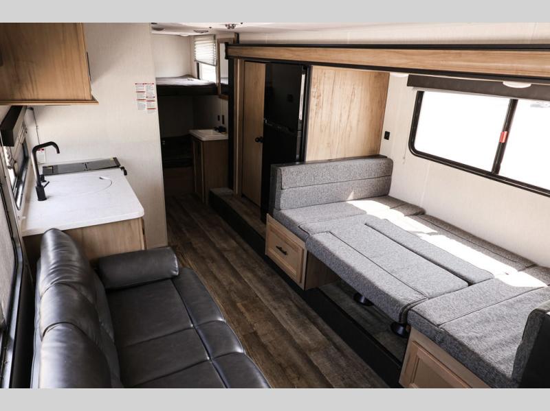 Sleeping for nine or ten is made easy in this Wolf Pup model with large bunks in the rear of the unit, a queen bed up front in the private bedroom with dual sliding entry doors, as well as when using the furniture once converted. The u-shaped dinette allows you to dine comfortably for meals, play games when indoors hanging out, and even use as a bed for two. There are large storage drawers beneath both side seats to store games, extra pots and pans, or whatever you need. The sofa opposite also flips into a convenient bed when needed. Storage is in abundance in this Wolf Pup model with a large storage door that can be accessed inside by flipping up the bunks or from the outside storage plus door. More outside storage can be found up front, and on the inside you will find a large pantry, overhead cabinets, plus wardrobes in the front bedroom for your clothing. The tub/shower has an overhead skylight to let in natural light, provide a bit more head room, and give you a glimpse of your day when you wake. You will also enjoy great views through the large panoramic windows above the dinette and sofa.