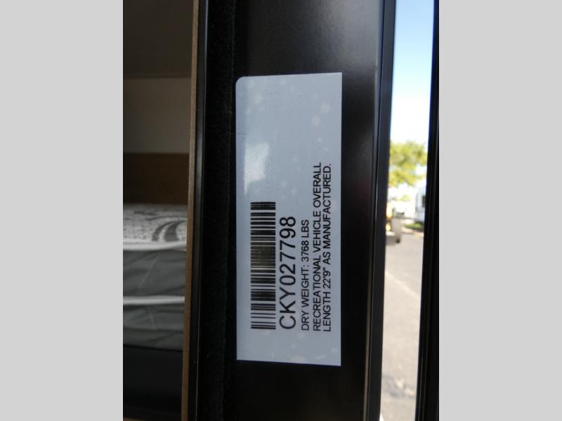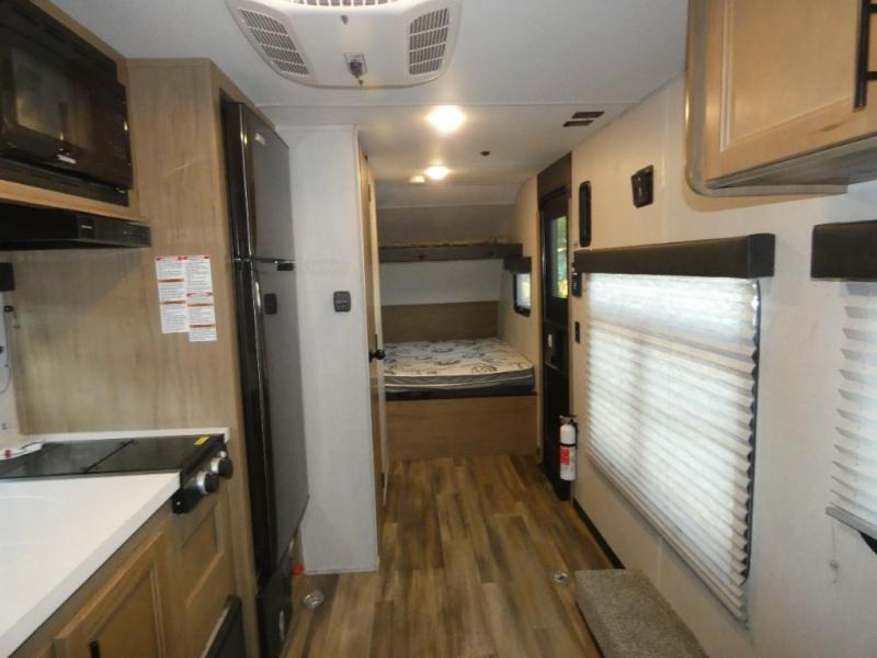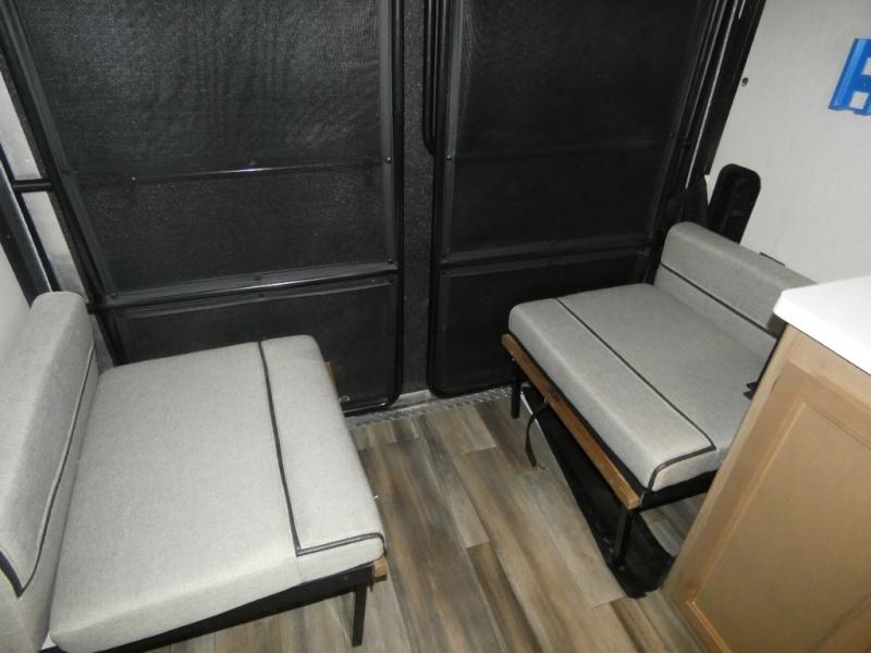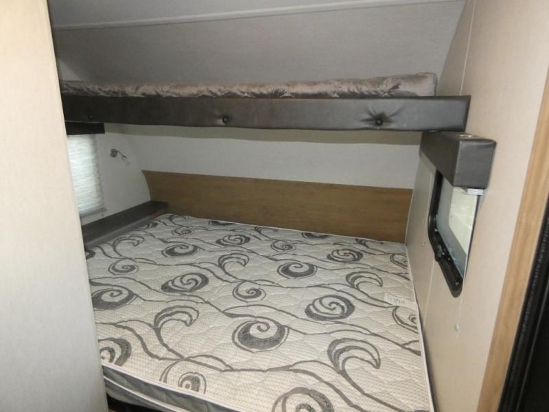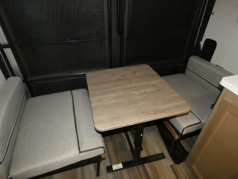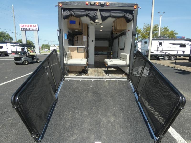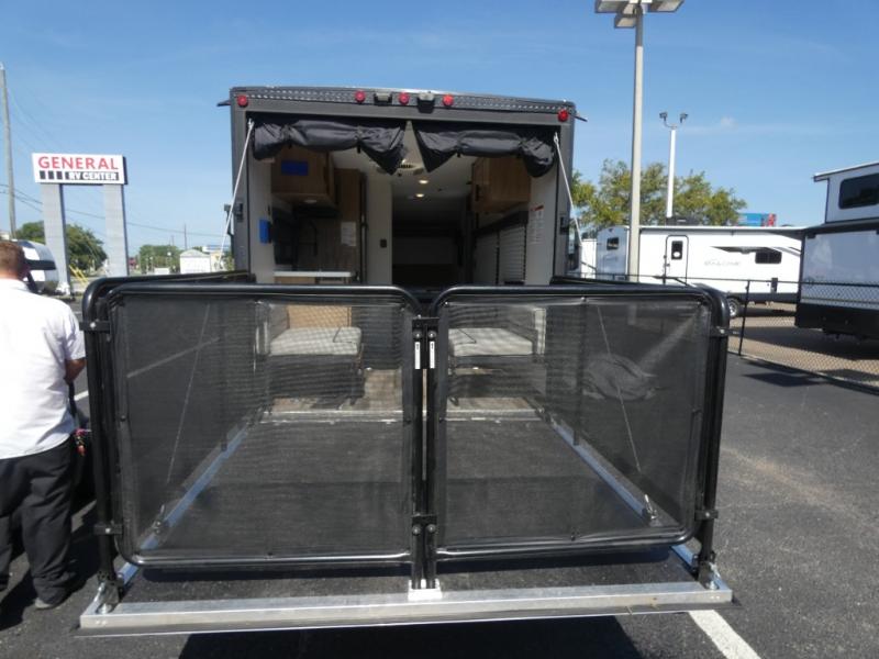 Load up your favorite off-road toys with the ramp door into the 9' 4" garage with 13' 11" total cargo space when you utilize the space up front! Enjoy all of the at home features like a fully equipped kitchen with a high output cooktop, a 12V high efficiency refrigerator, and a high output microwave. Comfortably eat your delicious meals at the rear dinette with a removable table for convenience. The full bathroom has a tub/shower for you to freshen up in the morning after getting a good night's rest on the front queen bed which also has a bunk bed above it too. There is also outside storage and an outside shower with hot and cold water!